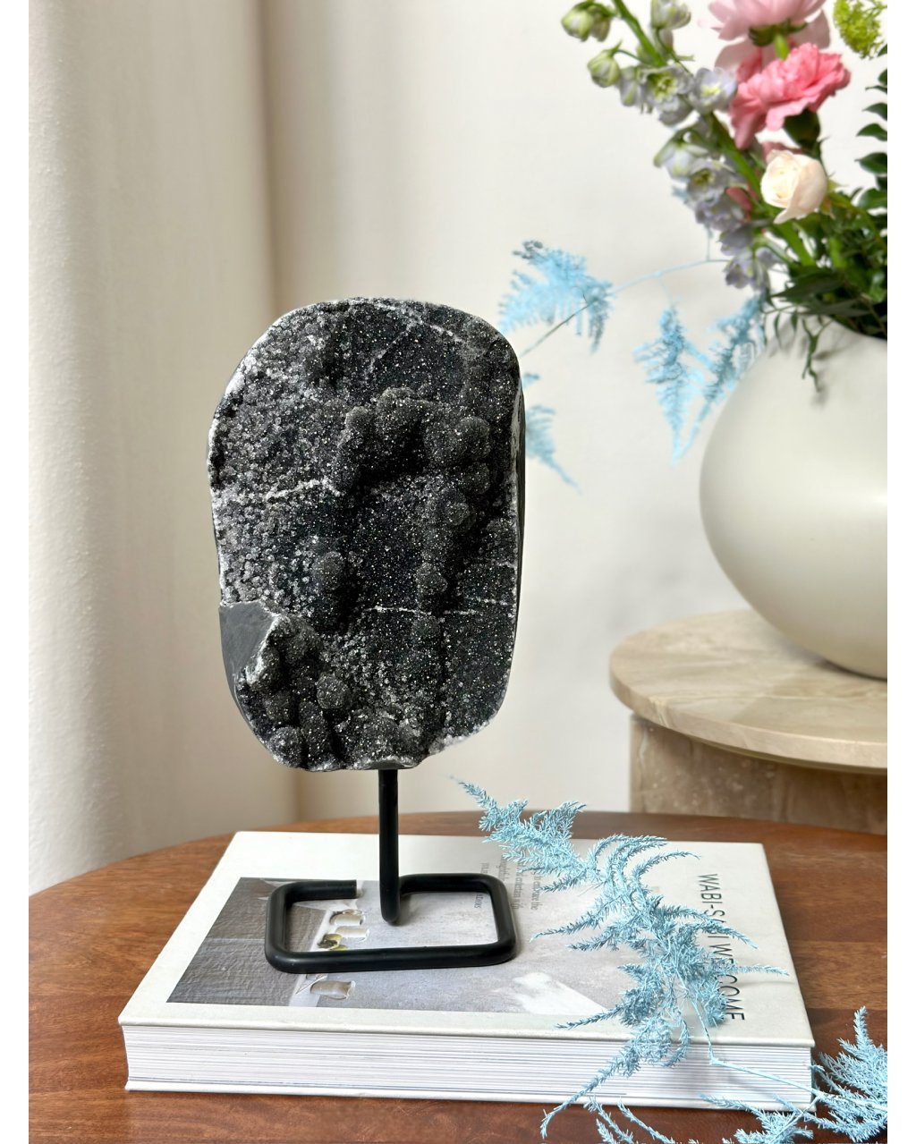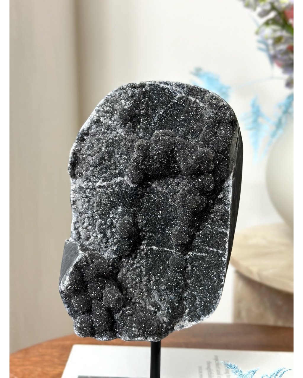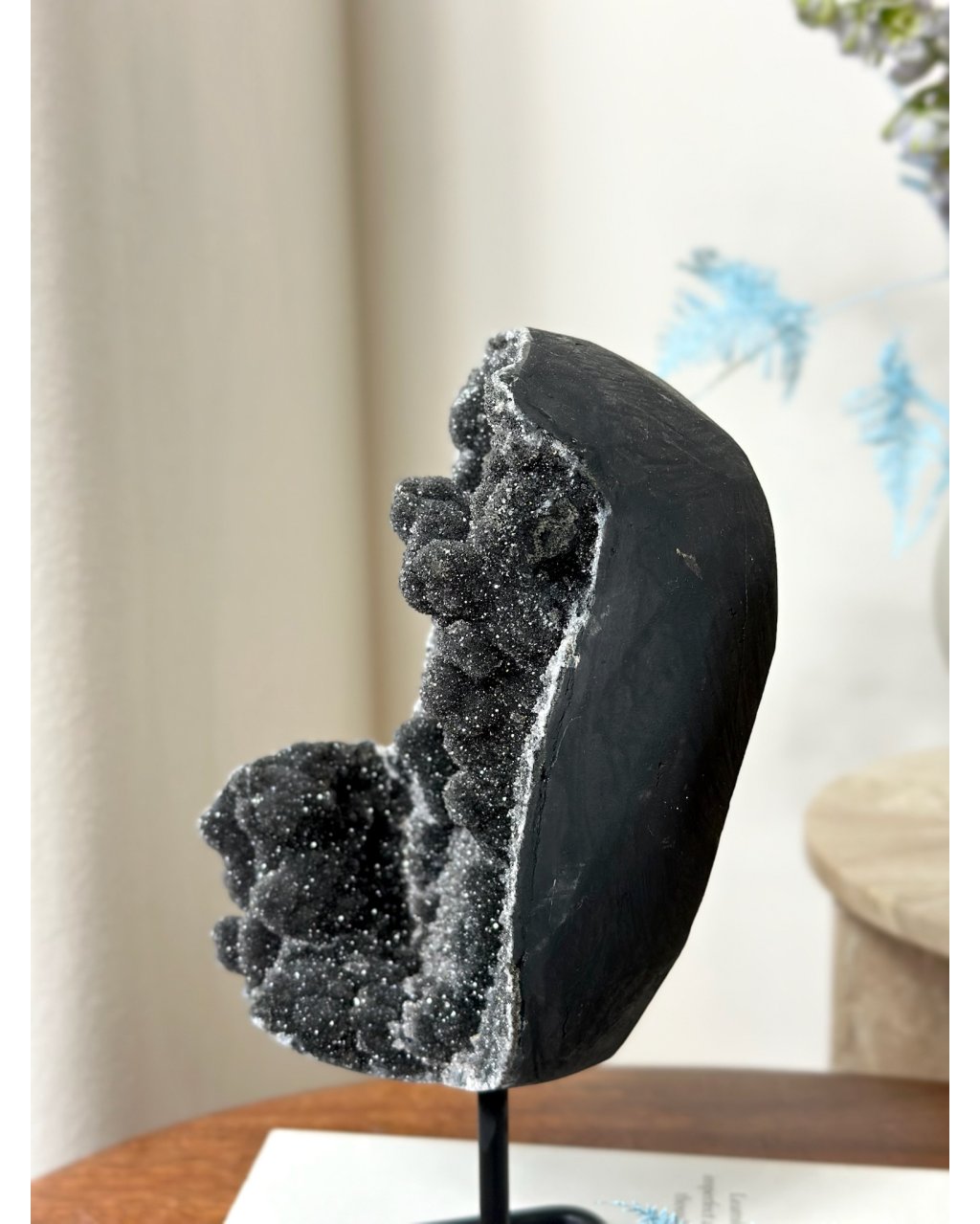 V podobě drúzy působí černý ametyst velmi komplexně a plošně. Čistí a harmonizuje prostor, vytváří ochranné energetické pole a podporuje hlubší regeneraci na úrovni duše. Je ideální pro meditační místnosti, ložnice, terapeutické prostory i místa, kde je potřeba klid, ochrana a ukotvení.