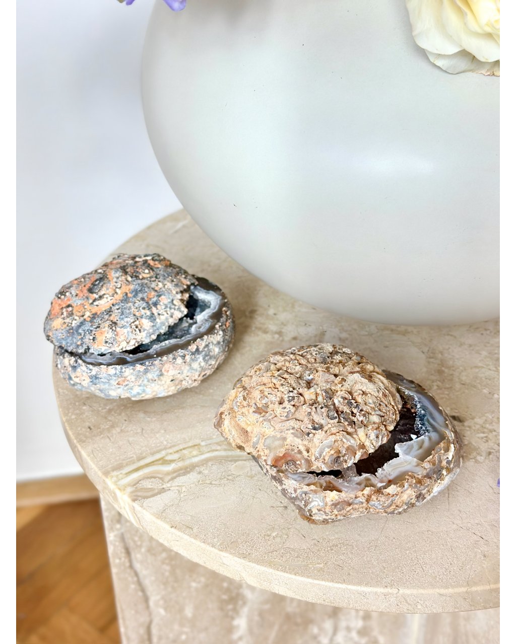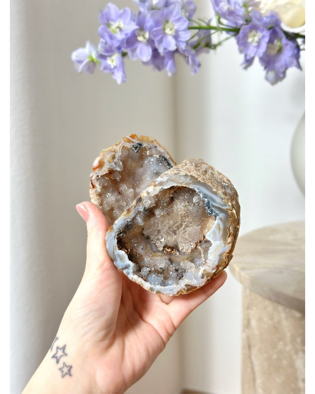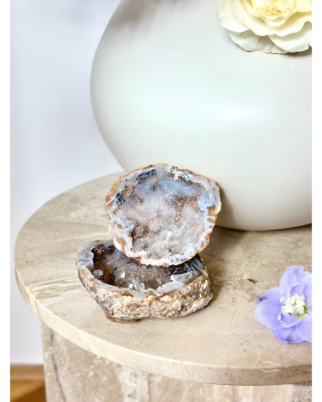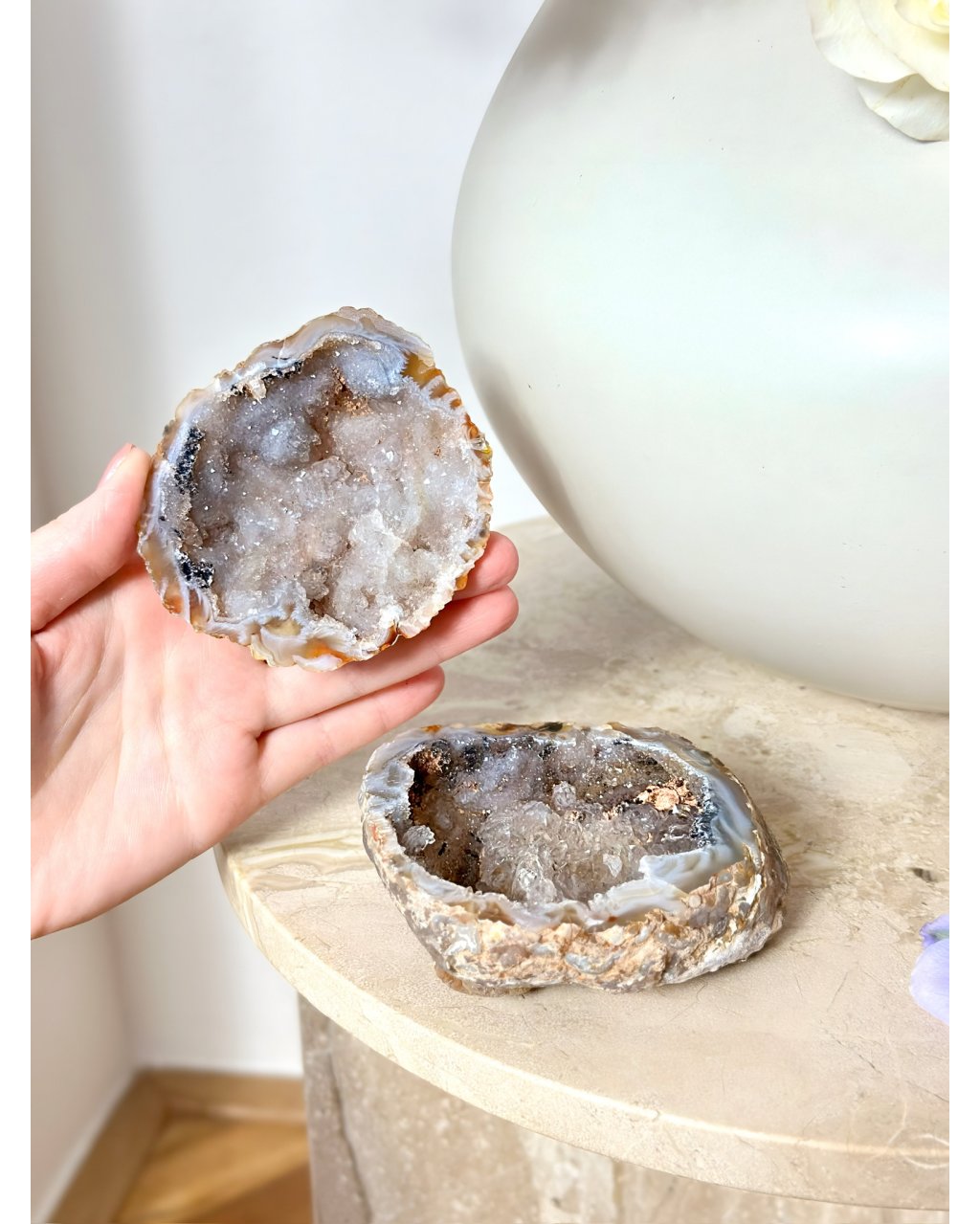 Achátová geoda s nádherným vnitřním světem je jako otevřená brána do magického vesmíru, kde se čas zpomaluje a energie jemně pulzuje v rytmu Země. Na první pohled působí jako přírodní šperk, uvnitř však skrývá třpytivý krystalický prostor, který připomíná kosmickou svatyni plnou světla, klidu a ochrany. Tato geoda z achátu může sloužit jako originální pokladnička na vaše vzácné drobnosti, šperky nebo osobní talismany, které chcete uchovat v bezpečné a harmonické energii.