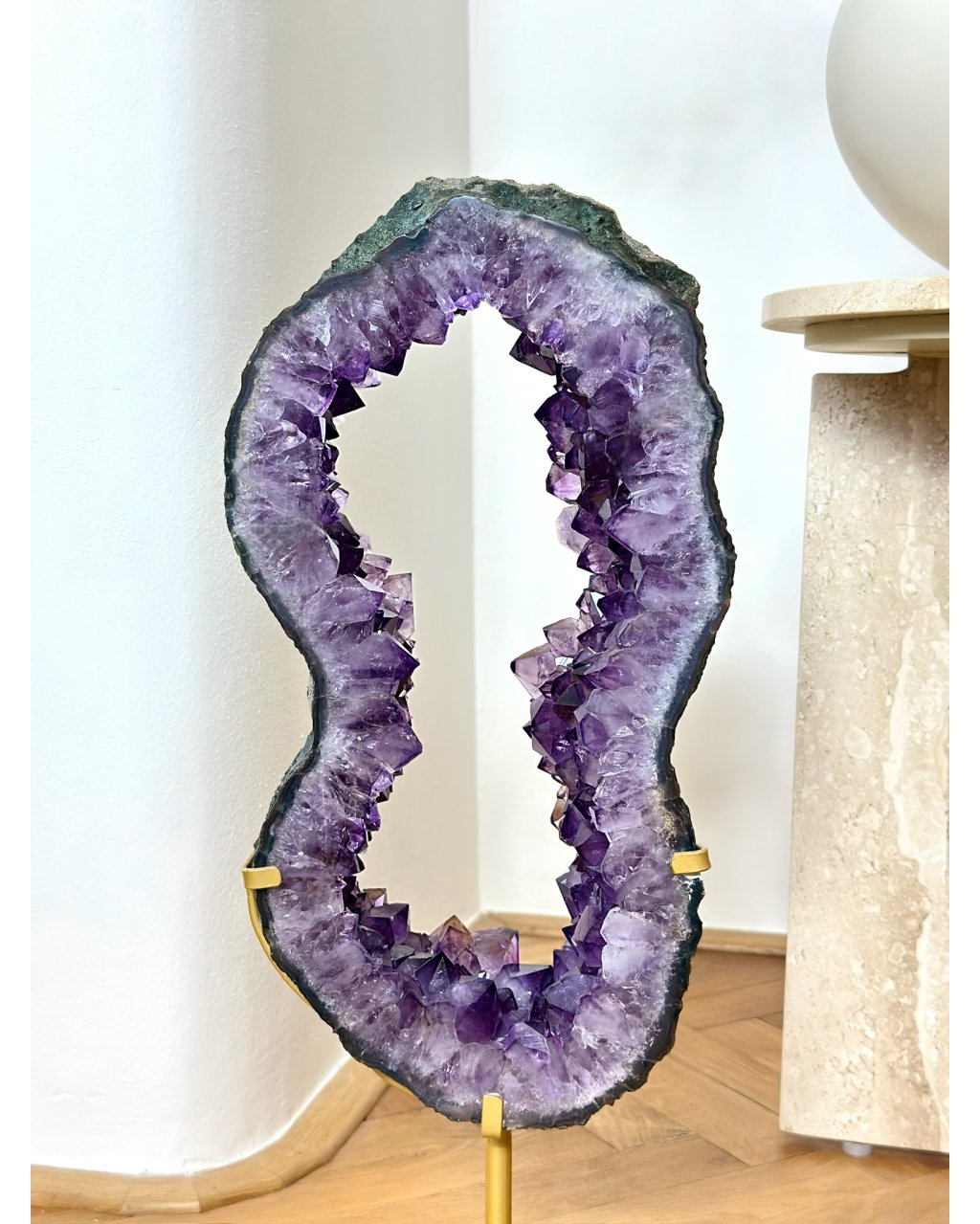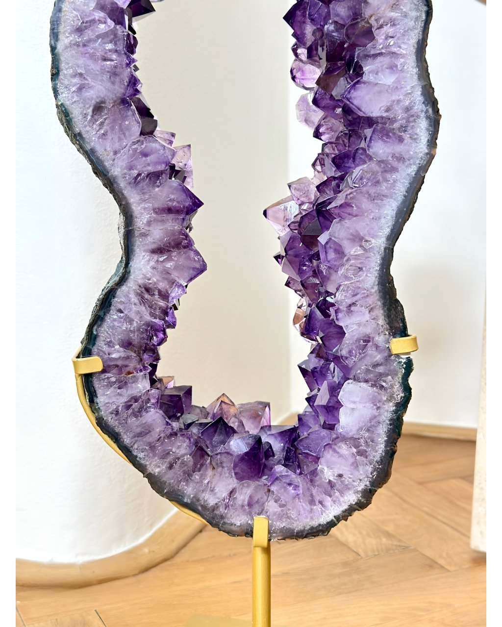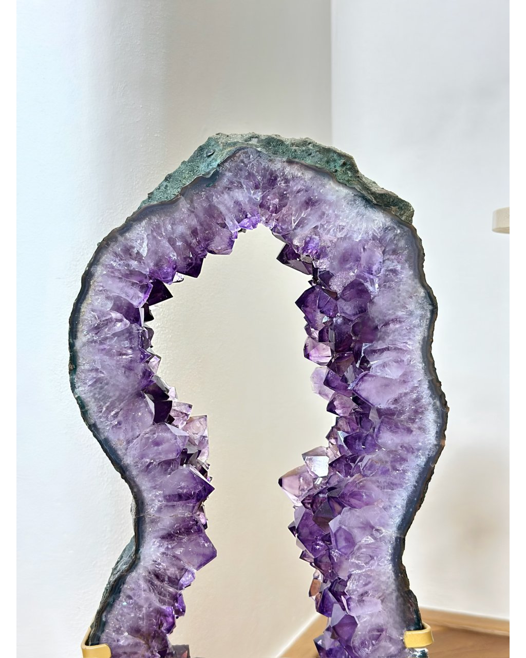 Velký ametystový portál ve tvaru osmičky je jedinečným dílem, které v sobě spojuje krásu krystalu, posvátnou geometrii a živoucí energii proudění. Na otočném stojanu působí jako vír, který se jemně roztáčí do celého prostoru a proměňuje jej v chrám klidu, očisty a vědomého spočinutí.