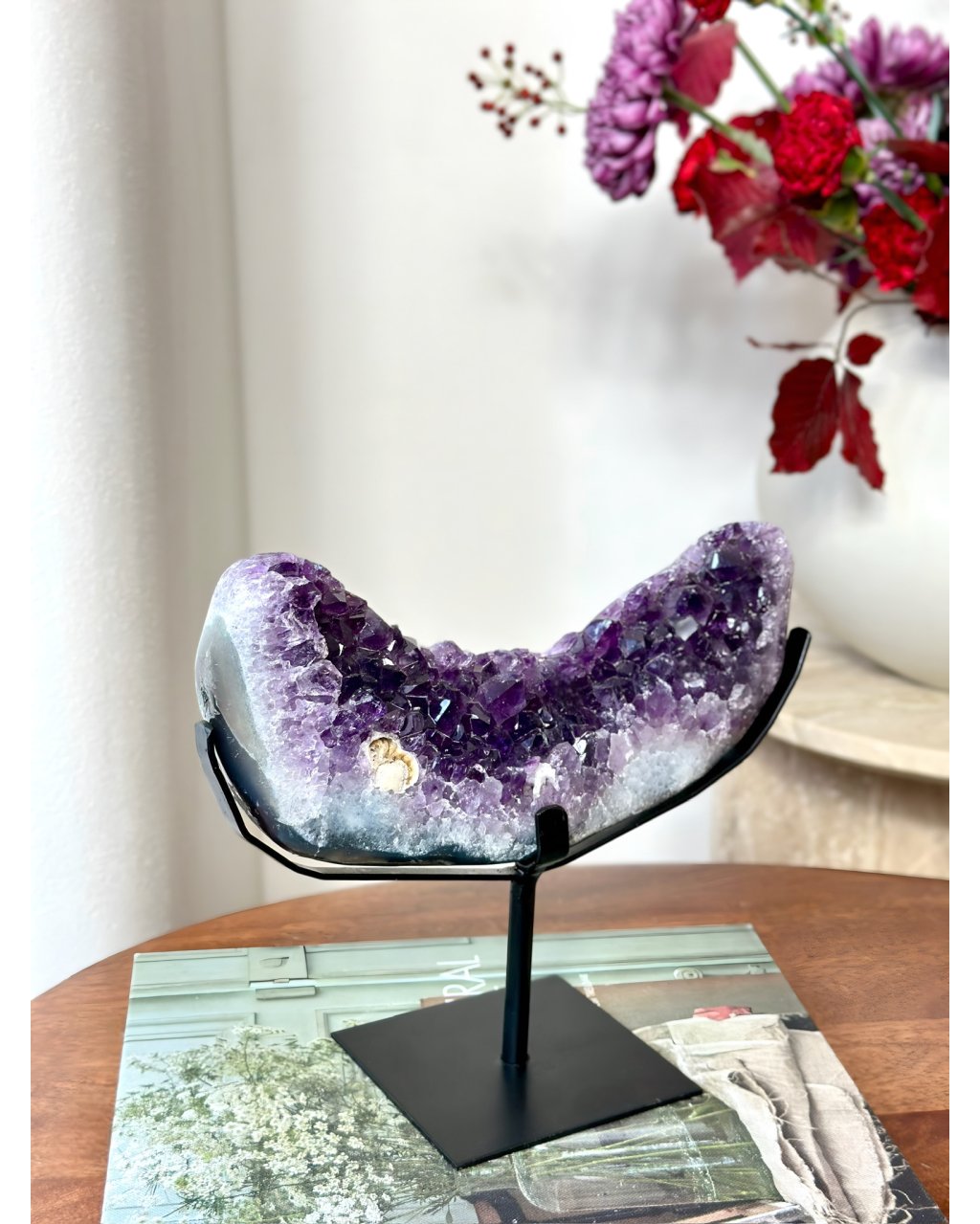Umístěn na elegantním podstavci, působí tento ametyst jako trůn pro světlo. V interiéru se stává nejen magnetem pozornosti, ale i energetickým centrem, které čistí auru prostoru, zklidňuje mysl a prohlubuje meditaci.