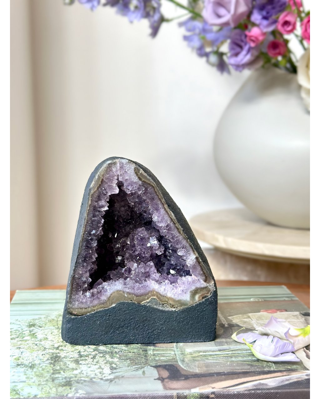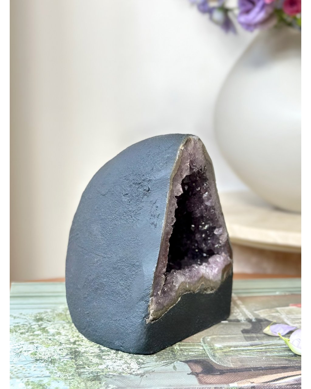 Tato ametystová katedrála zároveň funguje jako přirozená energetická nabíječka krystalů a šperků. Stačí do její blízkosti uložit kameny nebo šperky a nechat je spočinout v jejím poli. Ametyst jemně, ale důsledně čistí cizí otisky, znovu ladí jejich vibraci a vrací jim původní sílu bez nutnosti zásahu. Je ideální pro pravidelné energetické obnovení minerálů, které s tebou pracují každý den.