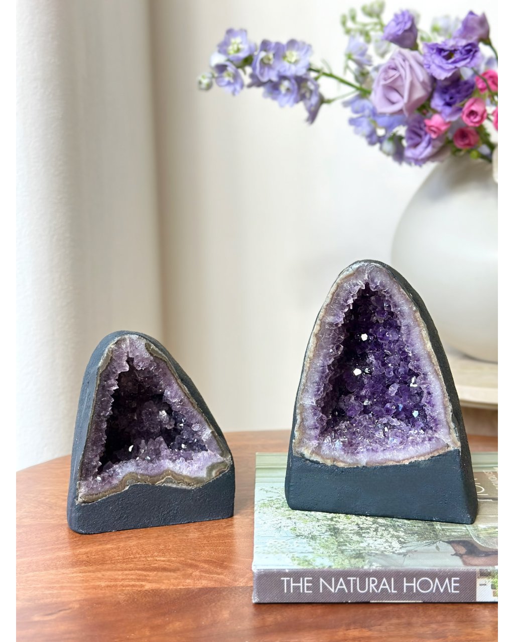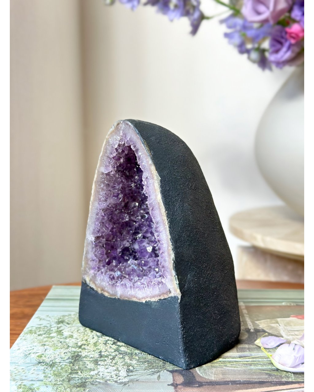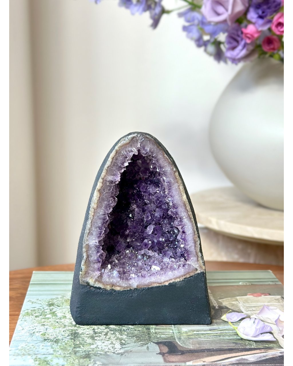 Tato ametystová katedrála zároveň funguje jako přirozená energetická nabíječka krystalů a šperků. Stačí do její blízkosti uložit kameny nebo šperky a nechat je spočinout v jejím poli. Ametyst jemně, ale důsledně čistí cizí otisky, znovu ladí jejich vibraci a vrací jim původní sílu bez nutnosti zásahu. Je ideální pro pravidelné energetické obnovení minerálů, které s tebou pracují každý den.