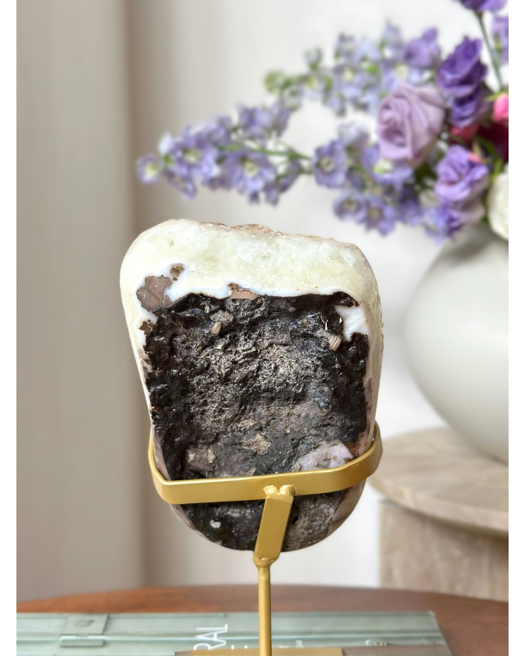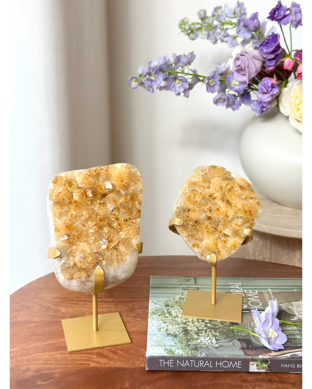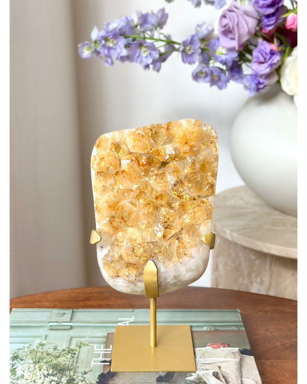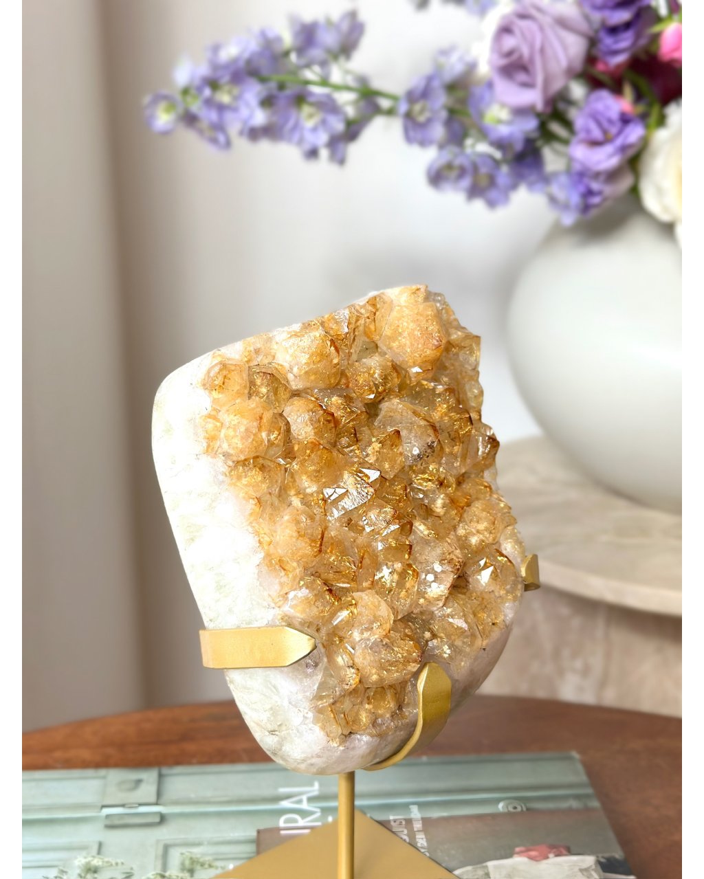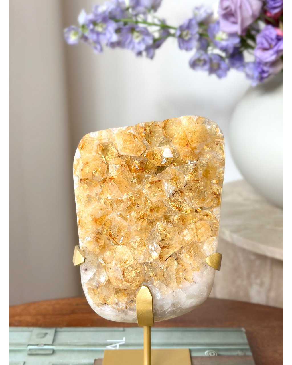 Druza přepáleného ametystu na podstavci působí jako zachycený záblesk sluneční energie, který se rozlil do stovek drobných krystalových špiček. Její povrch se při každém pohybu světla rozehrává do teplých zlatavých tónů a vytváří hypnotický třpyt, jenž okamžitě oživuje prostor. Tento kámen nepůsobí tiše a skrytě, ale otevřeně září, jako by v sobě nesl paměť ohně, transformace a vnitřního probuzení.