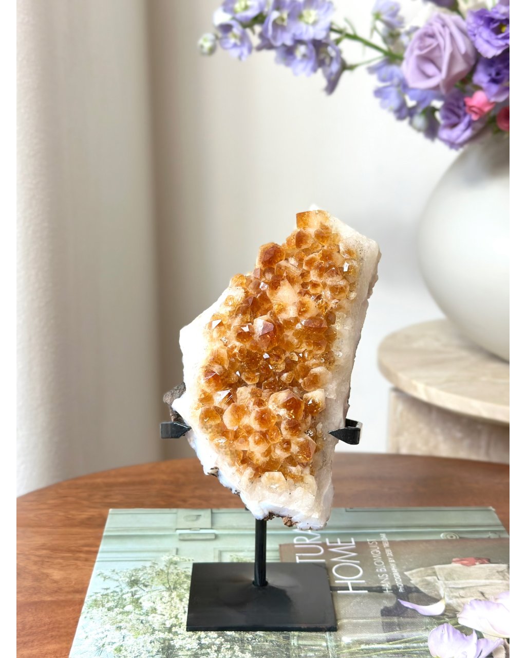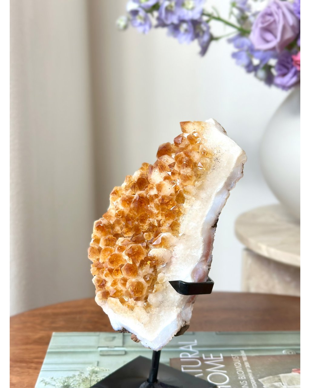 Tento přepálený citrín na podstavci je jako zkamenělé slunce - surový, silný a nepřehlédnutelný. Krystaly vyrůstají s přirozenou jistotou, každý hrot zachycuje světlo jiným směrem a celek působí jako zdroj vnitřního žáru. Přepálený ametyst, který se proměnil v citrín, v sobě nese energii transformace, příběh změny, kdy tlak a žár daly vzniknout nové síle.