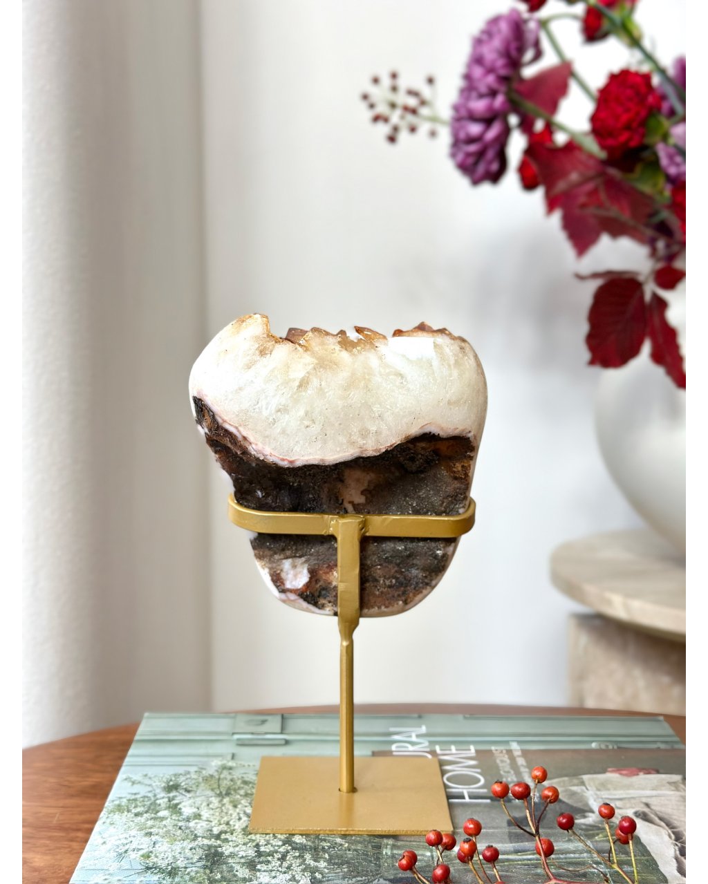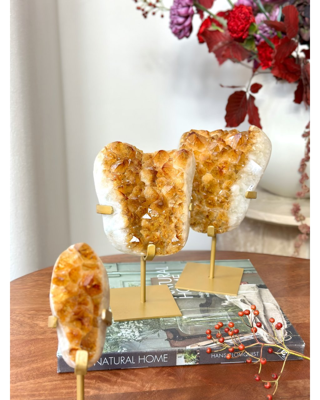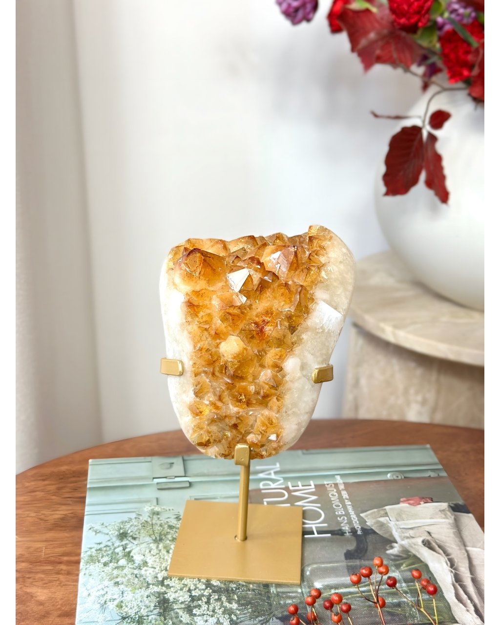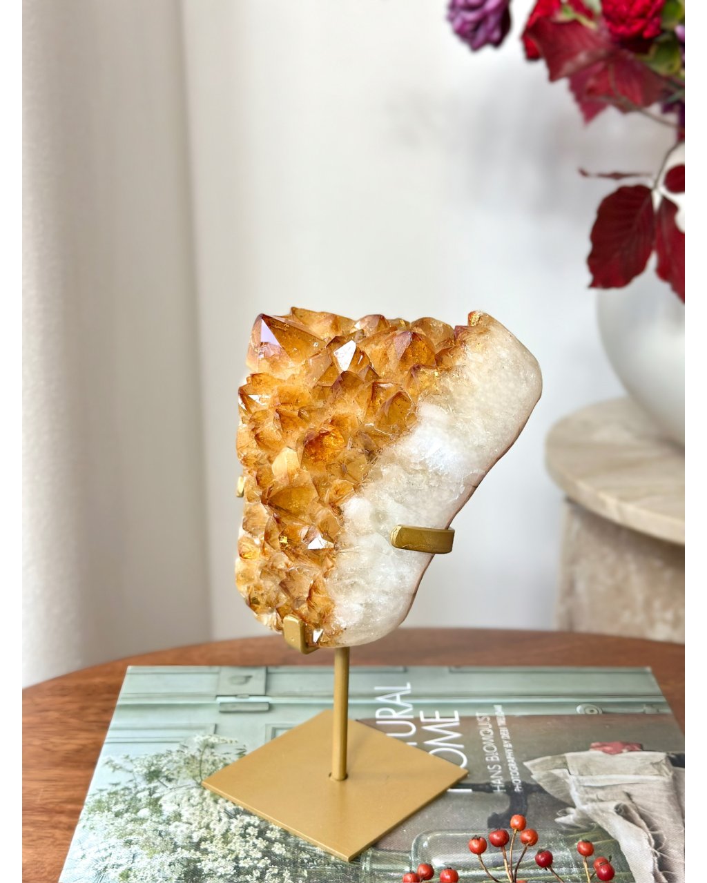 Přepálený citrín, často nazývaný „sluneční duše kamene“, nese v sobě intenzivní vibrace světla. Jeho teplé zlaté tóny aktivují solar plexus, otevírají cestu k sebevyjádření, sebevědomí a osobní magnetické síle. Květy, jemně vrostlá nebo přirozeně vyklíčená forma v kameni, symbolizují rozkvět a nové začátky - připomínku, že každý okamžik života je příležitostí k vlastnímu rozkvětu.