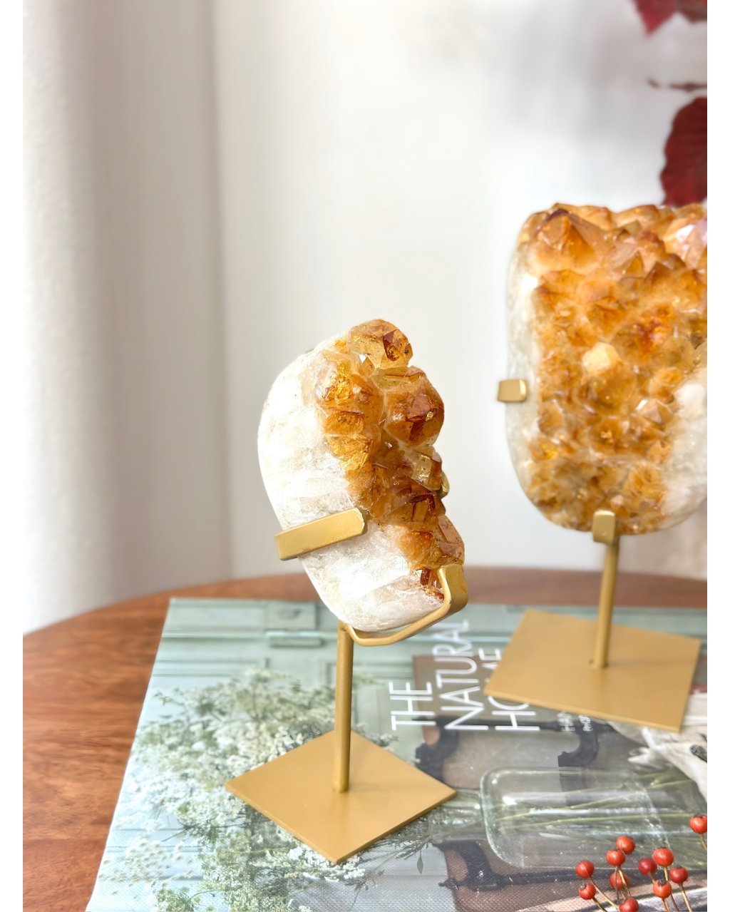Přepálený citrín, často nazývaný „sluneční duše kamene“, nese v sobě intenzivní vibrace světla. Jeho teplé zlaté tóny aktivují solar plexus, otevírají cestu k sebevyjádření, sebevědomí a osobní magnetické síle. Květy, jemně vrostlá nebo přirozeně vyklíčená forma v kameni, symbolizují rozkvět a nové začátky - připomínku, že každý okamžik života je příležitostí k vlastnímu rozkvětu.