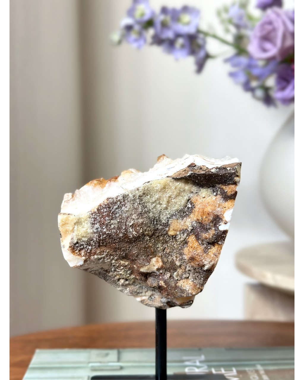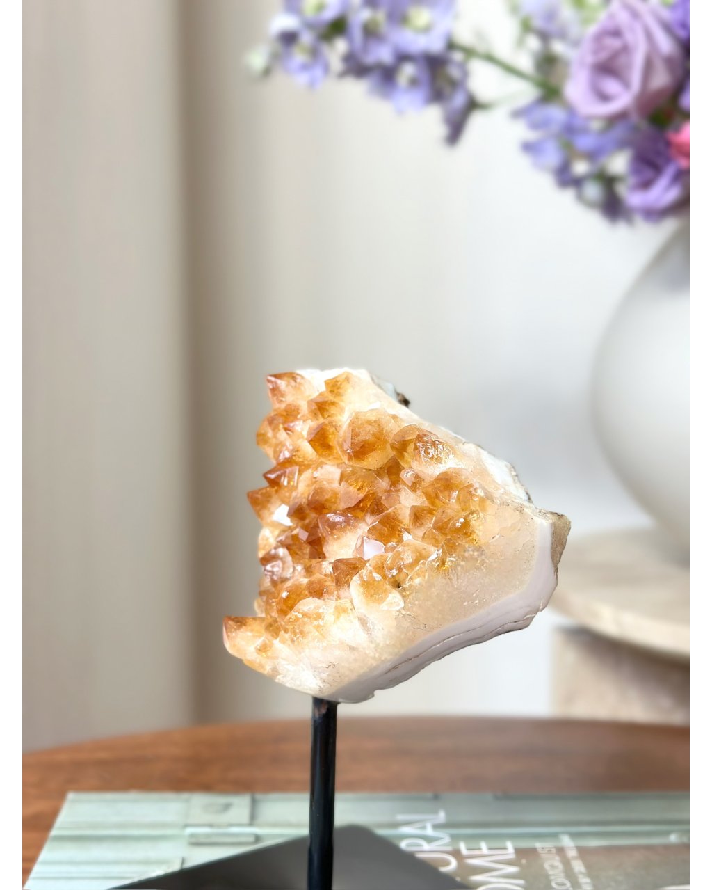 Tento přepálený citrín na podstavci je jako zkamenělé slunce - surový, silný a nepřehlédnutelný. Krystaly vyrůstají s přirozenou jistotou, každý hrot zachycuje světlo jiným směrem a celek působí jako zdroj vnitřního žáru. Přepálený ametyst, který se proměnil v citrín, v sobě nese energii transformace, příběh změny, kdy tlak a žár daly vzniknout nové síle.