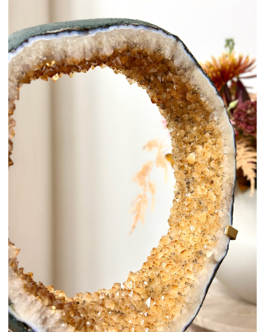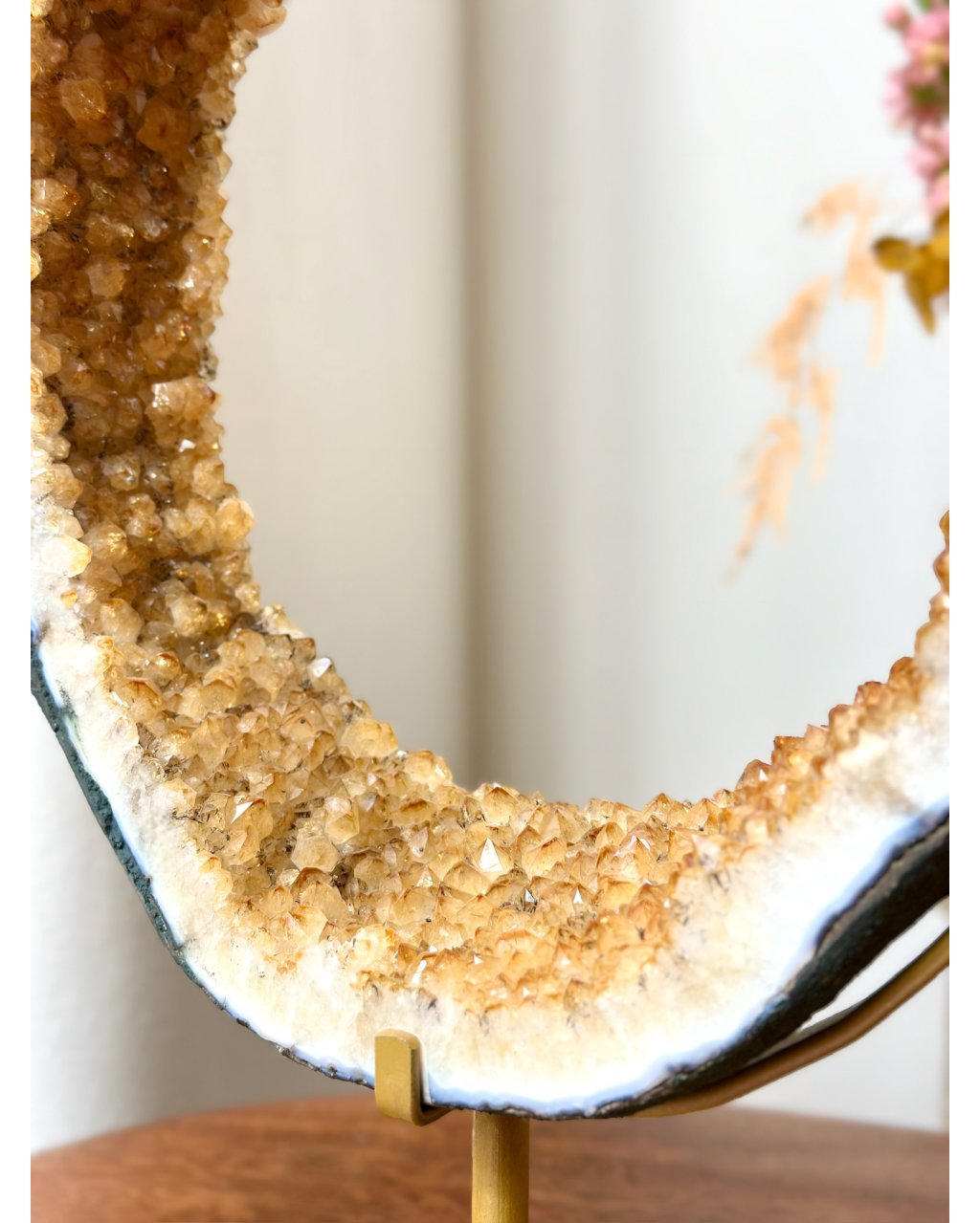 Přepálený citrín, často nazývaný „sluneční duše kamene“, nese v sobě intenzivní vibrace světla. Jeho teplé zlaté tóny aktivují solar plexus, otevírají cestu k sebevyjádření, sebevědomí a osobní magnetické síle. Květy, jemně vrostlá nebo přirozeně vyklíčená forma v kameni, symbolizují rozkvět a nové začátky - připomínku, že každý okamžik života je příležitostí k vlastnímu rozkvětu.