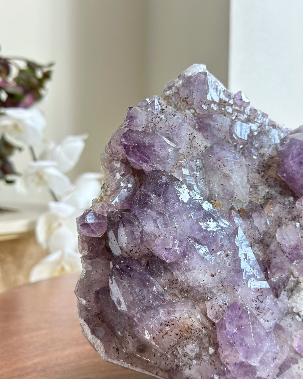 Očista: opláchněte pod proudem vlažné vody, nebo v misce s vodou společně s křišťálem, můžete také použít kouř z vykuřovadla, poté nabijte ve stínu, aby neztratil svou fialovou barvu