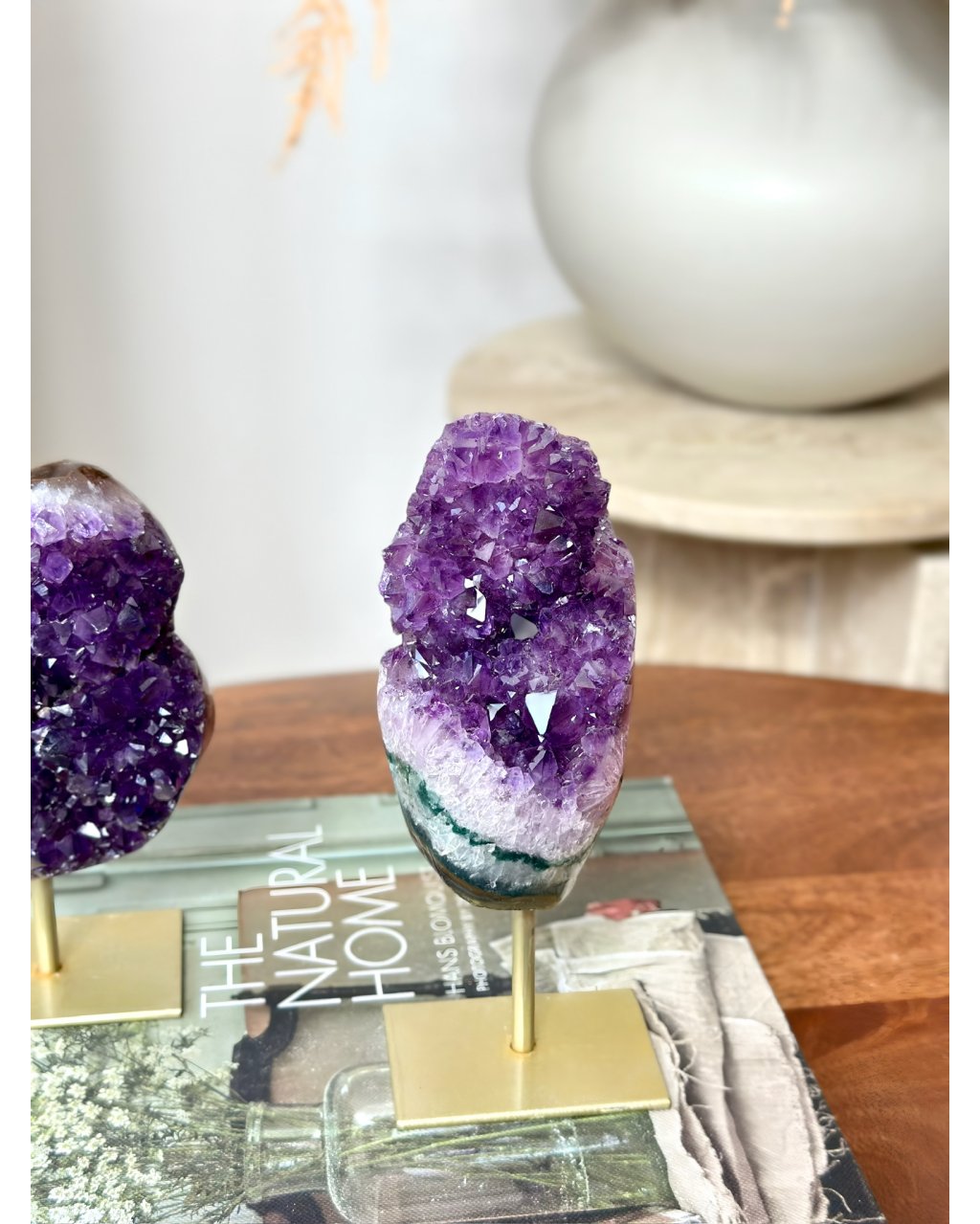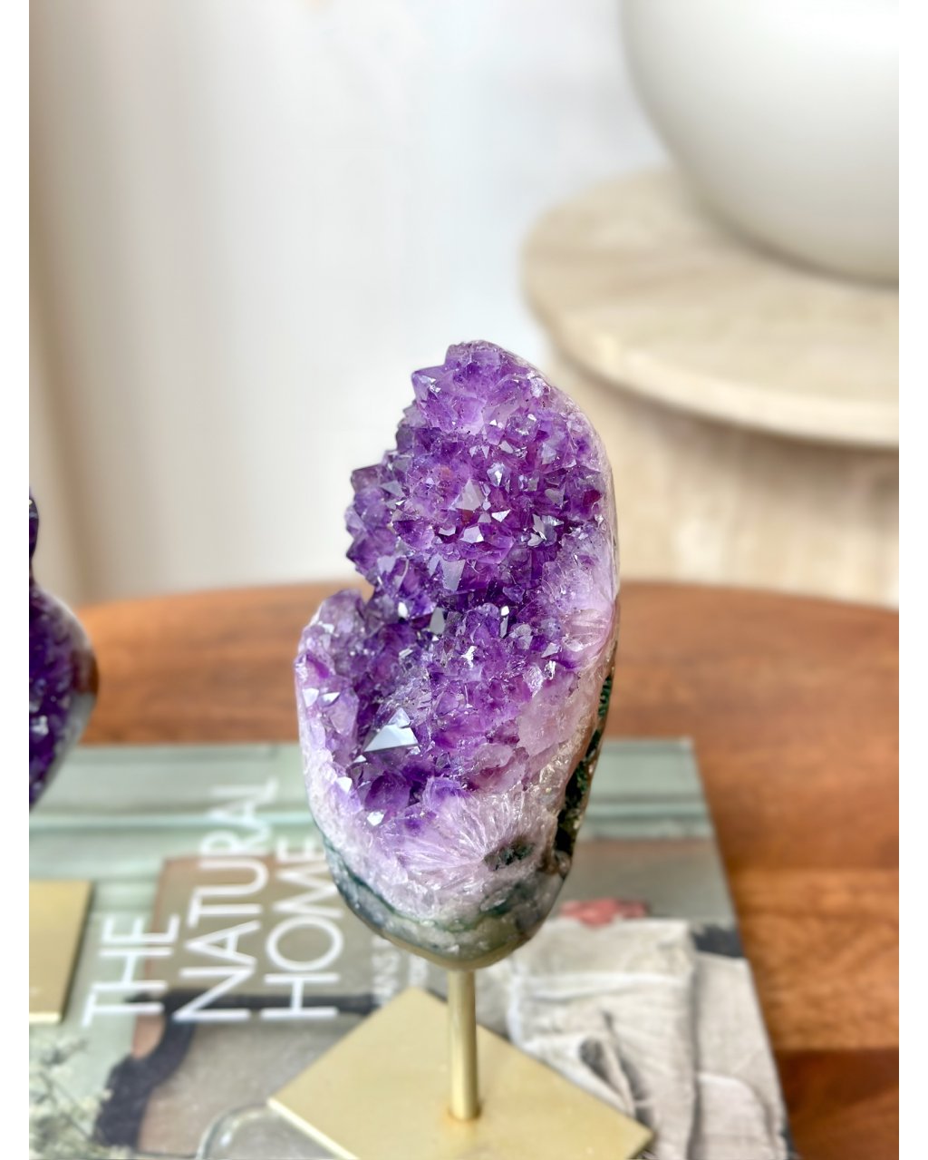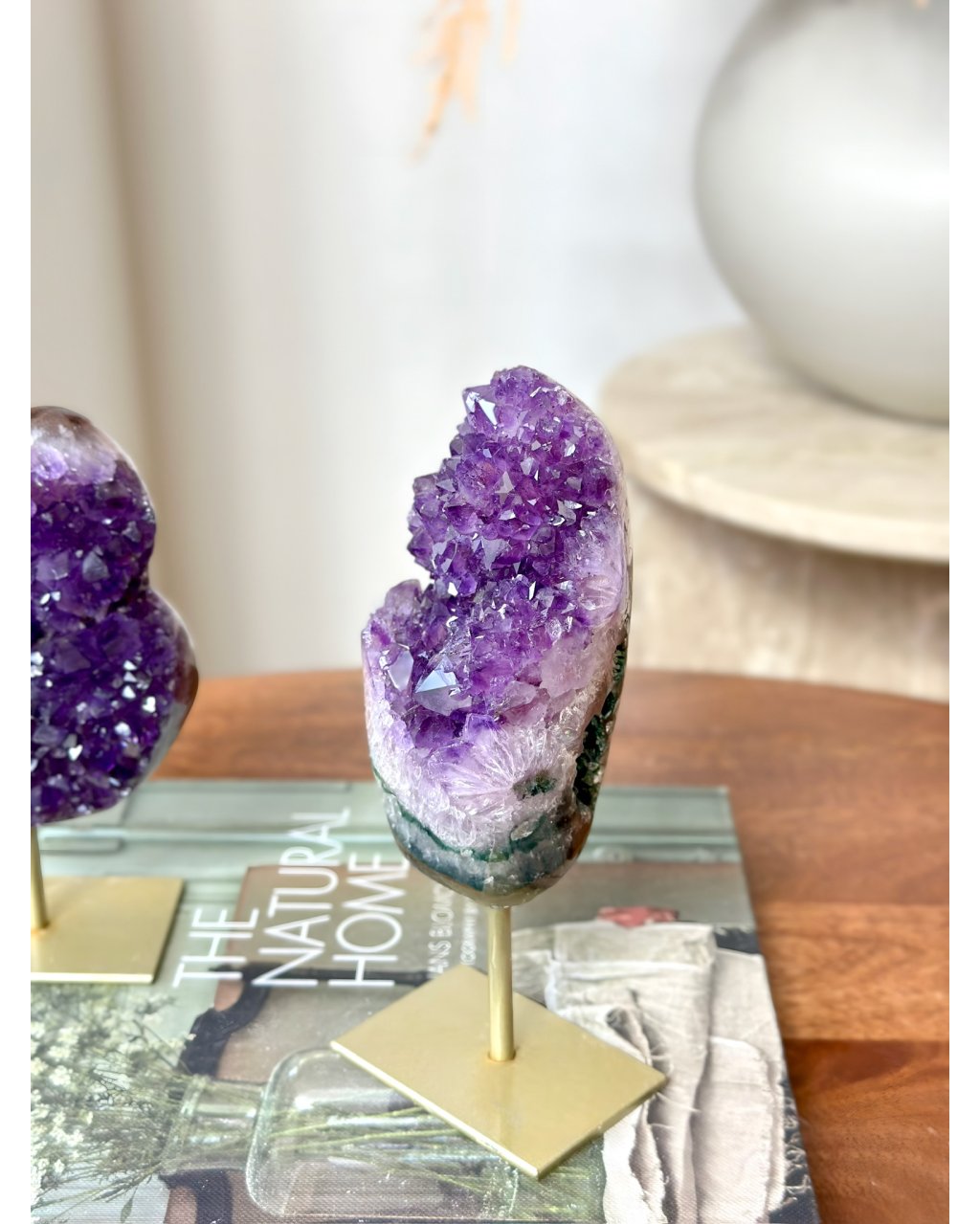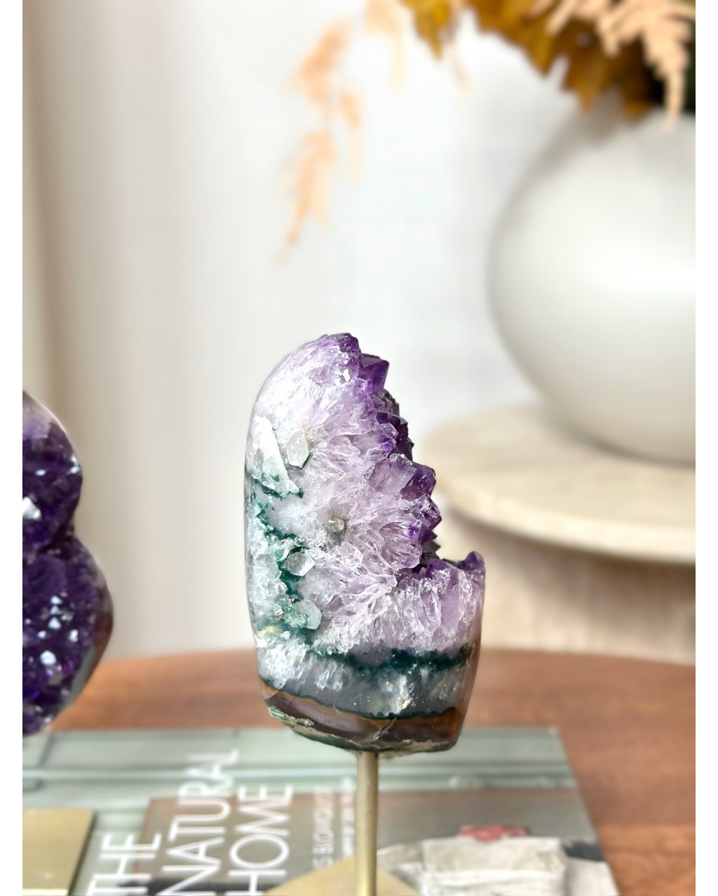 Ametystová drúza s jemným ametystovým květem na jedné straně, dokonalá, přirozeně rostlá a umístěná na podstavci, září pastelovými odstíny fialové. Krystaly jsou precizně formované přírodou, jejich struktura připomíná tajemné květy a ledové vzory zachycené v čase.
