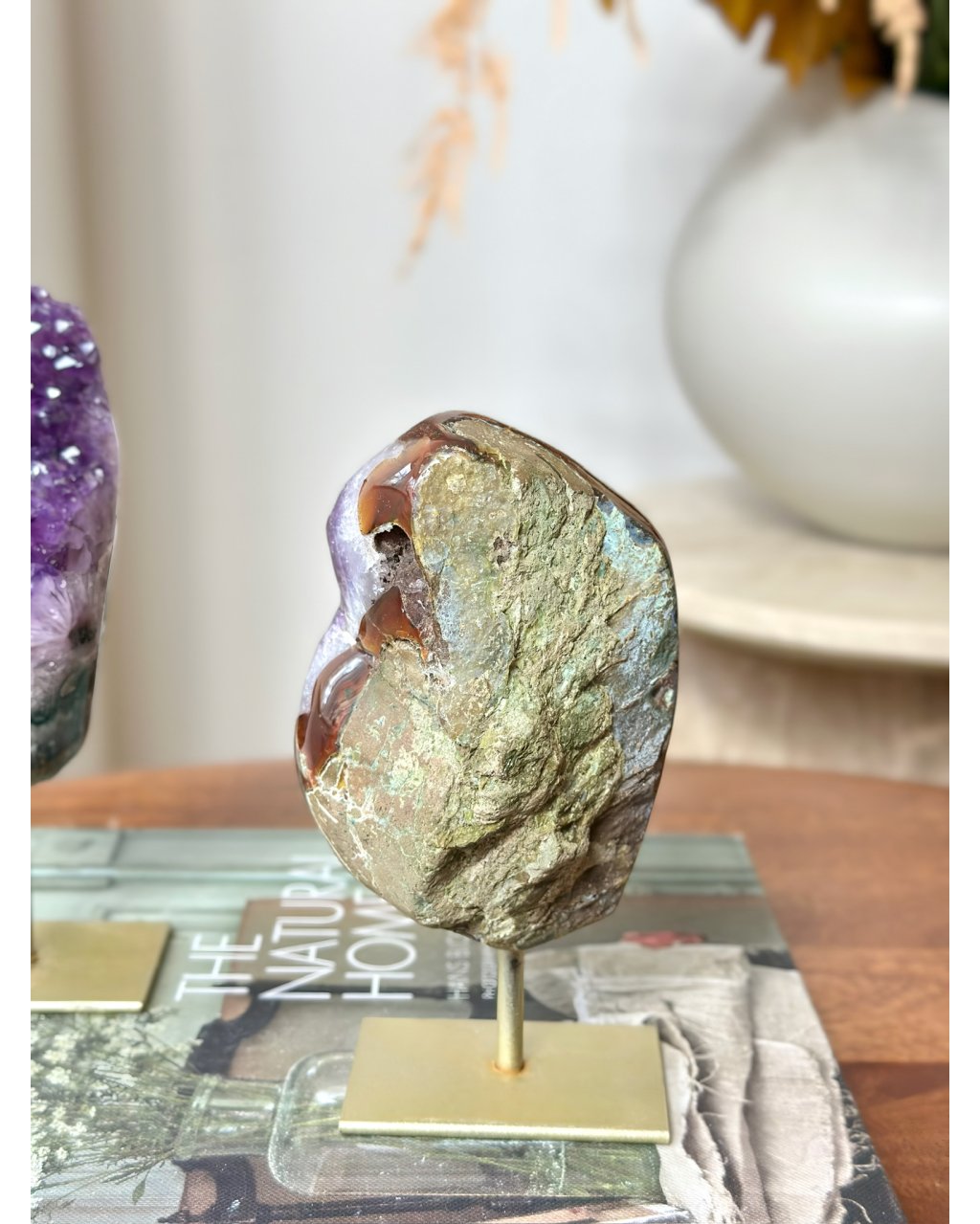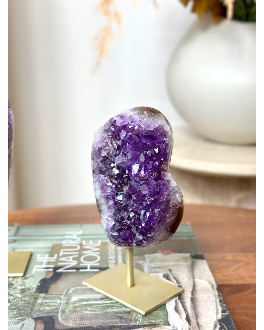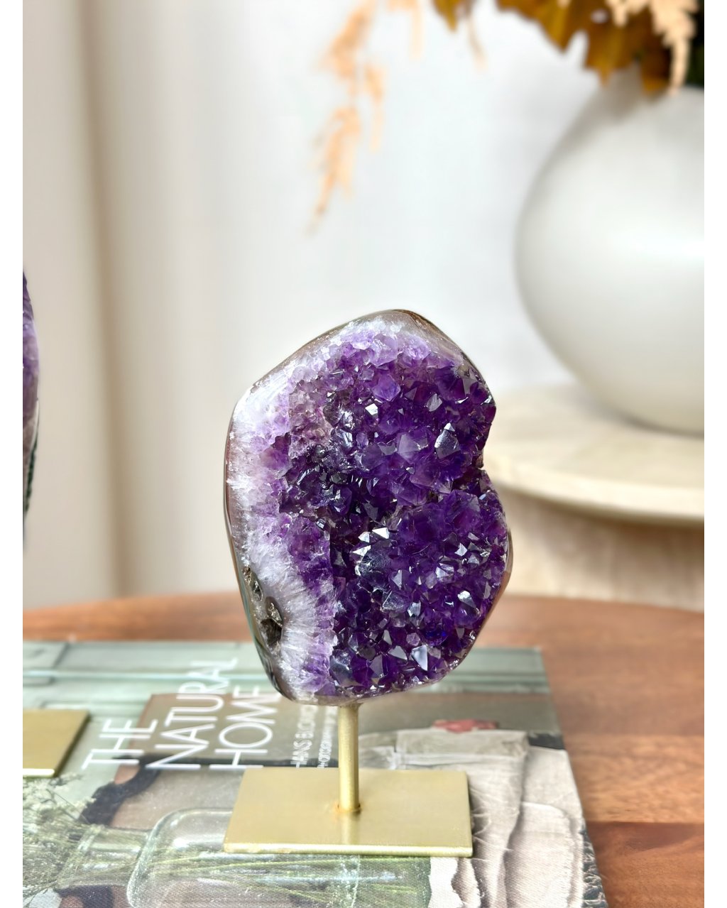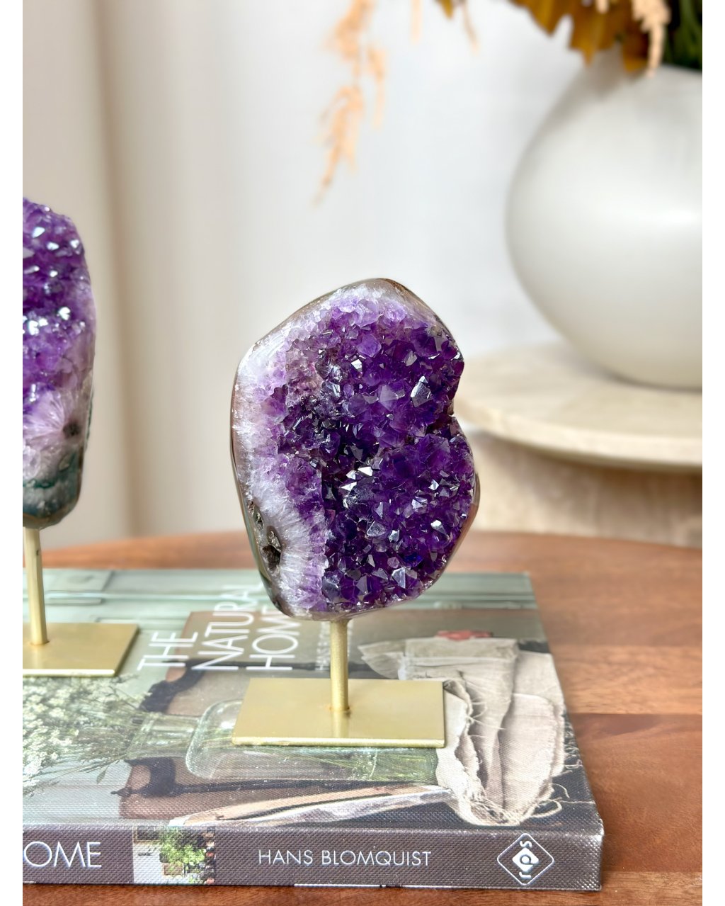 Ametystová drúza na podstavci působí jako krystalická svatyně, stojí pevně, klidně, a přitom září jemností, která se dotýká duše. Její dokonale sladěné, až pastelové odstíny fialové působí jako něžné světlo ranního úsvitu, kdy je energie ještě čistá a tichá. Tato barva není jen krásná; nese v sobě léčivou vibraci sladkého klidu, který se šíří prostorem jako jemná vůně levandule.