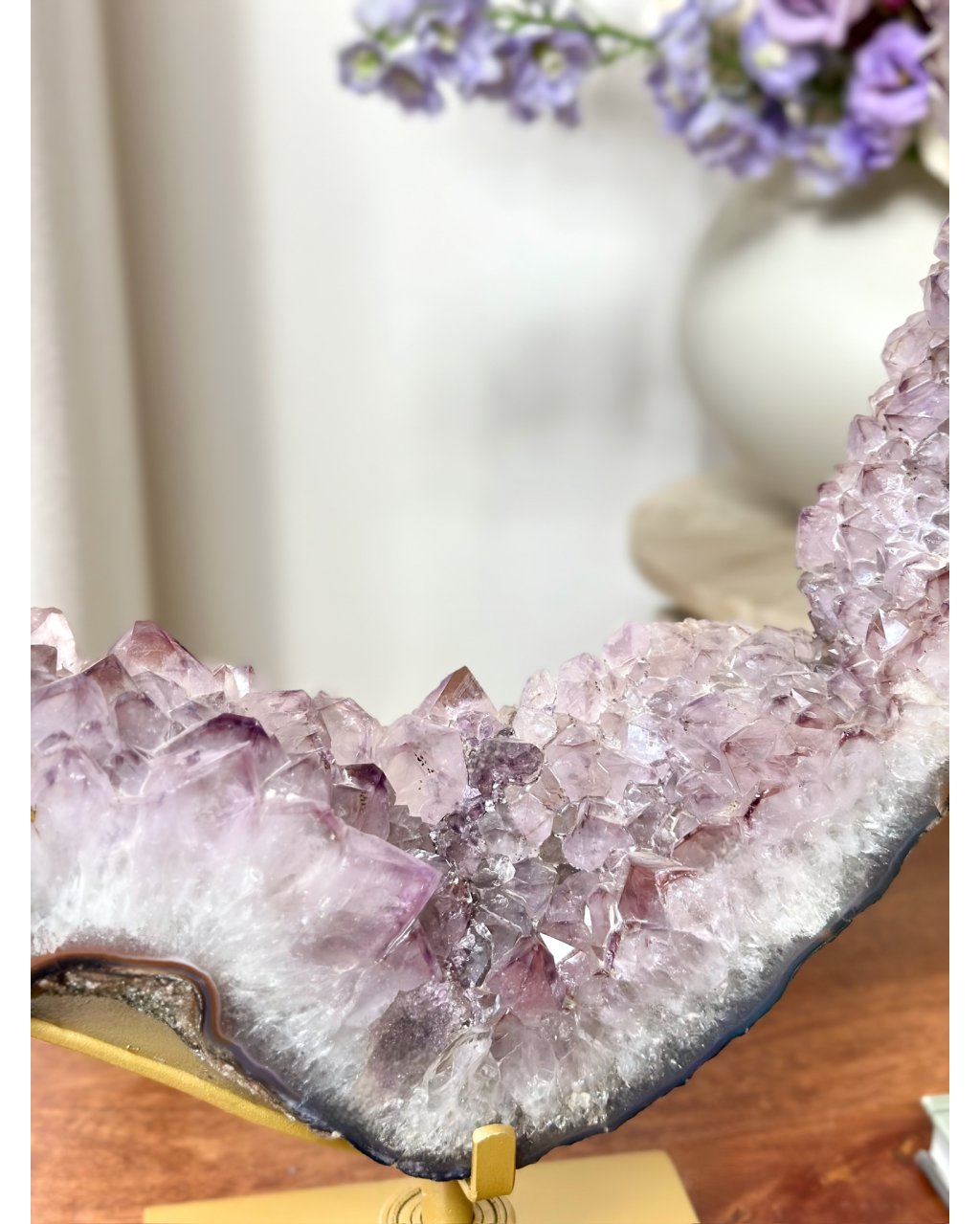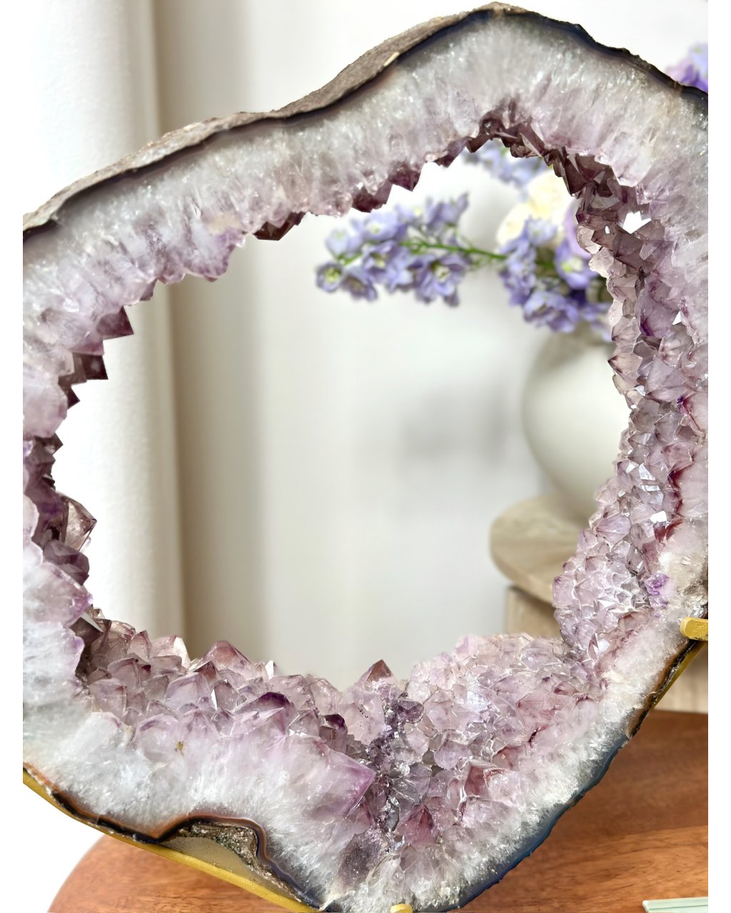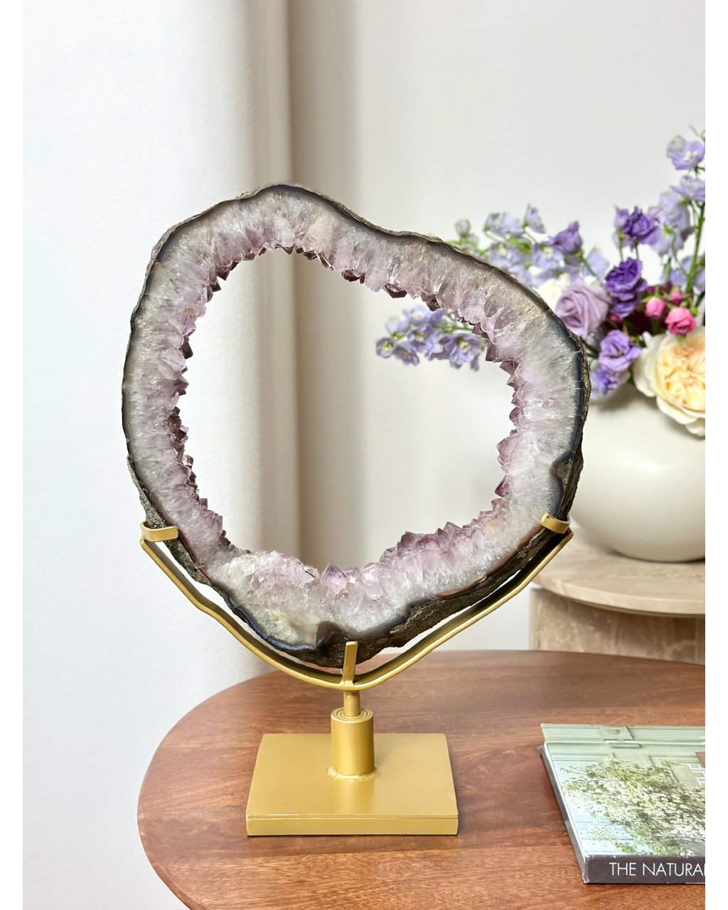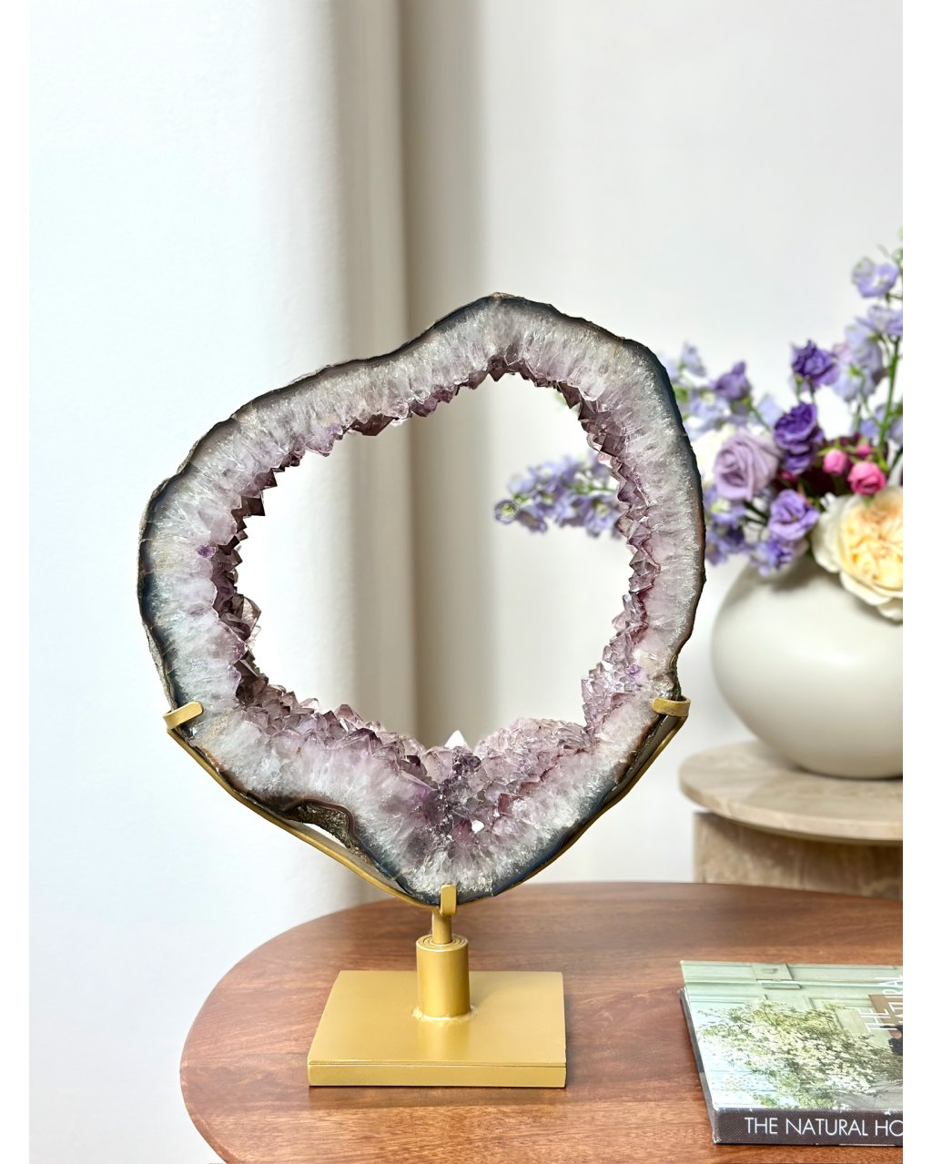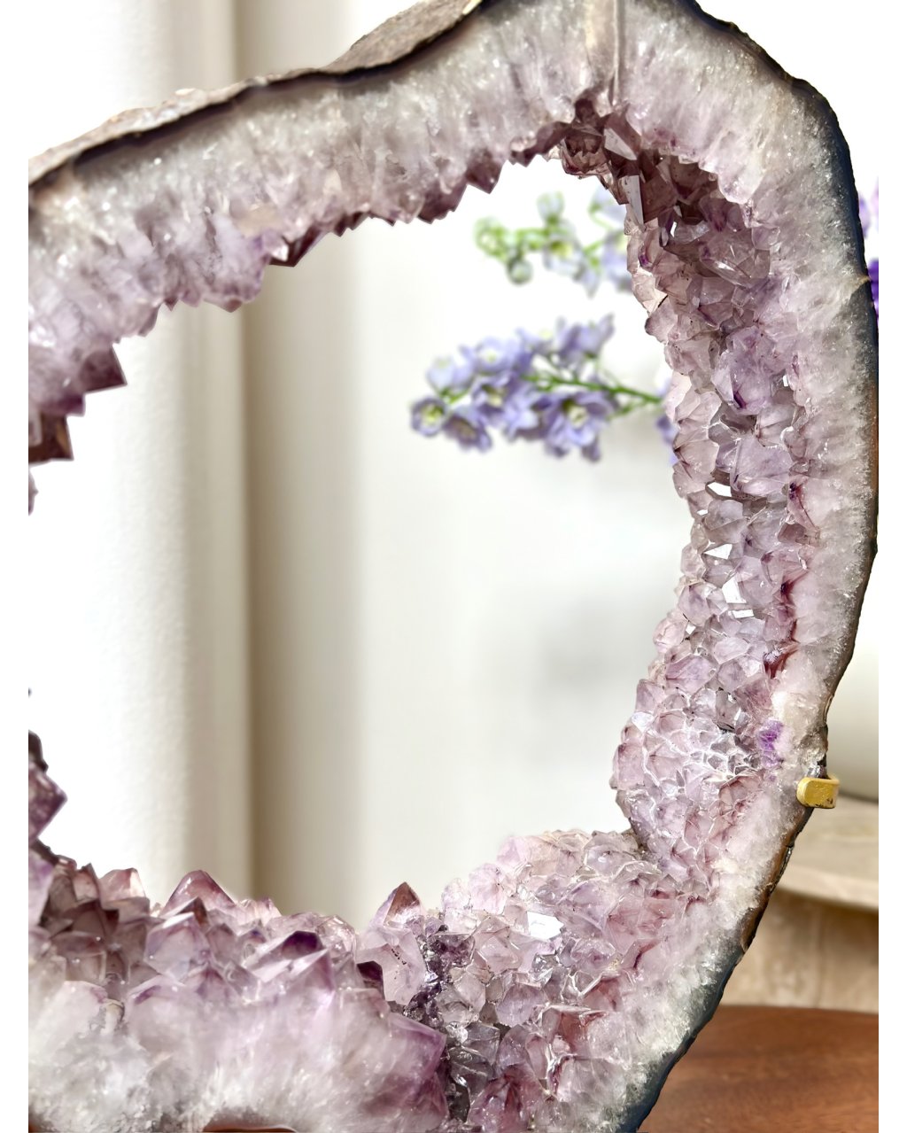 Možnost otáčení dává tomuto ametystovému portálu pohyb, podobný dráhám planet. Světlo se zachytává v krystalech jako hvězdy v temnotě a vytváří jemné, ale silné vyzařování do okolí. Tento kus nepůsobí pozemsky, ale přesto zůstává stabilní a ukotvený. Je to spojení vesmírné hloubky a zemské jistoty, které se v prostoru okamžitě projeví.