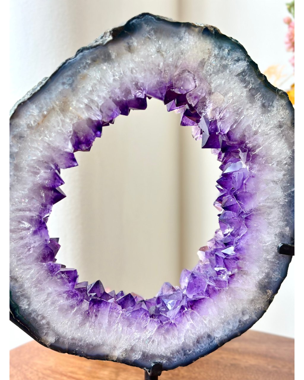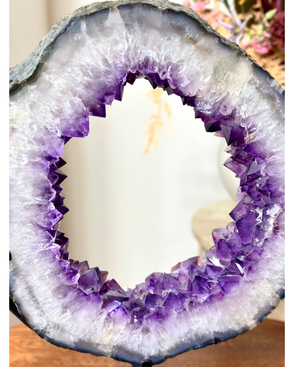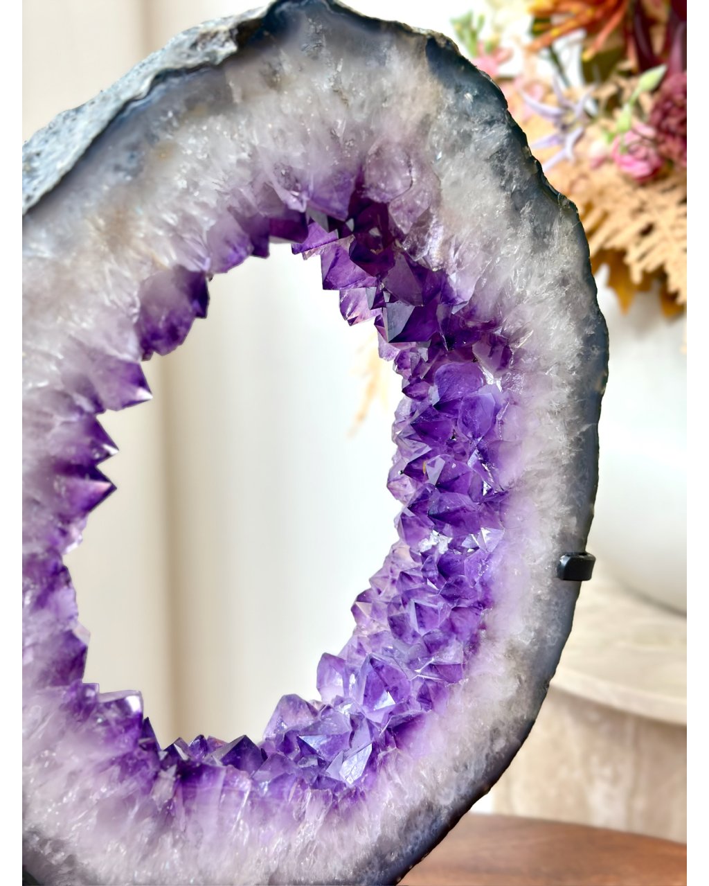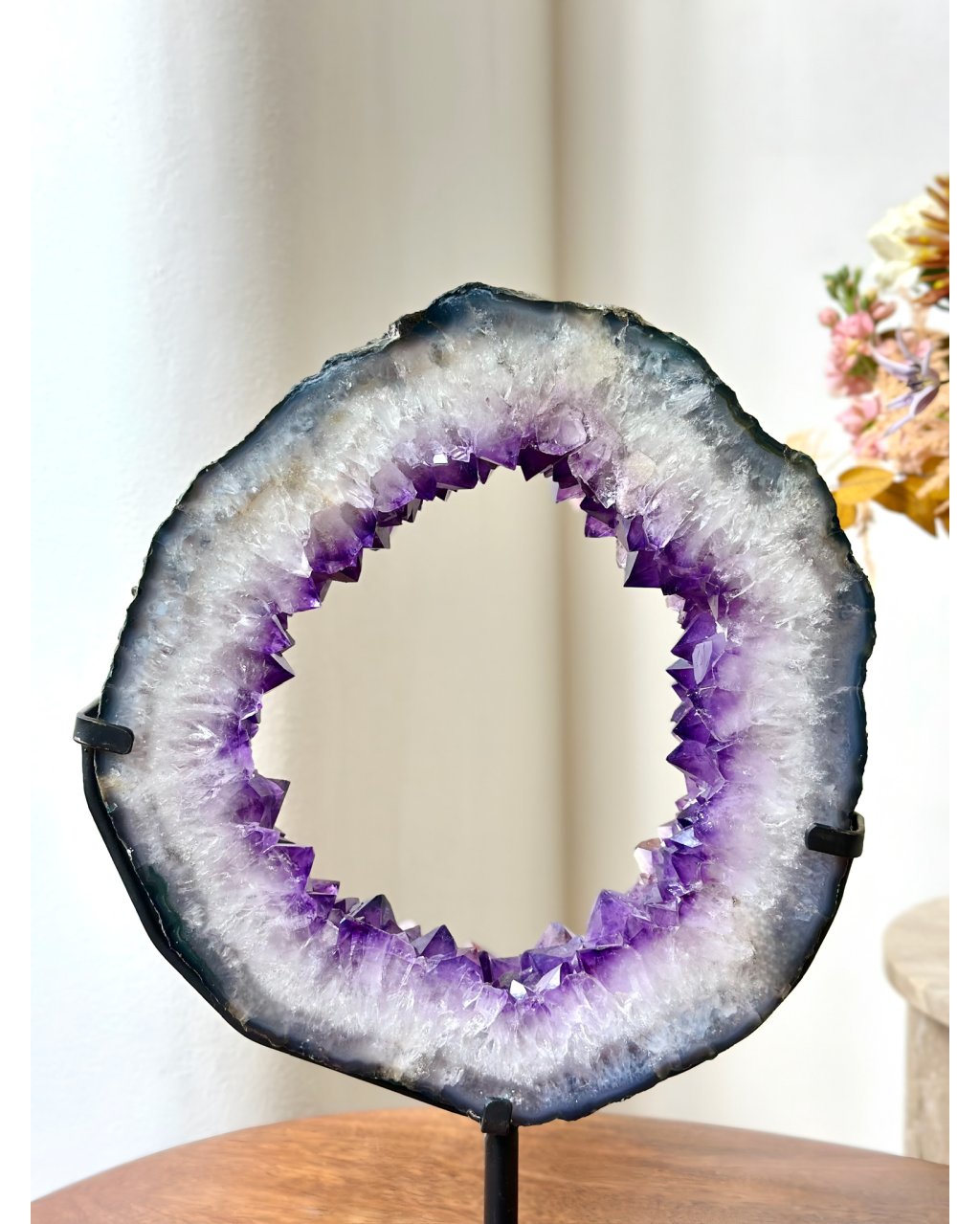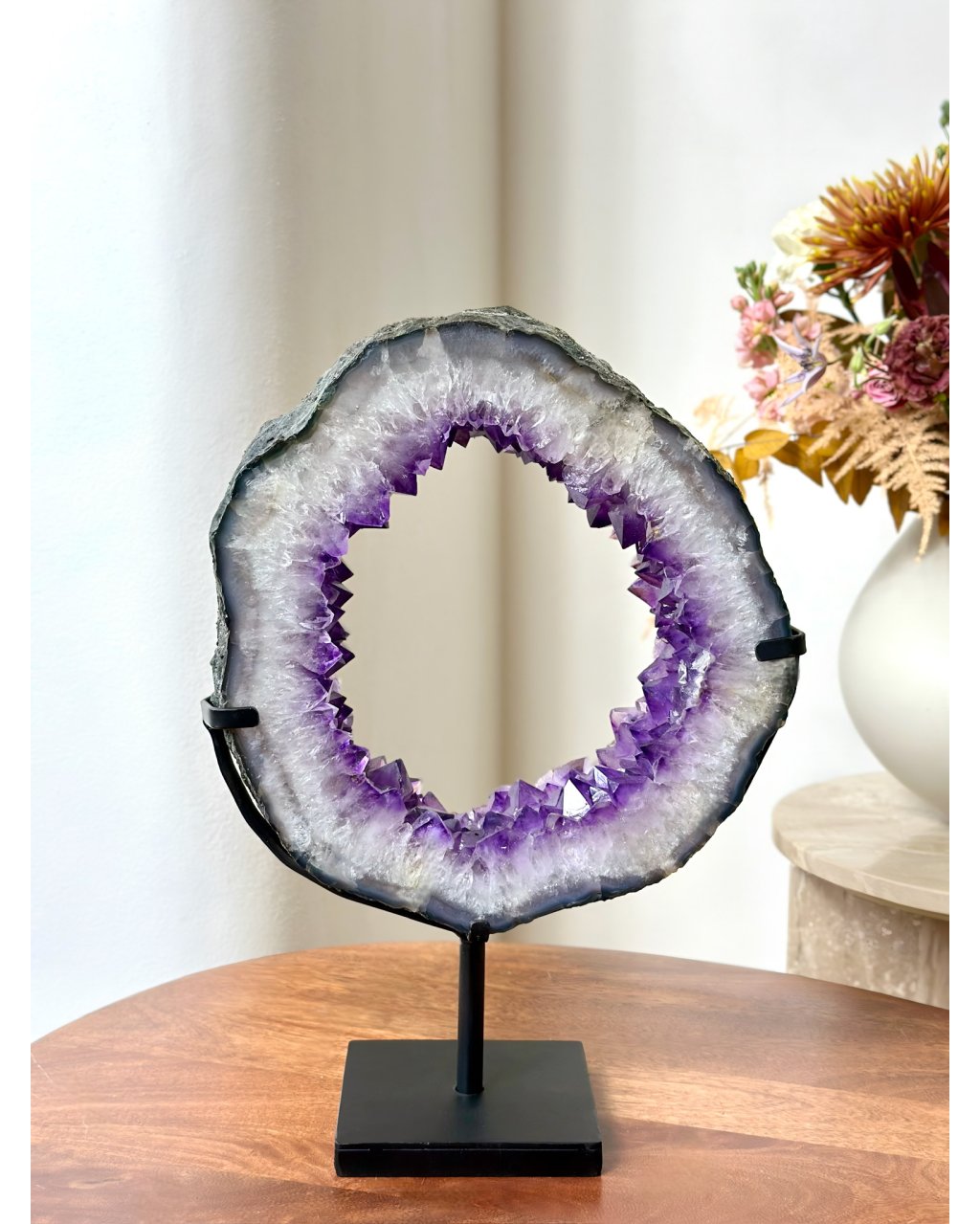 Hloubka ametystové fialové připomíná pohled do hvězdné brány, je to vstupní cesta k vyšším rovinám vědomí, která dokáže očistit i povznášet zároveň. Tento portál je živý strážce a energetický maják, který svou přítomností otevírá srdce i mysl a proměňuje každý prostor v místo síly.