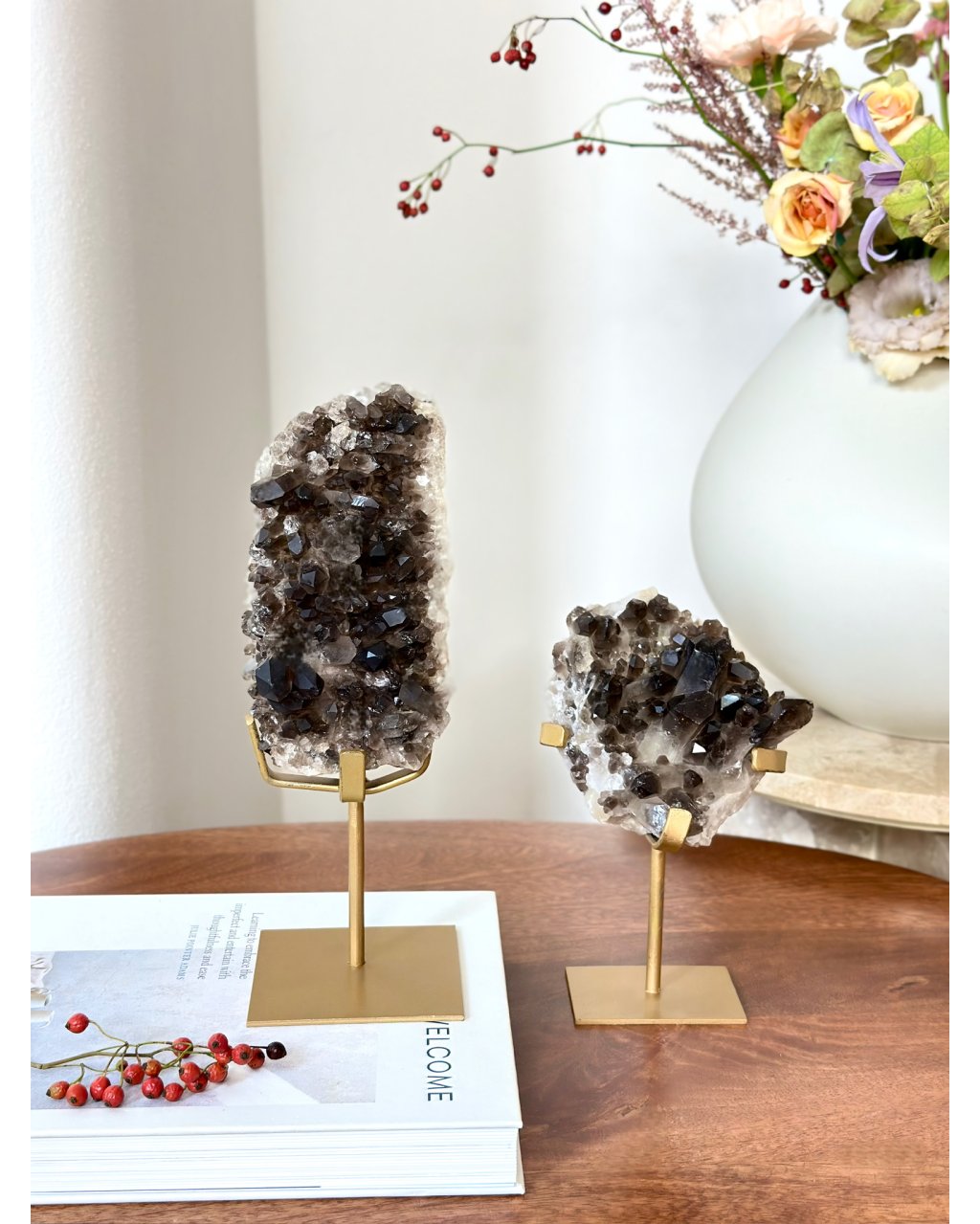Kámen je umístěn na elegantním zlatém stojánku, který zvýrazňuje jeho majestátní krásu a energii, ale stojánek je volitelný - záhnědu lze používat i samostatně, položit na stůl, oltář nebo použít jako podstavec pro další krystaly.