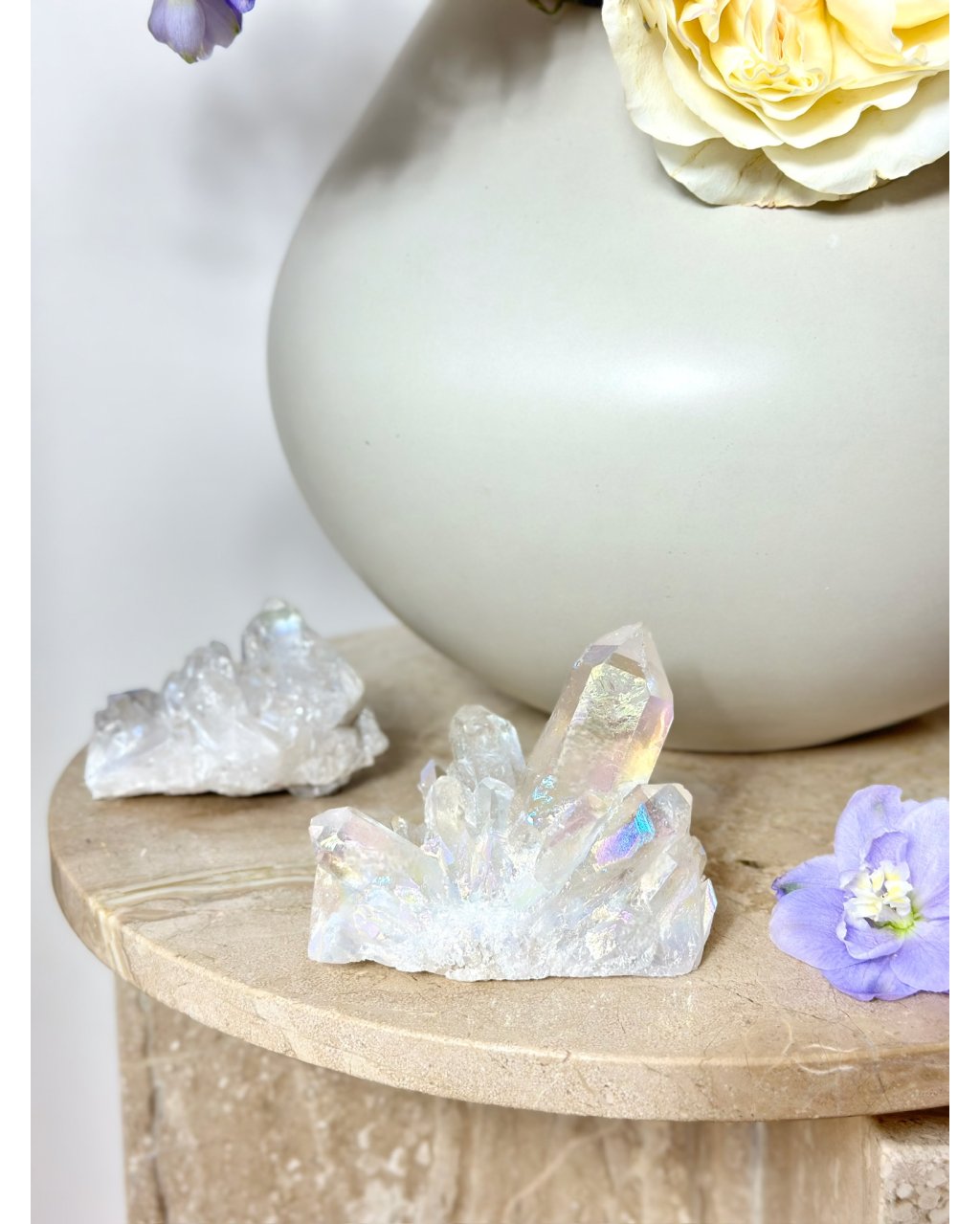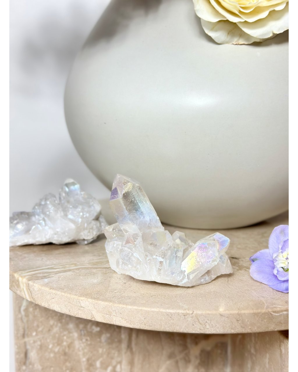 Tato křištálová druza je silně propojena s pozitivními duchovními bytostmi, anděly a světelnými průvodci. Podporuje komunikaci s vyššími rovinami, prohlubuje meditaci a napomáhá otevření korunní a krční čakry. Aqua aura zesiluje přirozené vlastnosti křišťálu – čistí energii prostoru, rozpouští negativní vibrace a přináší pocit lehkosti, bezpečí a duchovní ochrany.