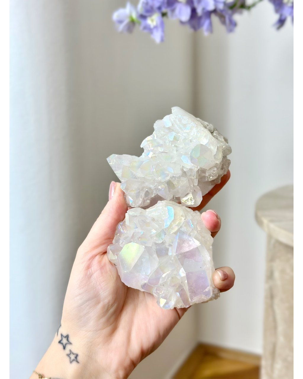 Křištálová druza s efektem aqua aura je zářivým mostem mezi hmotným a duchovním světem, nositelem vysokých vibrací světla, klidu a čistého vědomí. Jemný duhově modrý lesk aqua aura povlaku vytváří éterický vzhled, který připomíná andělské světlo, nebeský dech a klidné proudění vyšších sfér. Každý krystal v druze působí jako anténa, skrze kterou proudí jemná, láskyplná energie naplněná mírem a ochranou.