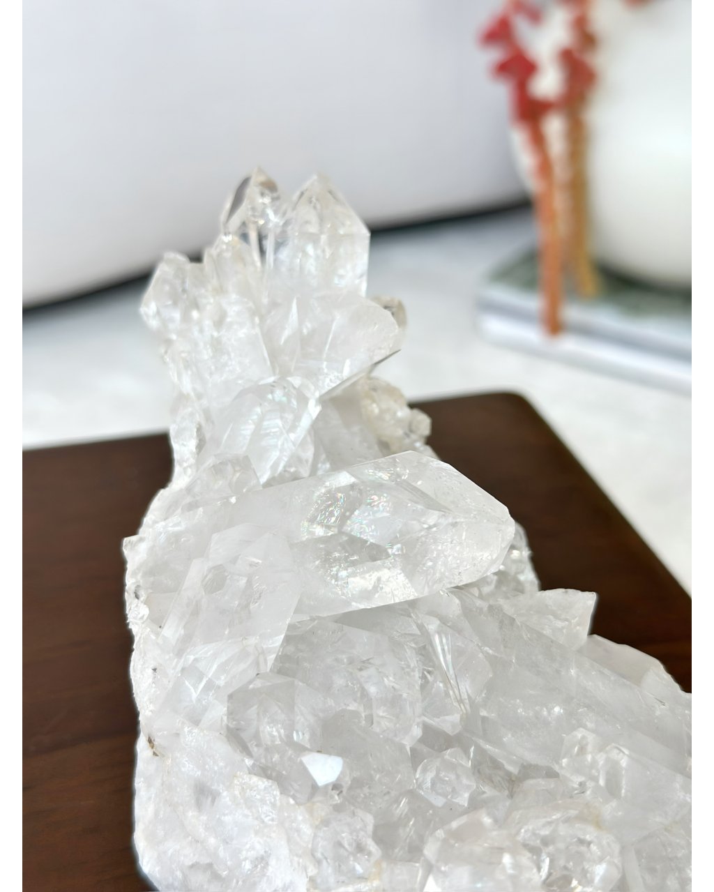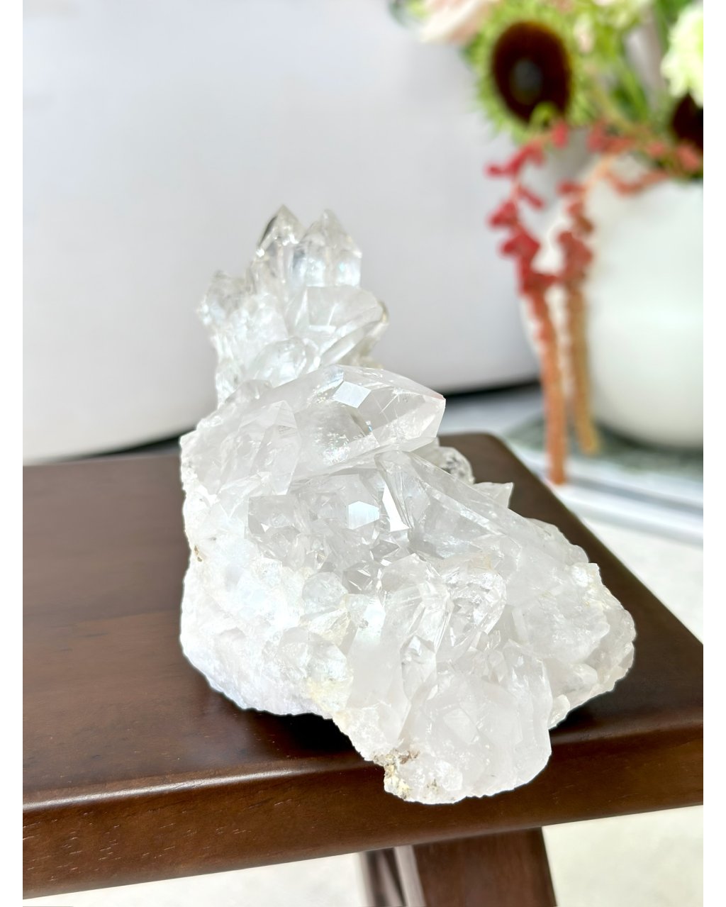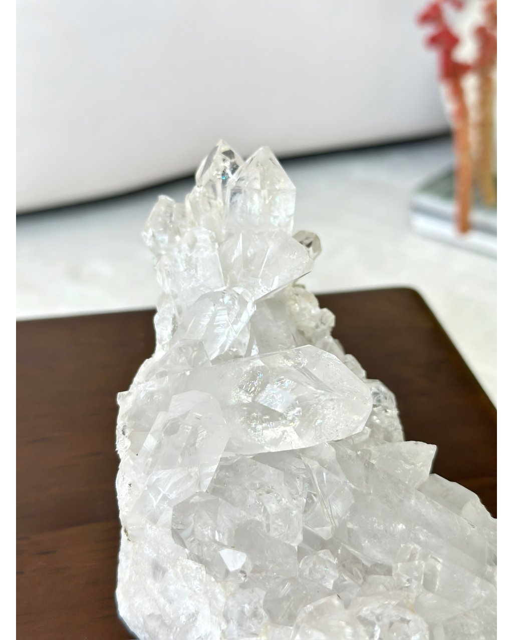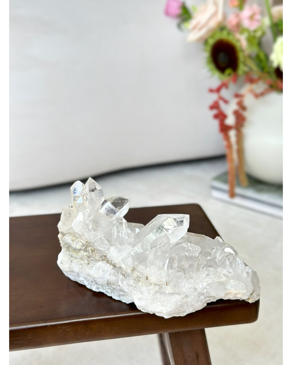Energeticky je drúza jako živý světelný chrám. Každá část působí současně samostatně i jako součást celku, což zesiluje její účinky. Čistota krystalů umožňuje hluboké očistné proudy energie, harmonizuje všechny čakry a přináší jemný, ale intenzivní pocit rovnováhy, vnitřní síly a propojení se světlem. Tato drúza není jen nádherným estetickým kouskem, je to živý průvodce, který otevírá prostor pro transformaci, vnitřní klid a napojení na vyšší frekvence.