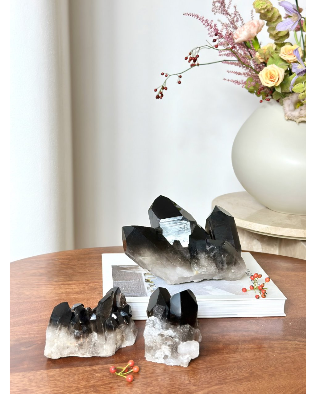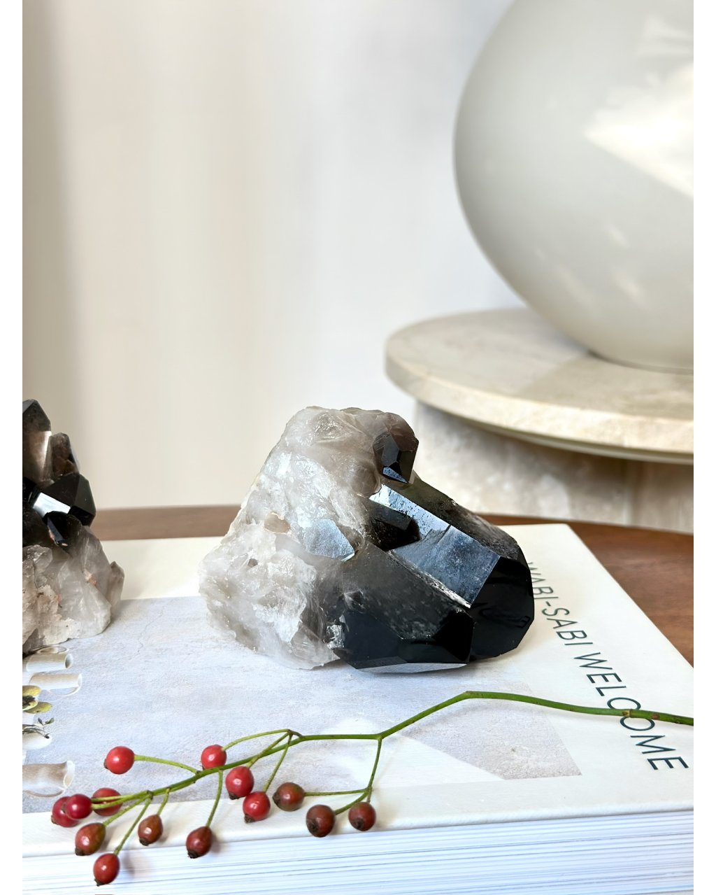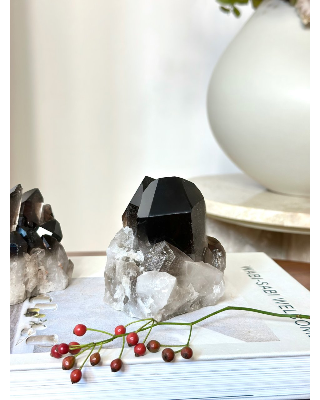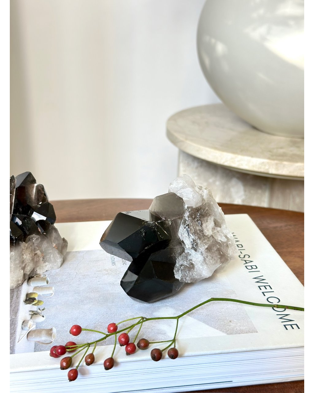 Tento černý křemen, známý jako morion, je silným uzemňujícím kamenem. Jeho energie působí jako štít proti chaosu a nevyváženosti – stabilizuje, čistí a umožňuje hlubší propojení s vlastní vnitřní silou. Morion drúza je zároveň bránou do temnějších vrstev vědomí, kde lze objevit skryté bloky, jež stojí v cestě osobní transformaci.