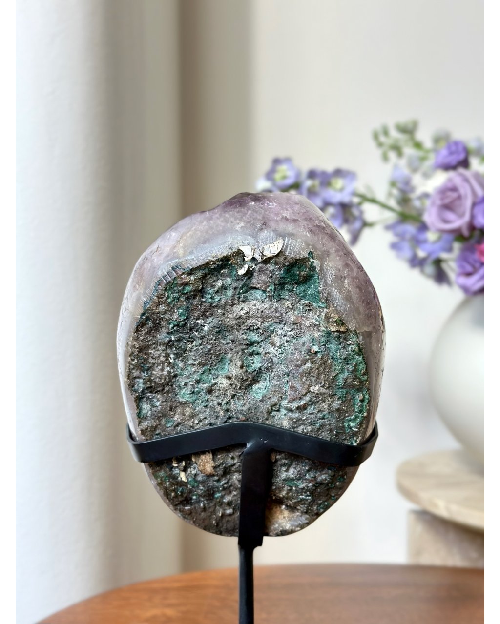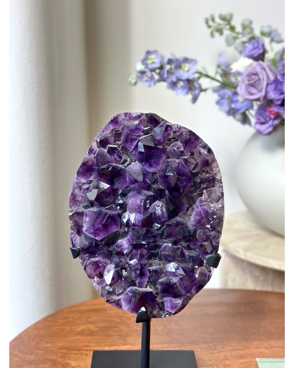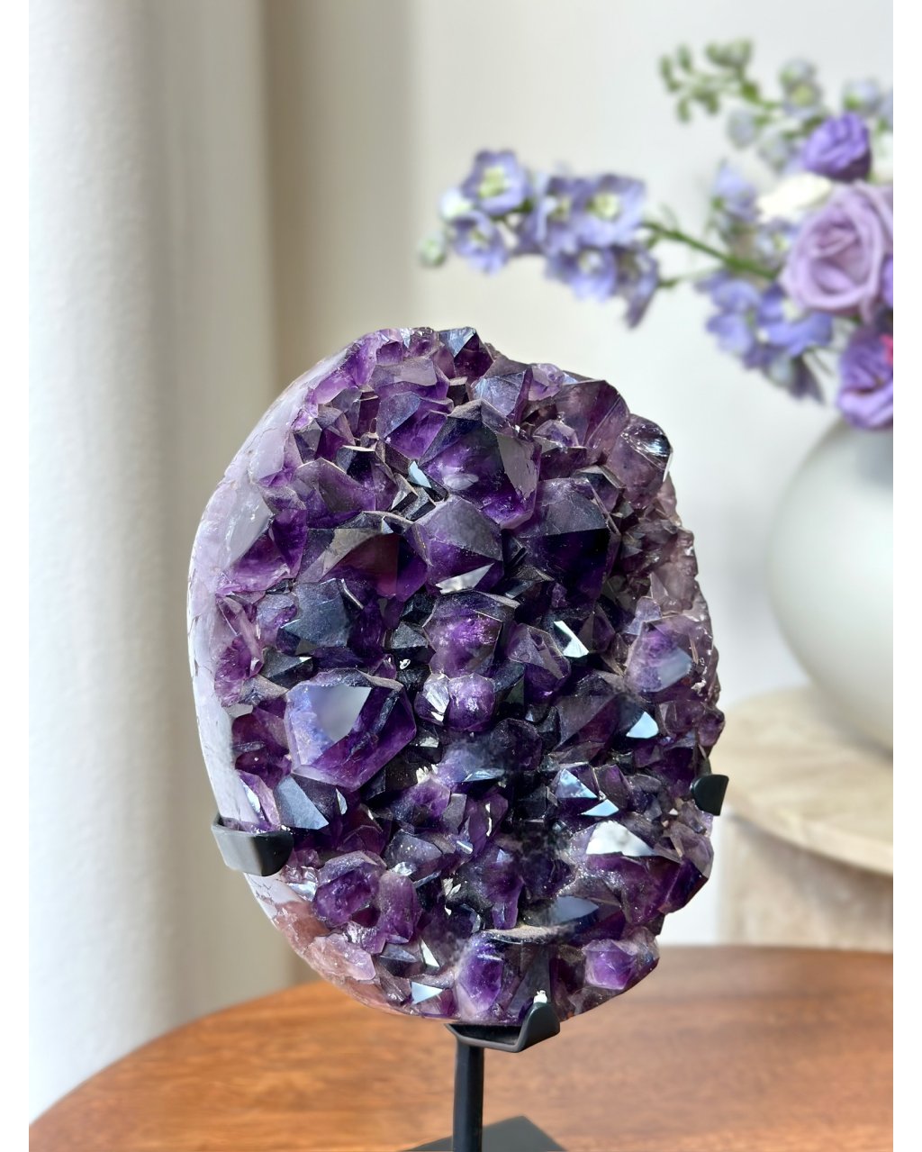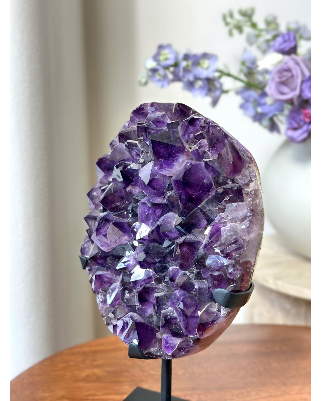Umístěn na elegantním podstavci, působí tento ametyst jako trůn pro světlo. V interiéru se stává nejen magnetem pozornosti, ale i energetickým centrem, které čistí auru prostoru, zklidňuje mysl a prohlubuje meditaci.