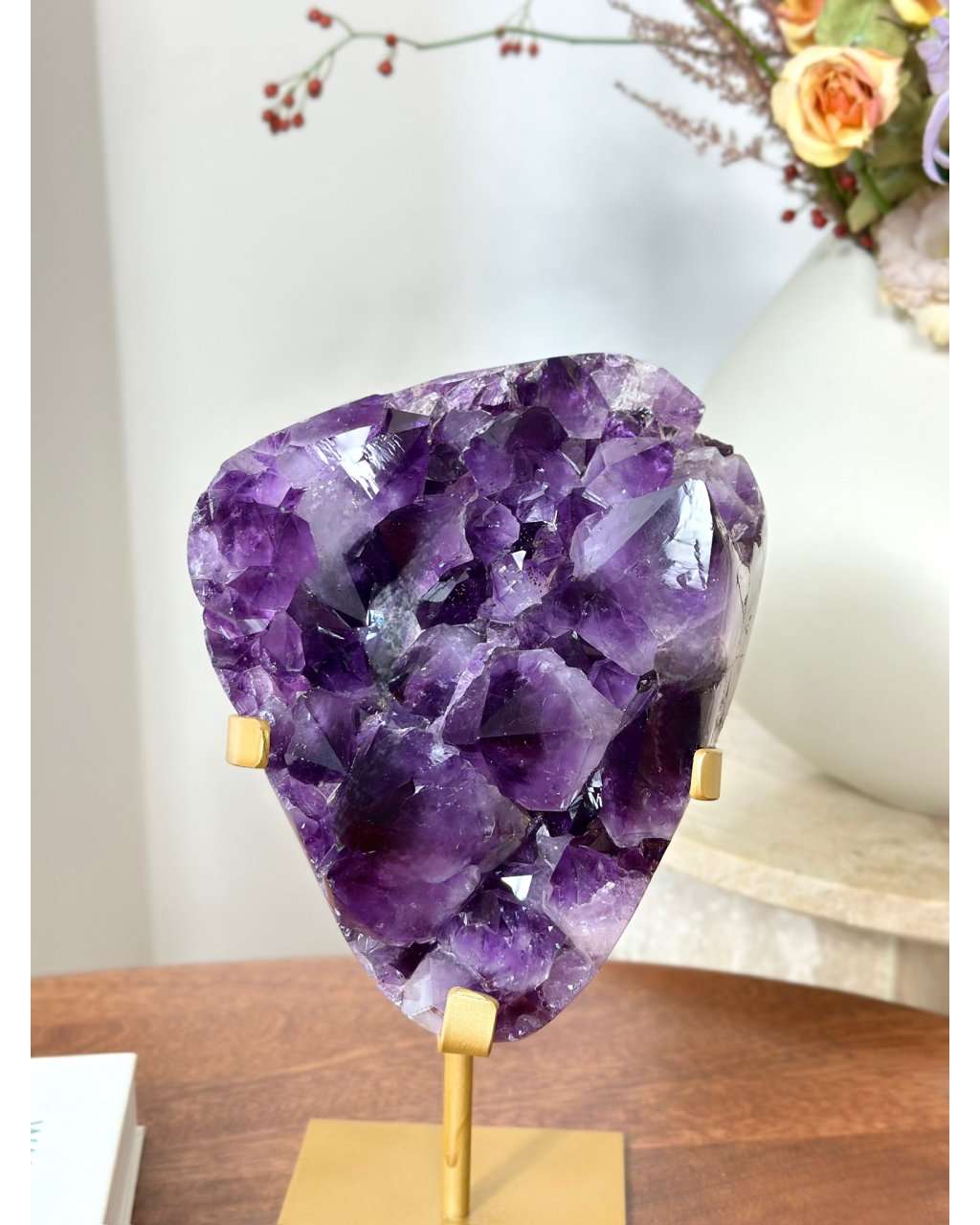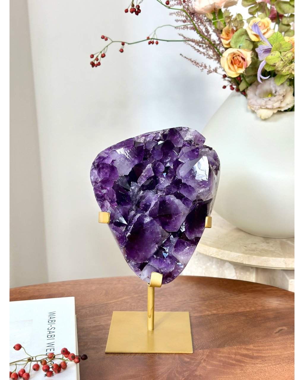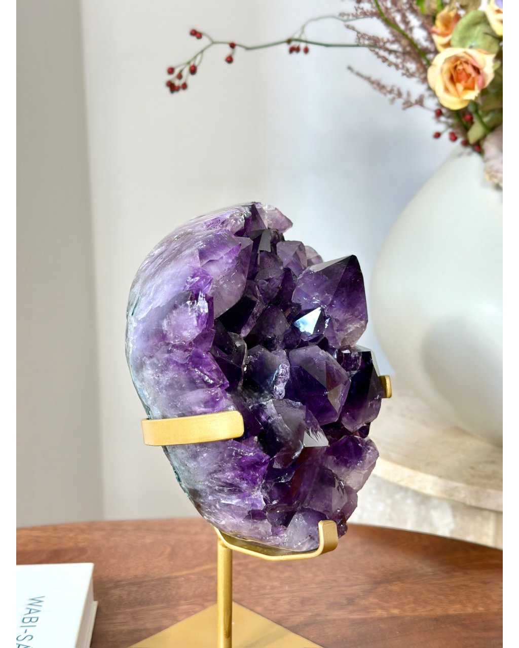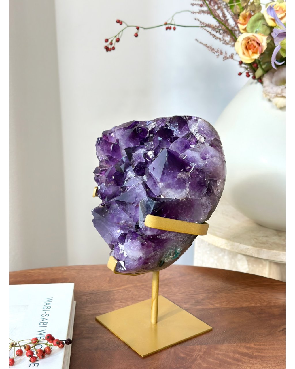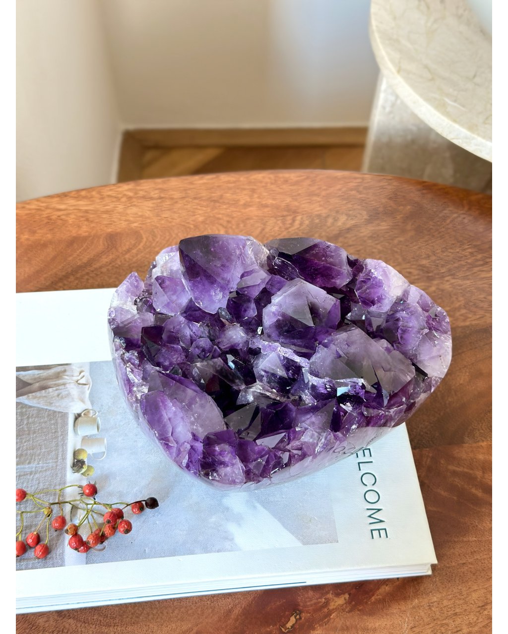 Ametyst je po tisíciletí považován za kámen duchovní ochrany, čistoty a vnitřního klidu. Učí ztišit mysl a otevřít srdce světlu, které léčí. Tento konkrétní kousek má výjimečně vysoké vibrace. Rezonuje s korunní čakrou a vnáší do prostoru pocit posvátnosti a hlubokého míru.