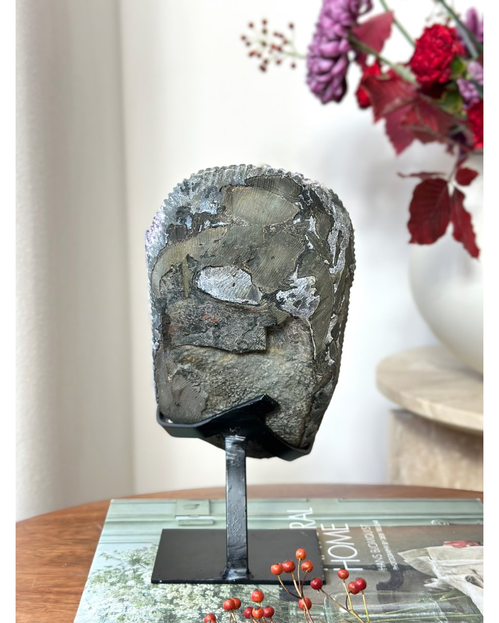 Drúza na podstavci se stává energetickým majákem, který propojuje prostor kolem s vibracemi hojnosti, ochrany a kosmické moudrosti. Posetí drobnými kalcitovými krystaly působí jako aktivátor energie, každý pohled, každý paprsek světla vyvolává jemnou hru barev a vibrací, které harmonizují mysl i prostor, otevírají intuici a inspirují k hlubokému duchovnímu uvědomění.