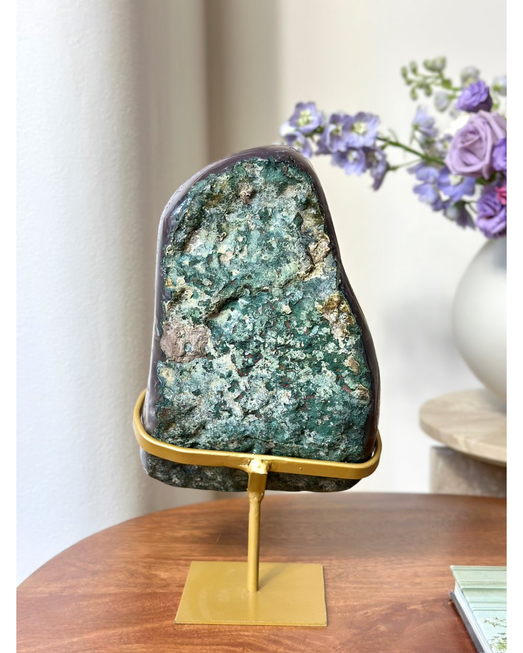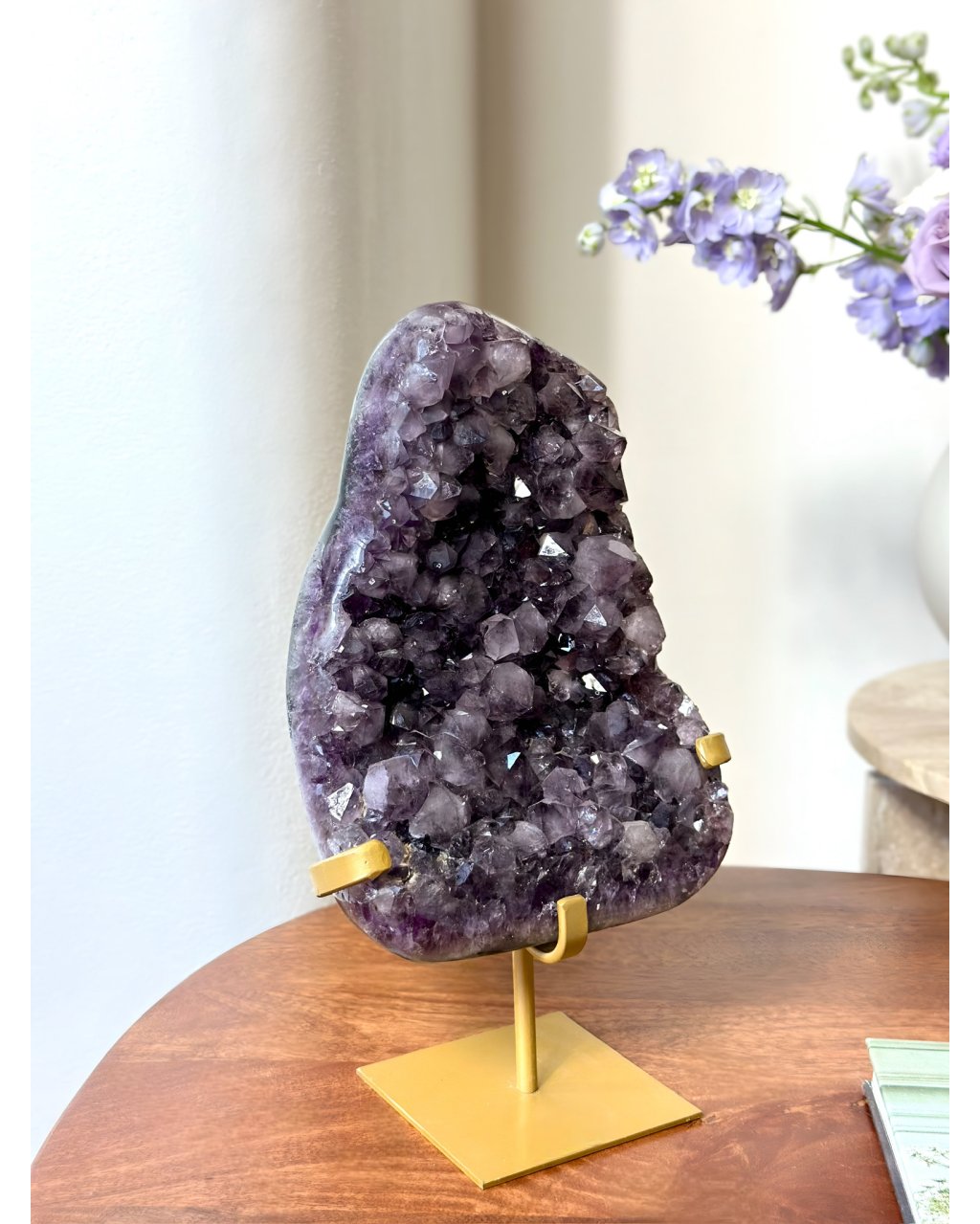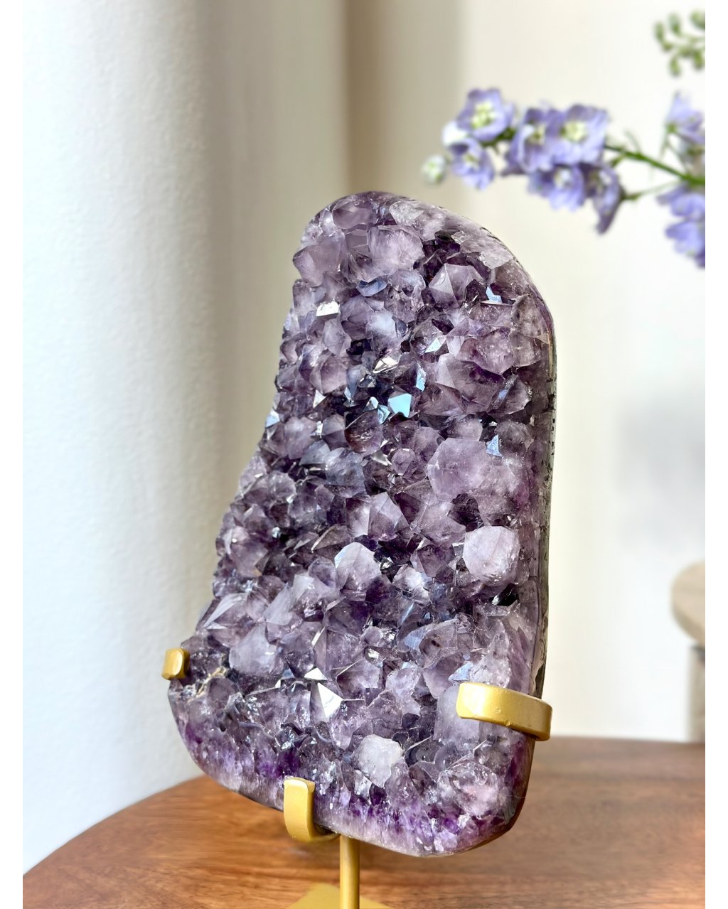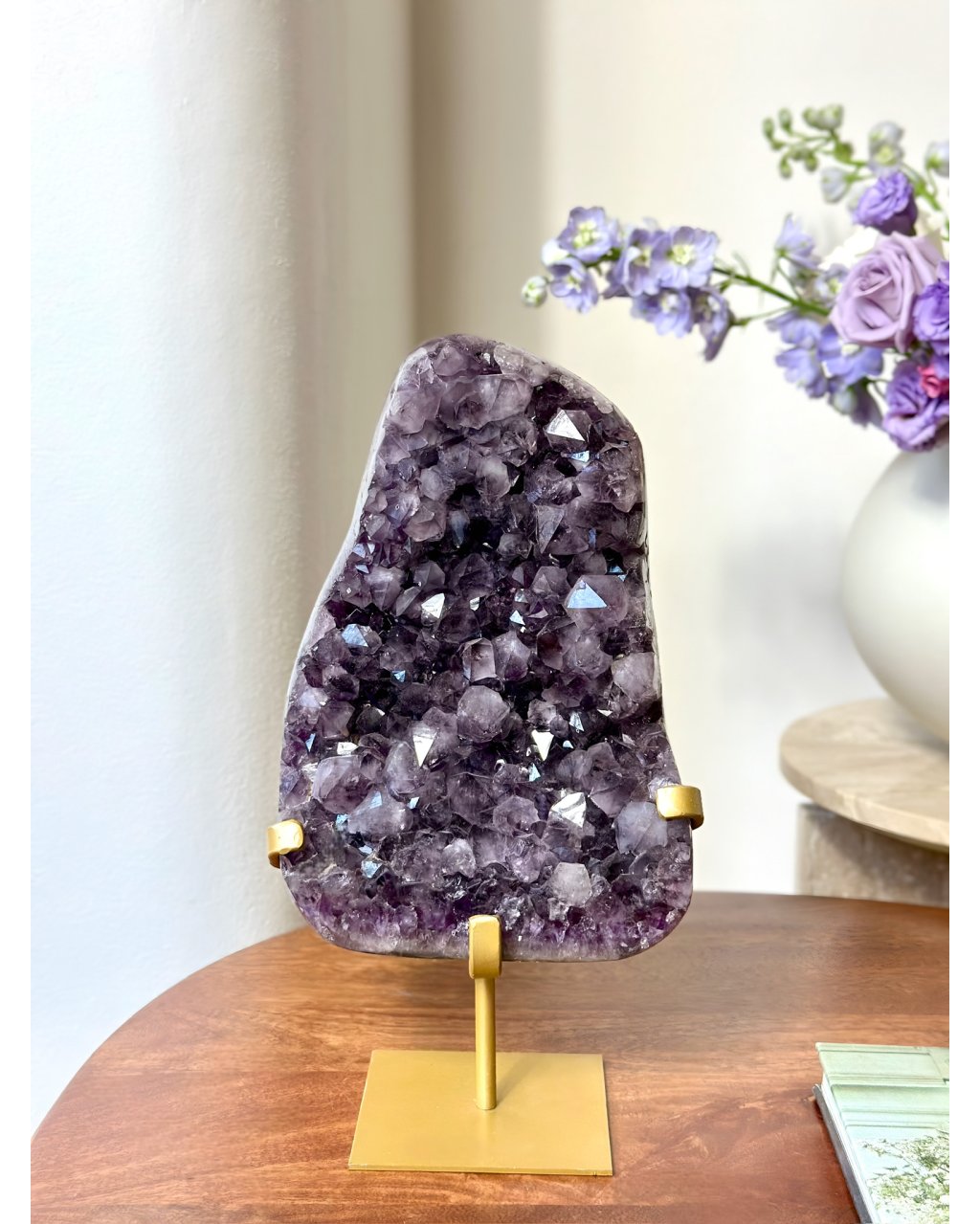 Tento dokonalý ametyst na podstavci má mystickou, sametově hlubokou barvu, která působí klidně a přitom nesmírně silně. Jeho tvar připomíná velký plát, otevřený a rozprostřený, jako by nabízel prostor pro zastavení, nadechnutí a návrat k sobě. Krystaly nejsou divoké ani chaotické, ale tvoří harmonický celek, který vyzařuje vyrovnanost a tichou autoritu.