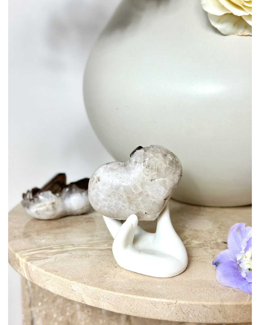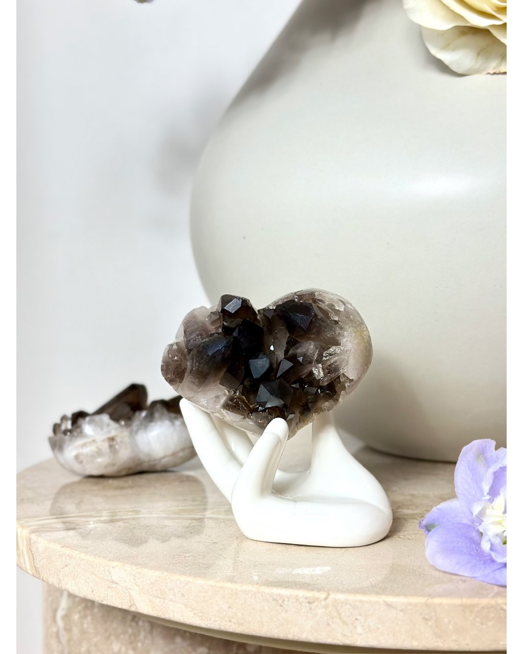 Tvar srdce dodává této záhnědě jemný kontrast, propojuje silnou uzemňující energii s láskou, přijetím a vnitřním klidem. Tento krystal je často vnímán jako ochránce srdce, který pomáhá rozpouštět staré strachy, stres a těžké emoce, aniž by narušoval přirozené hranice člověka. Záhněda v této podobě podporuje pocit bezpečí, vnitřní rovnováhu a schopnost být plně přítomný tady a teď. Je ideální pro ty, kdo hledají hluboké uzemnění, stabilitu a klidnou, zemitou lásku, která neoslňuje, ale drží a nese.