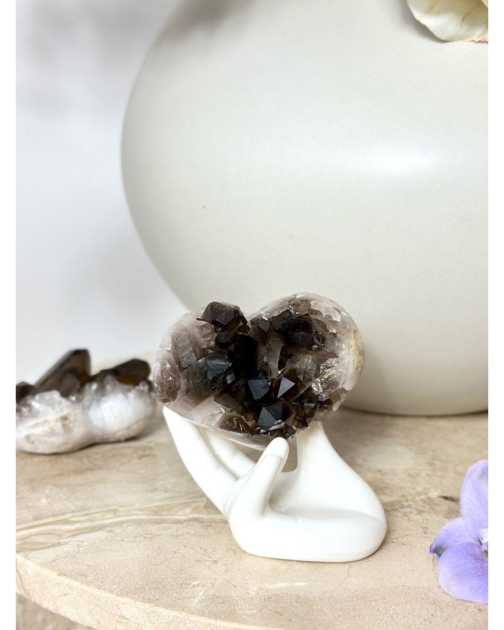 Srdce vytvořené z druzy záhnědy v sobě nese hlubokou, tichou sílu Země a stabilitu, která působí uklidňujícím a zároveň ochranným dojmem. Nádherná tmavá zemská barva záhnědy připomíná kořeny zapuštěné hluboko do půdy, bezpečí, pevnost a schopnost zůstat ukotvený i v náročných obdobích. Krystaly vyrůstající v přirozené druzy vytvářejí živou strukturu, která vyzařuje energii postupně, plynule a velmi vědomě.