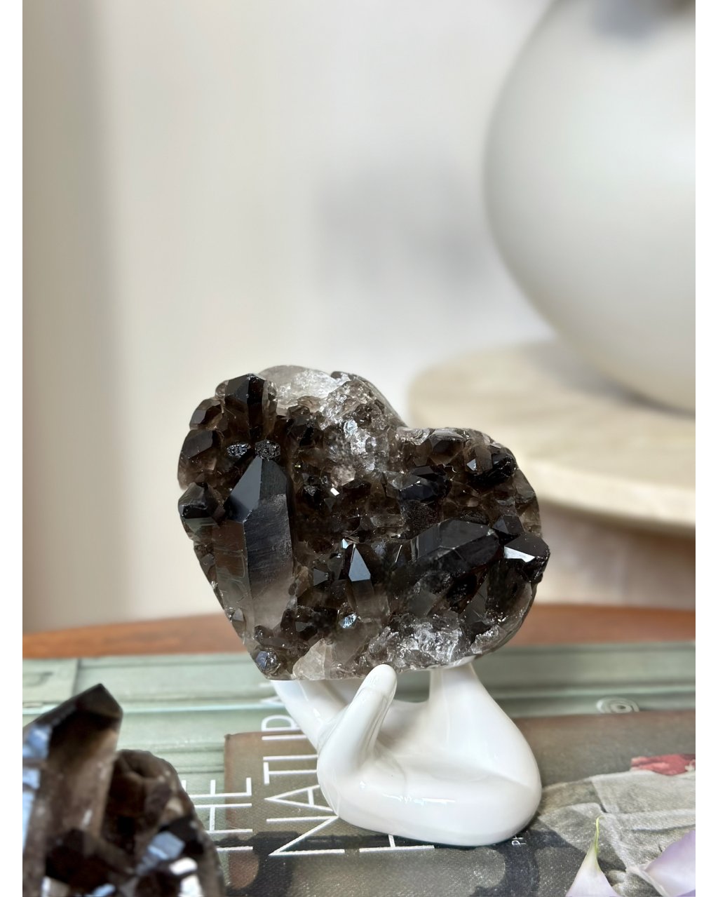 Srdce vytvořené z druzy záhnědy v sobě nese hlubokou, tichou sílu Země a stabilitu, která působí uklidňujícím a zároveň ochranným dojmem. Nádherná tmavá zemská barva záhnědy připomíná kořeny zapuštěné hluboko do půdy, bezpečí, pevnost a schopnost zůstat ukotvený i v náročných obdobích. Krystaly vyrůstající v přirozené druzy vytvářejí živou strukturu, která vyzařuje energii postupně, plynule a velmi vědomě.
