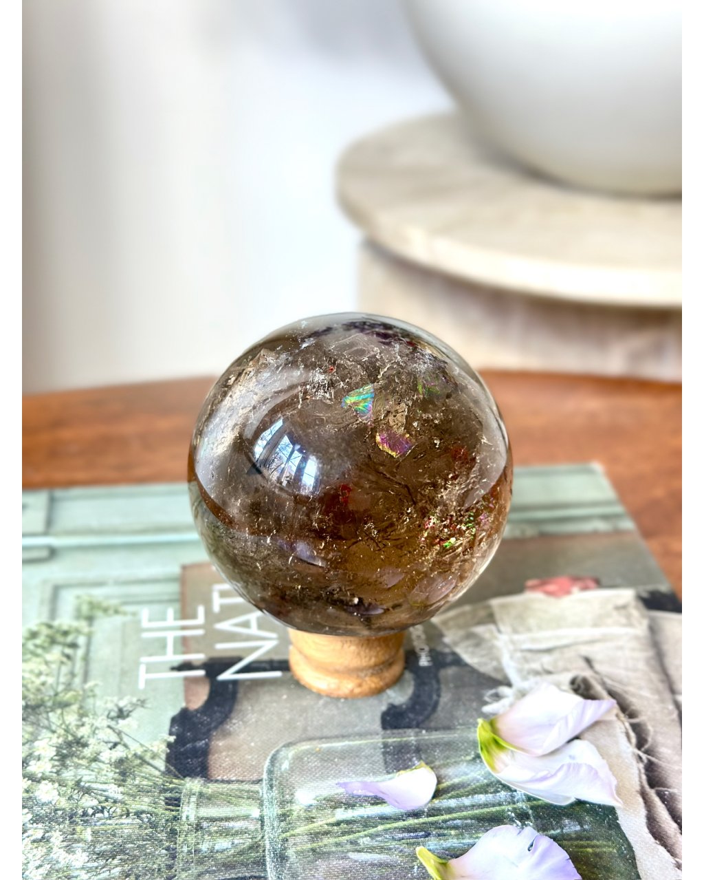 Tato velká koule záhnědy je fascinujícím spojením tmavých, magických barev a průsvitného vnitřního světa. Každý pohled do její hloubky odhaluje jemné struktury, světelné odlesky a tajemné inkluze, které připomínají vesmírné mlhoviny nebo hluboké jeskyně energie. Koule je umístěna na otočném podstavci, takže ji můžete pozorovat ze všech úhlů a nechat její energii volně proudit kolem sebe.