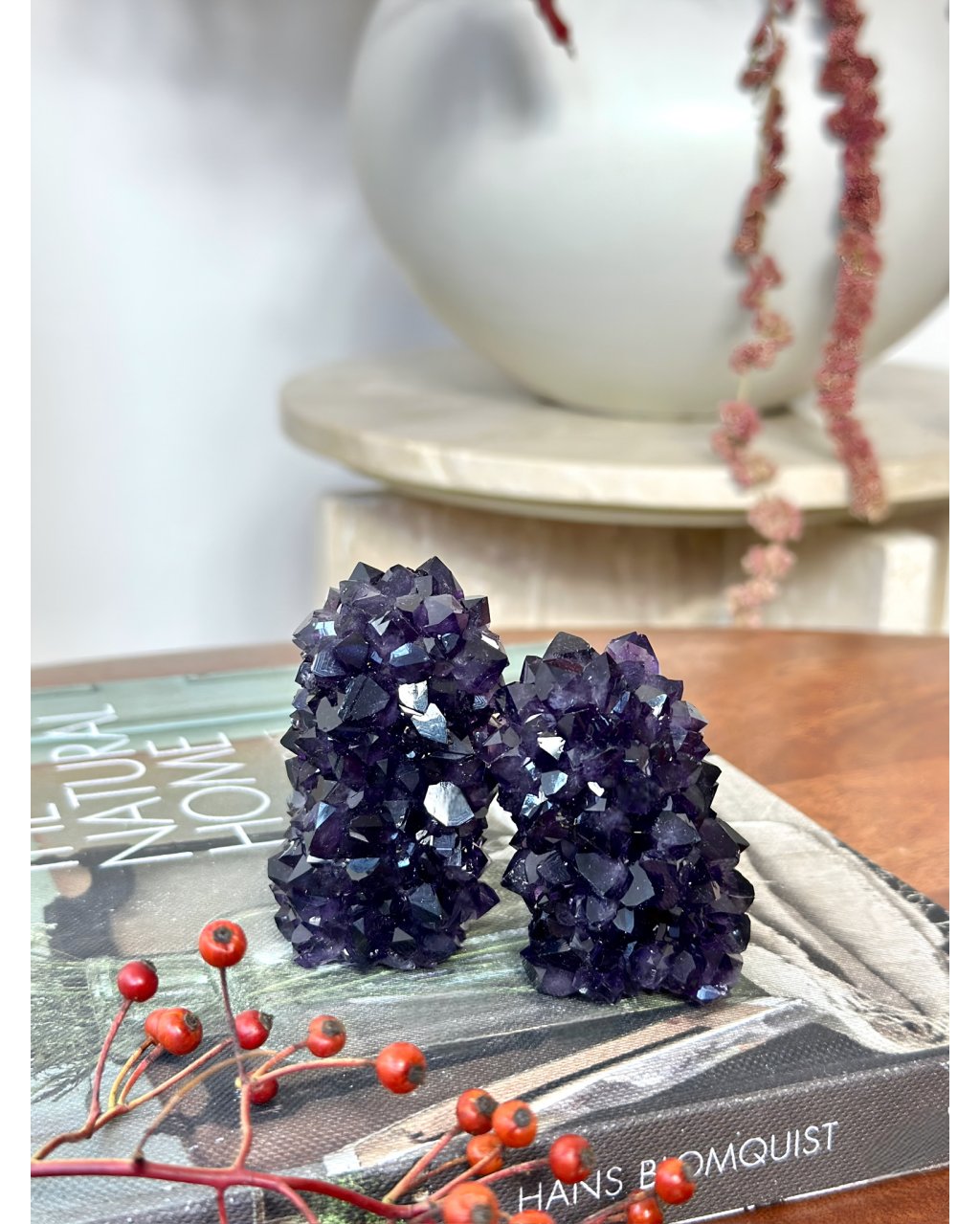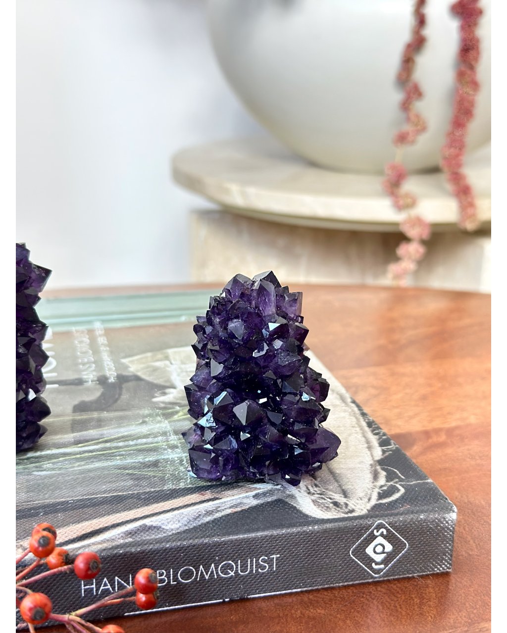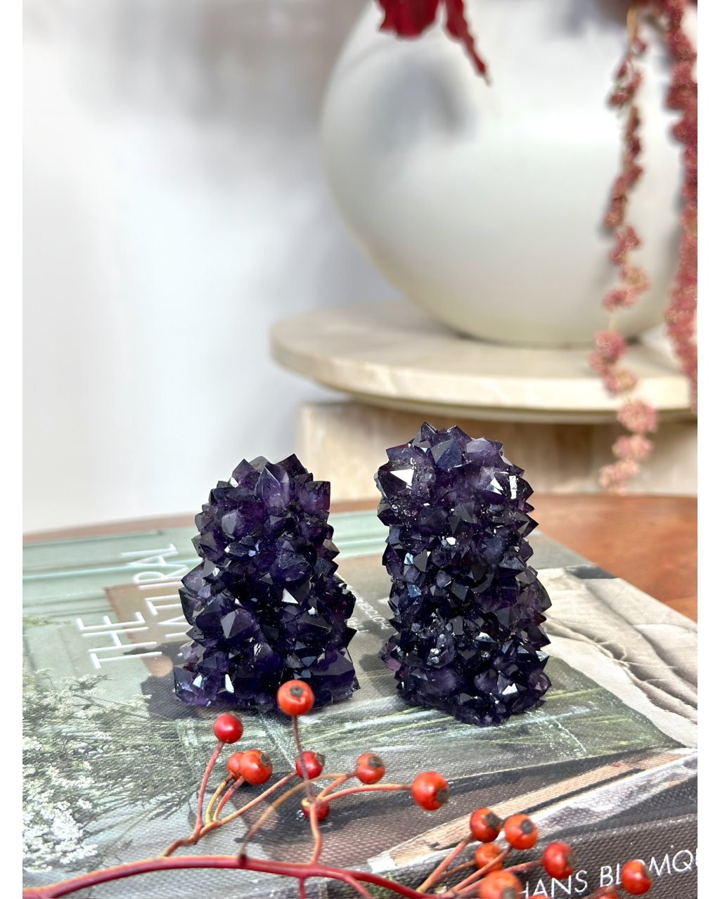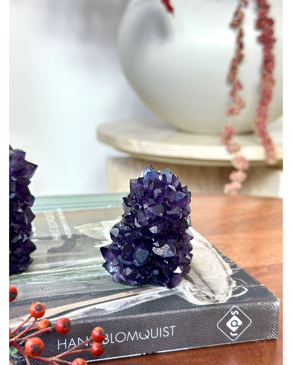 Krápníky z ametystu vznikají uvnitř dutin starých lávových systémů, kde je prostředí dokonale stabilní a chráněné. V těchto jeskynních prostorech se po celé věky odpařovala minerální voda bohatá na oxid křemičitý, železo a stopové prvky. A právě zde, kapku po kapce, krystal po krystalu, začal růst svislý sloup ametystu - podobně jako stalaktity či stalagmity, ale z čistého, vysoce vibrujícího křemene.