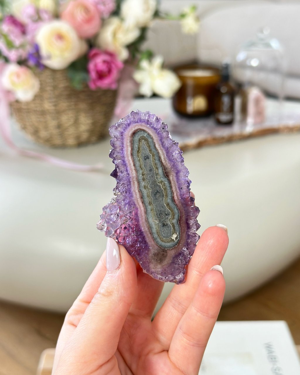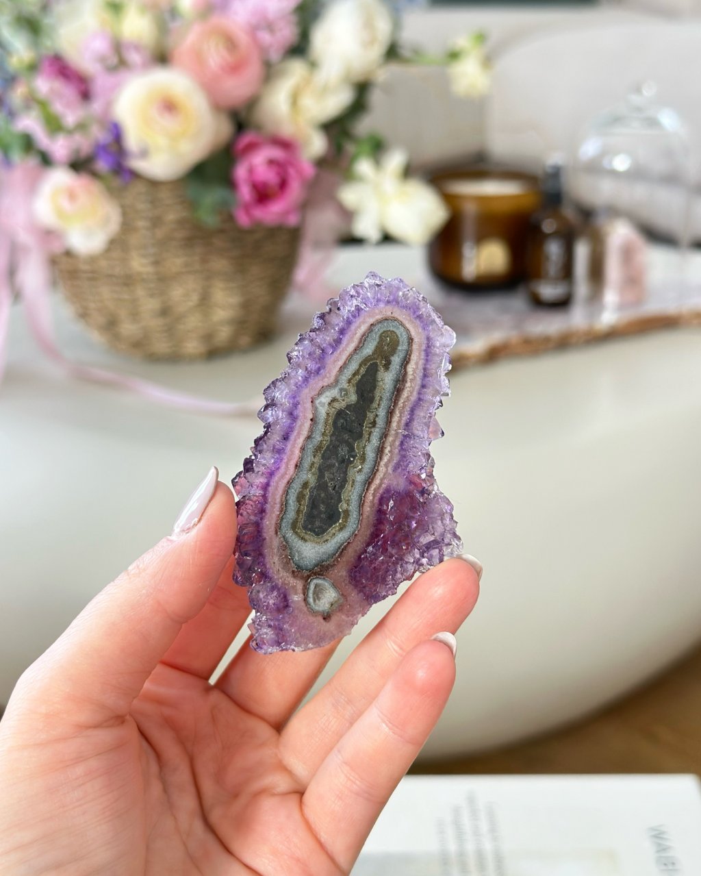 Oboustranně leštěné plátky ametystového stalaktitu jsou spojeny s vnitřním růstem a novými začátky. Jejich nevšední vzhled připomínající květiny si zamilujete.