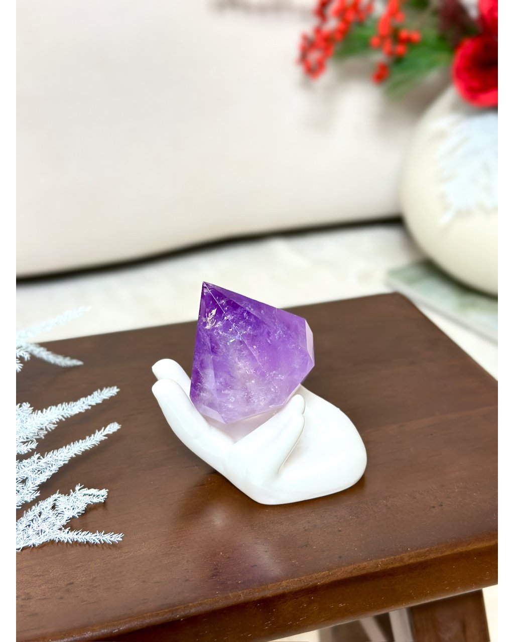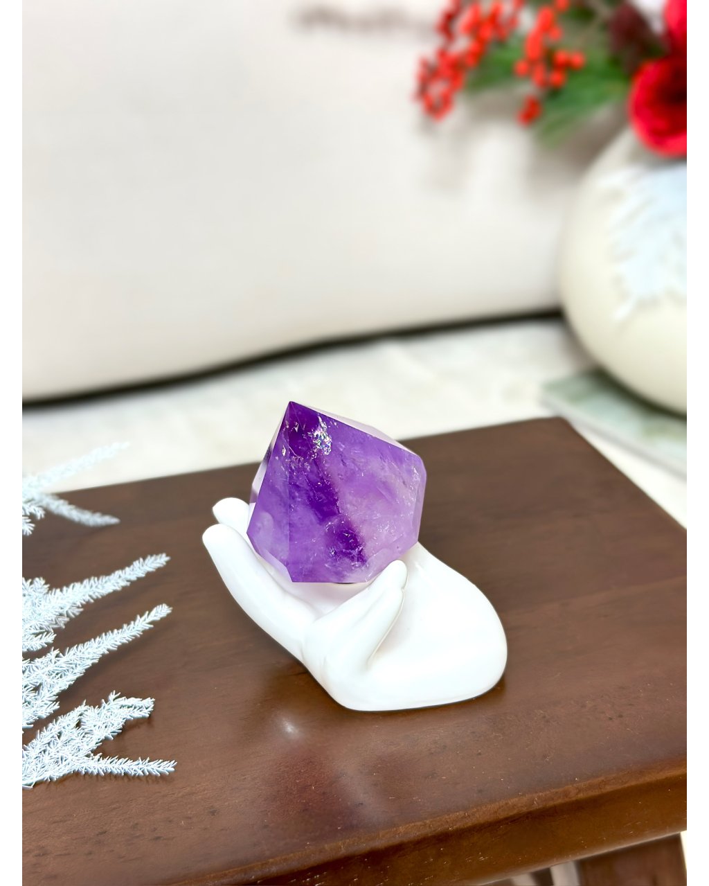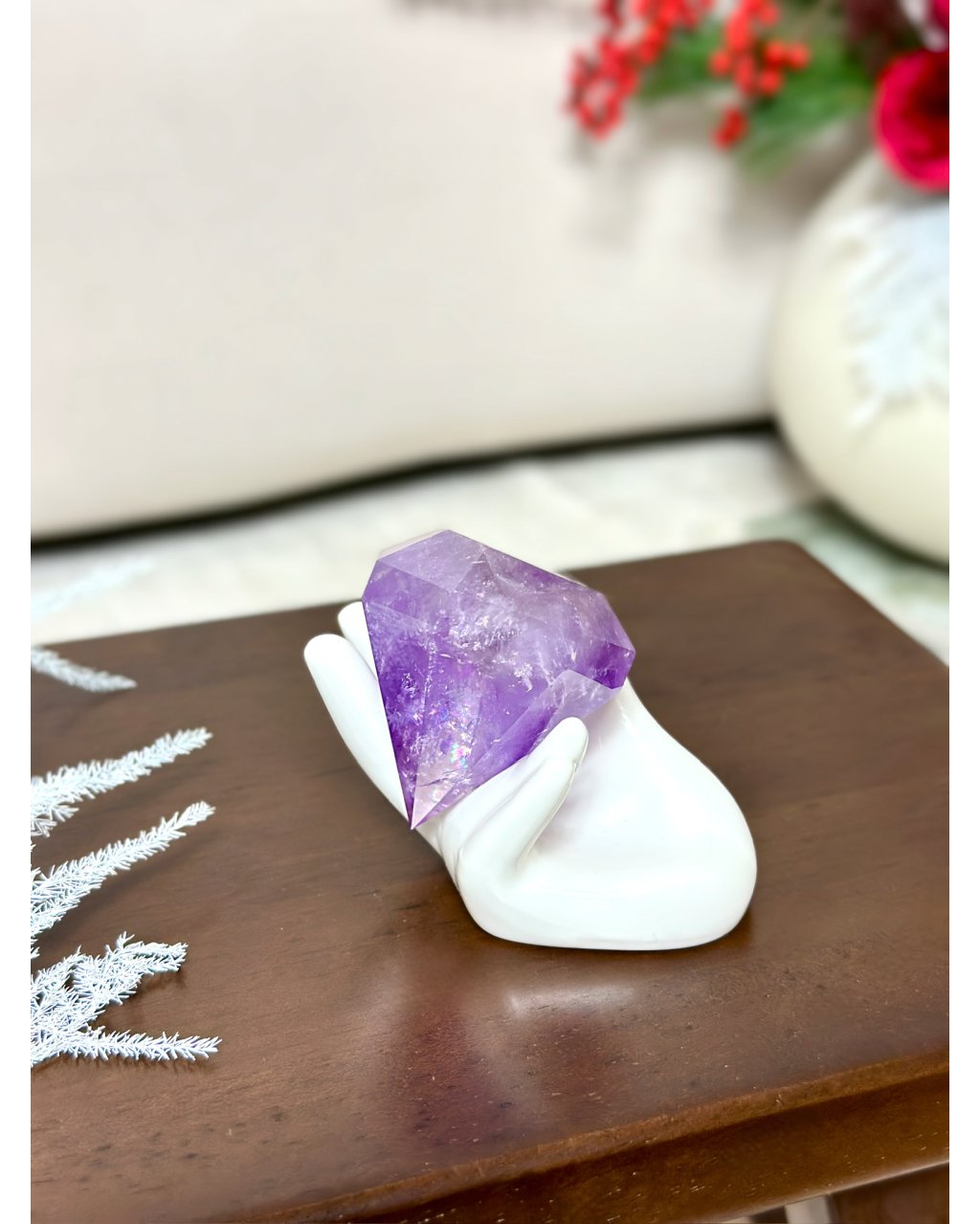 Jako dekorace působí magicky a okamžitě mění atmosféru místnosti. Jako energetický nástroj pomáhá vytvářet bezpečný, klidný a vysoce laděný prostor pro rituály, meditace či odpočinek. Tento ametystový diamant je spojením krásy, moudrosti a jemné magie, které se dotýká duše pokaždé, když se jeho světlo probudí.