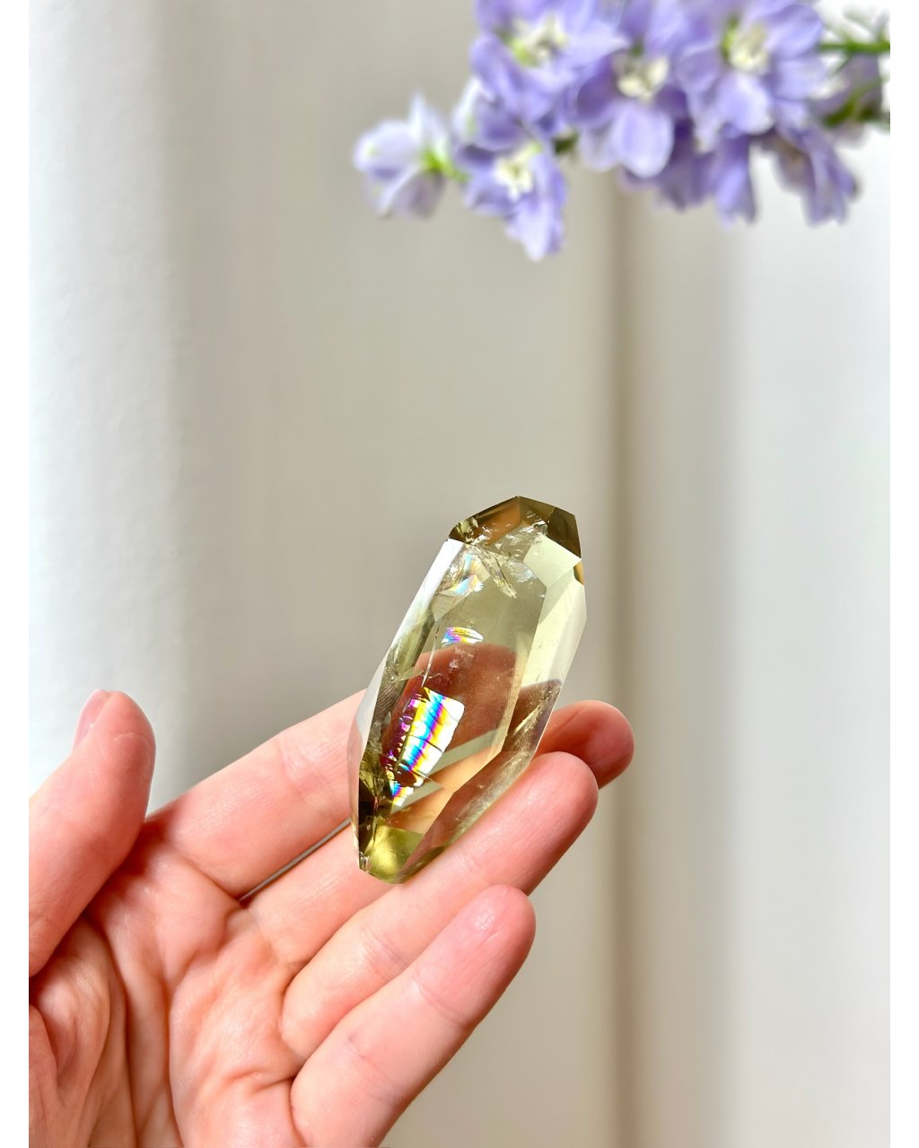 Citrín je kamenem hojnosti, sebedůvěry a vnitřní síly, podporuje optimismus, kreativitu a odvahu jít vlastní cestou. Jeho energie pomáhá uvolňovat strachy, posiluje víru v sebe sama a otevírá cestu k novým příležitostem, a to jak v materiální, tak duchovní rovině. Vnitřní duha zesiluje účinek citrínu jako kamene naděje, přináší lehkost, radost a připomíná, že i po náročných obdobích přichází světlo. Vybroušený freeform citrín je ideální jako silný manifestační krystal.