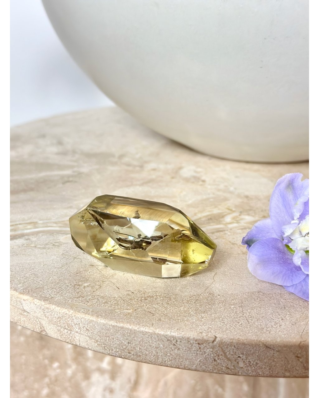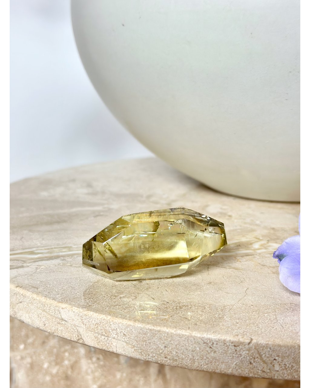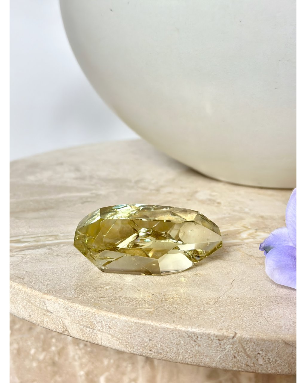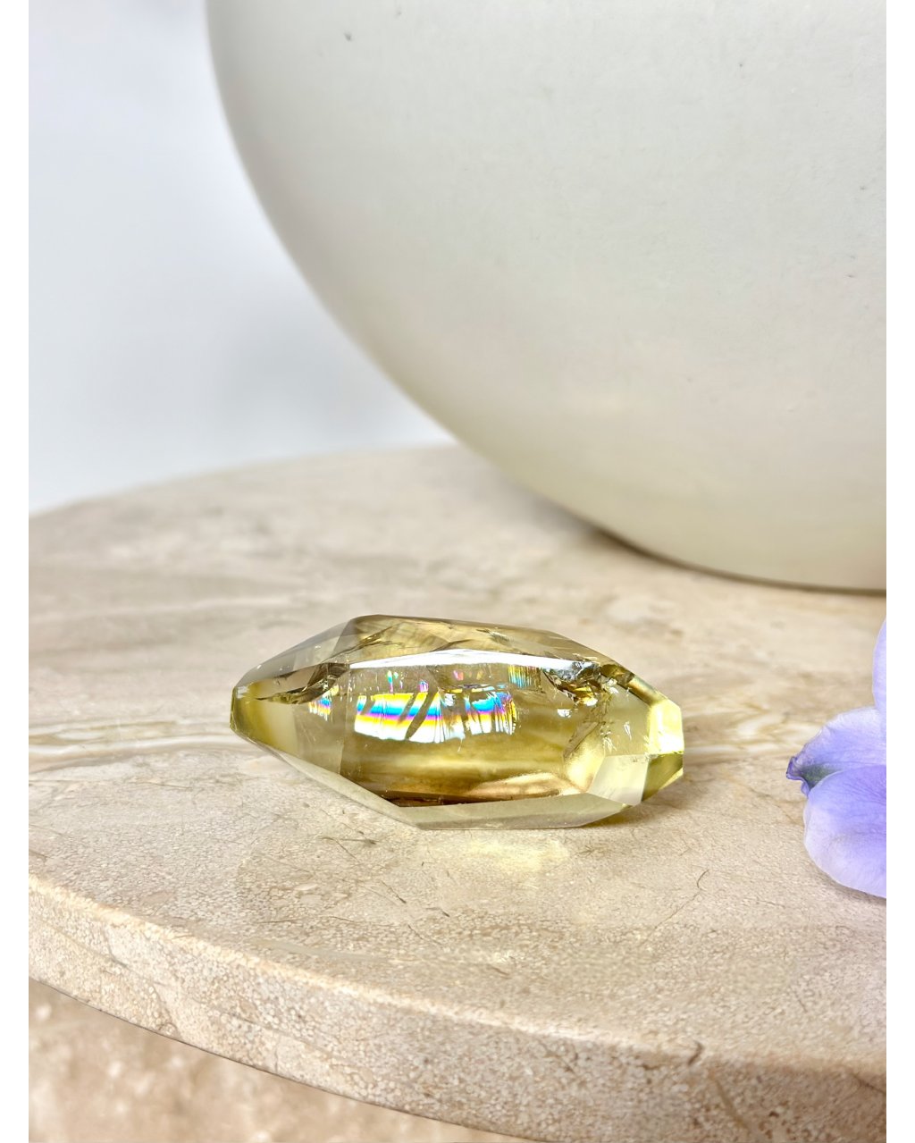 Vybroušený freeform citrín se sametovým vzhledem a dokonale plynulými rysy působí jako zhmotněné slunce ukryté v krystalu. Jeho teplá zlatavá barva vyzařuje světlo, radost a životní energii, zatímco uvnitř kamene se rozehrává velkolepá vnitřní duha naděje, která se při dopadu světla jemně pohybuje a proměňuje. Každý úhel tohoto citrínu odhaluje nový rozměr krásy, čistoty a pozitivní vibrace, jež okamžitě rozjasňuje prostor i mysl.