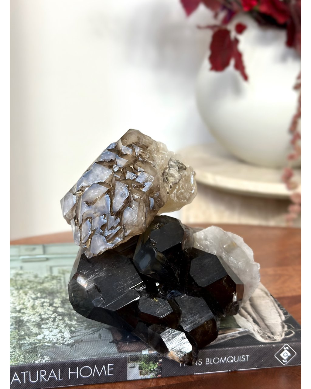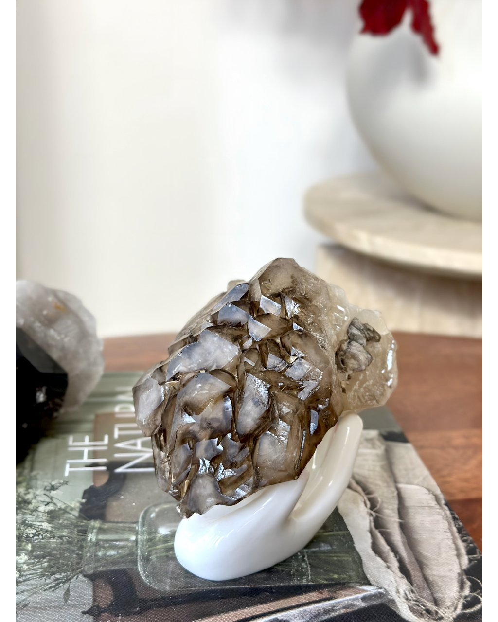 Elestiální záhněda je kamenem hluboké transformace, posvátného poznání a návratu k pradávným kořenům duše. Její mnohovrstevnatá, schodišťovitá struktura jako by v sobě nesla mapu vesmíru i lidského vědomí. Každá ploška odráží jinou úroveň bytí, každý zlom nese příběh o vzestupu ducha. Při prosvícení může v jejích útrobách zazářit drobná kapsle s prastarou vodou - zárodečná kapka života, která v sobě ukrývá otisk prvotní tvořivé síly.