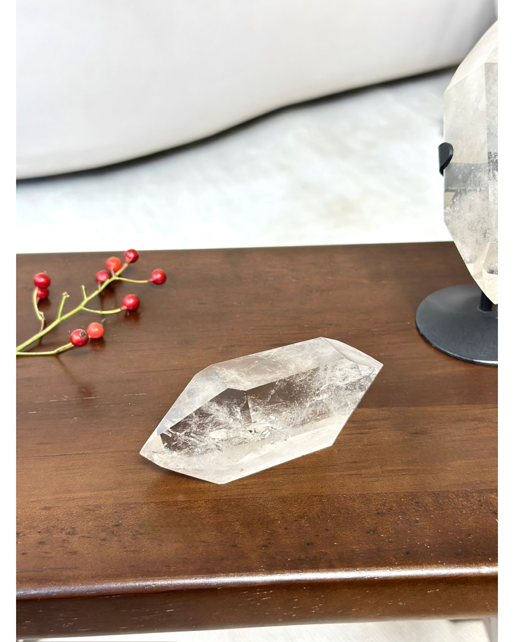 Krystal s oboustranným ukončením, který odpočívá na podstavci, v sobě nese paradox: je v klidu, a přesto je stále v pohybu. Ne fyzicky, ale energeticky jako by v jeho ose probíhal tichý vnitřní dialog mezi světlem a stínem. Záhnedová esence, která v něm jemně prosvítá, nepřidává jen barvu; dodává mu paměť. Paměť míst, kde se čas nehýbe lineárně, ale vrstveně.