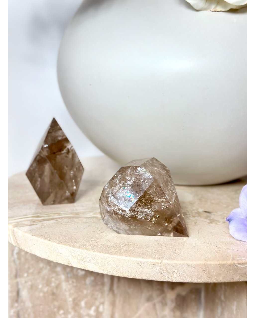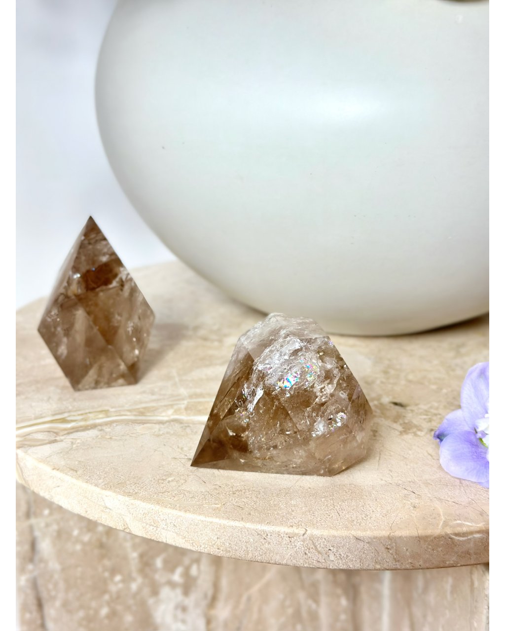 Diamant ze záhnědy plný vnitřní duhy je silným krystalem propojeným s hlubokou, zemitou energií jádra Země. Jeho kouřově hnědé až šedé tóny působí klidně, stabilně a ochranně, zatímco uvnitř kamene se při dopadu světla rozsvěcuje překvapivá duha, jako světelný podpis skrytý v hlubinách zemské hmoty. Tento kontrast temné hloubky a zářivého vnitřního světla vytváří dojem prastaré moudrosti a tiché síly, která zde byla dávno před námi.