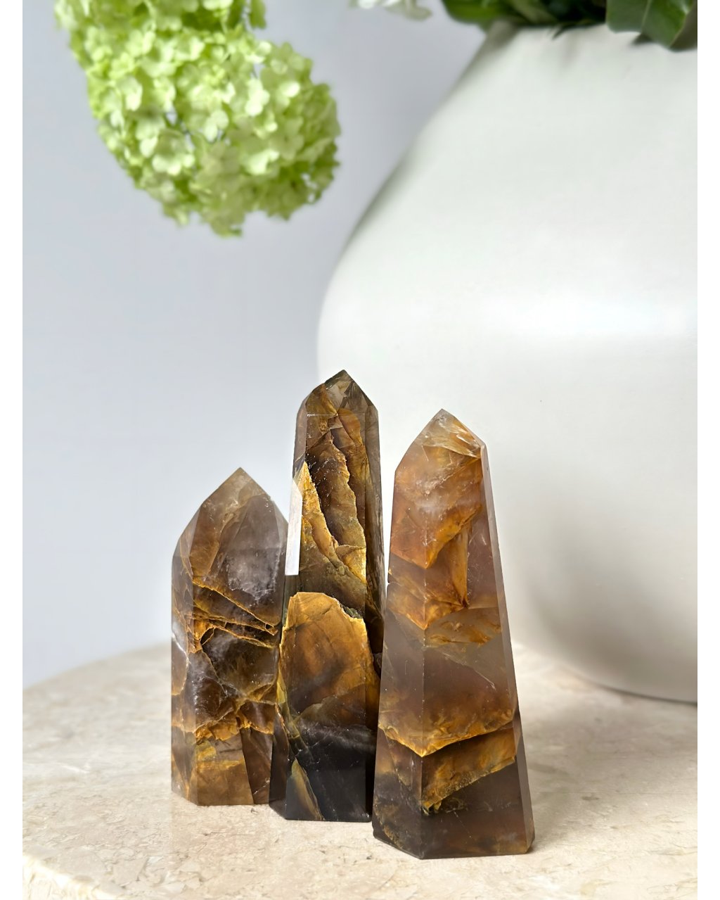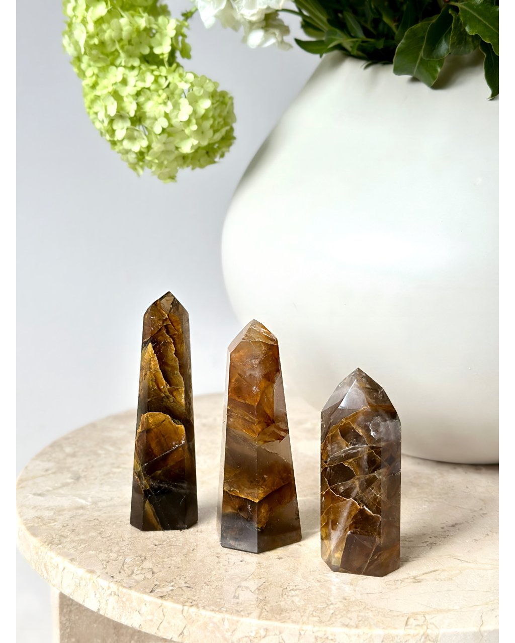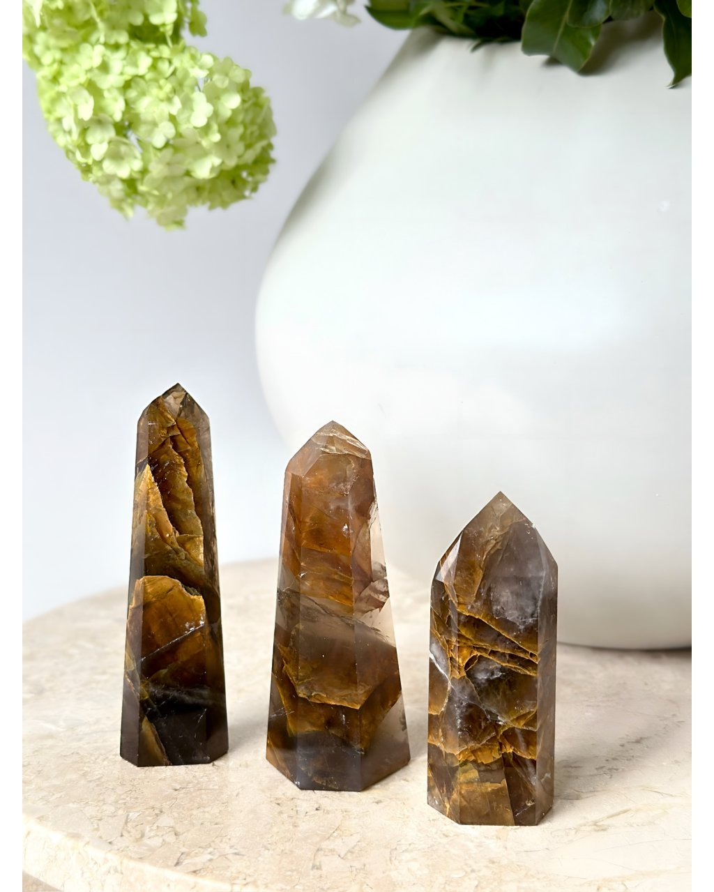 Tmavý Zlatý Léčitel je výjimečný krystal, který pochází z novějších, omezených nálezů v místech se silnou geologickou energií. Oproti běžnému Zlatému Léčiteli má tmavší, hlubší odstín, což svědčí o vysoké koncentraci minerálních inkluzí, které zesilují jeho energetické vlastnosti.