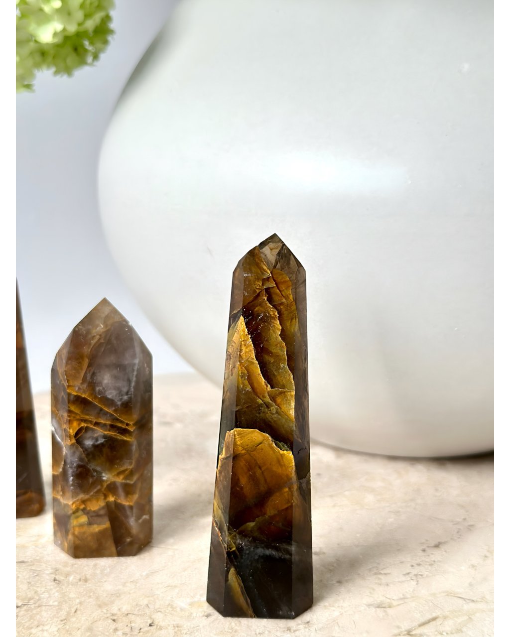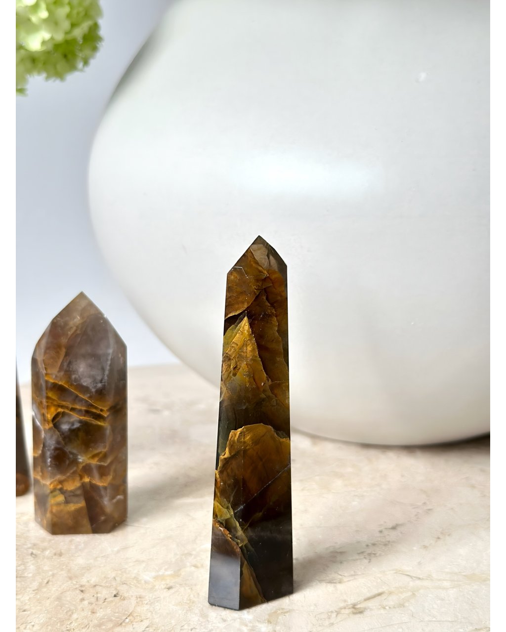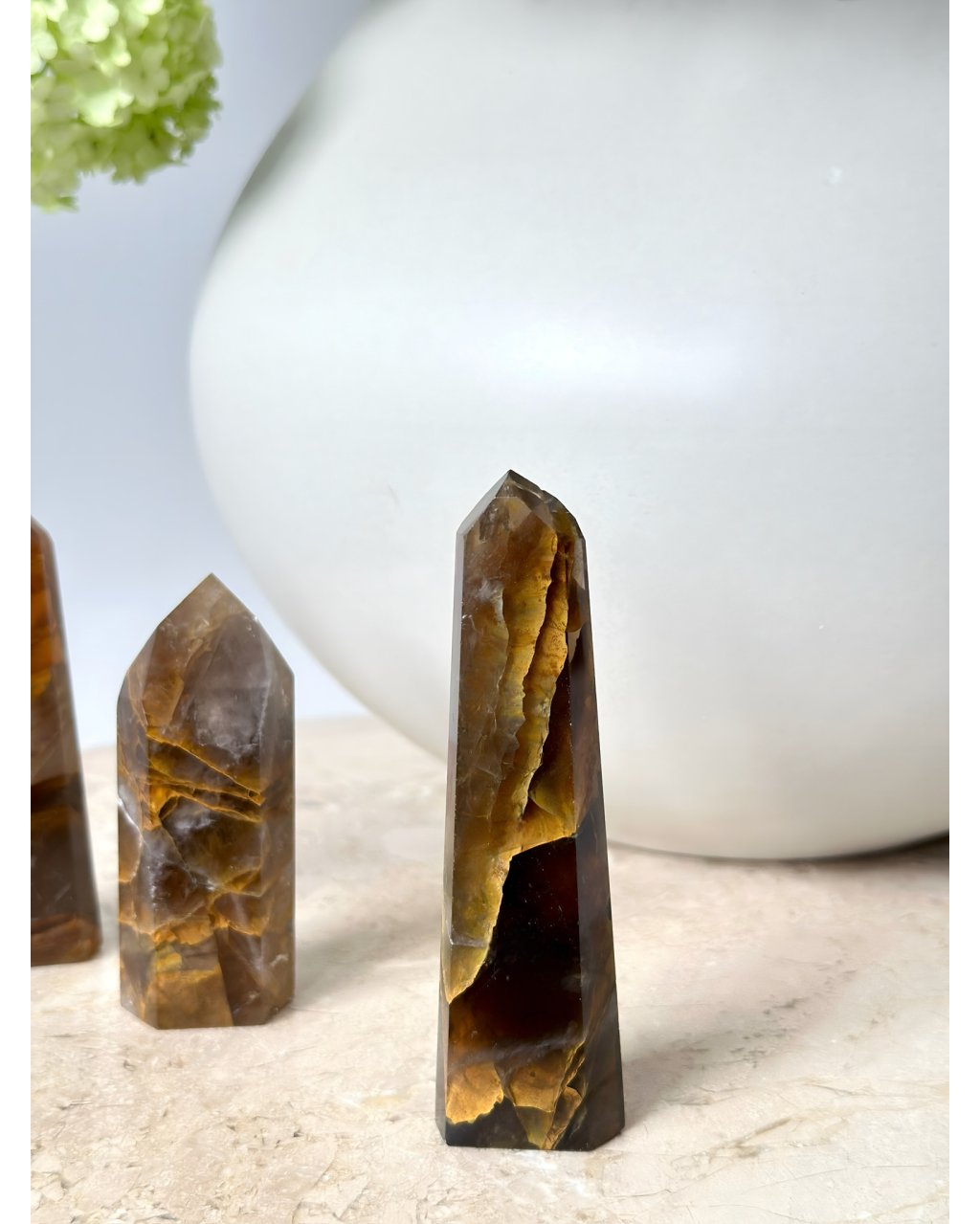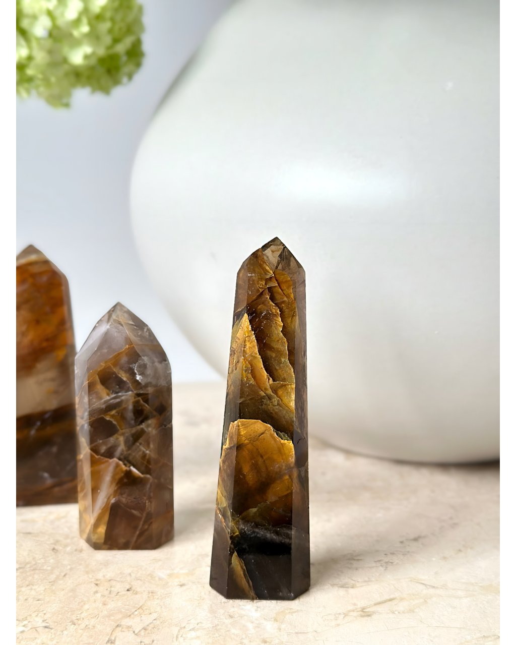Tmavý Zlatý Léčitel je výjimečný krystal, který pochází z novějších, omezených nálezů v místech se silnou geologickou energií. Oproti běžnému Zlatému Léčiteli má tmavší, hlubší odstín, což svědčí o vysoké koncentraci minerálních inkluzí, které zesilují jeho energetické vlastnosti.