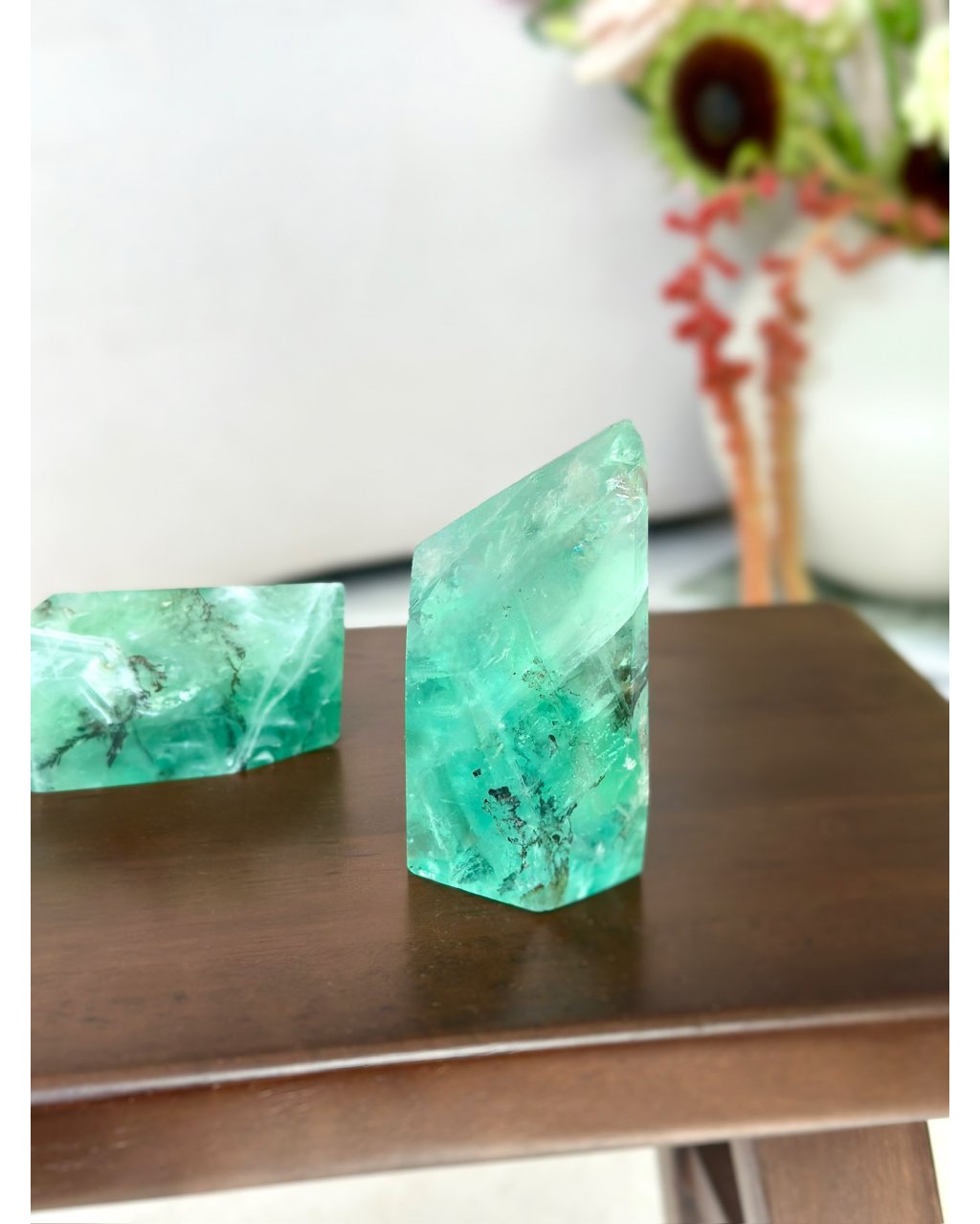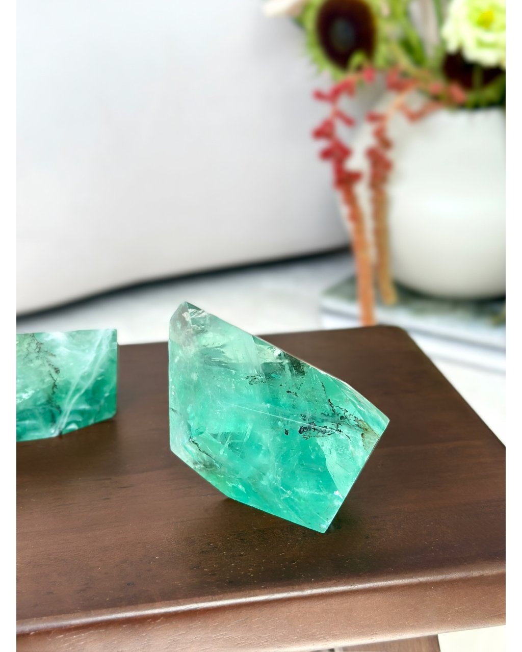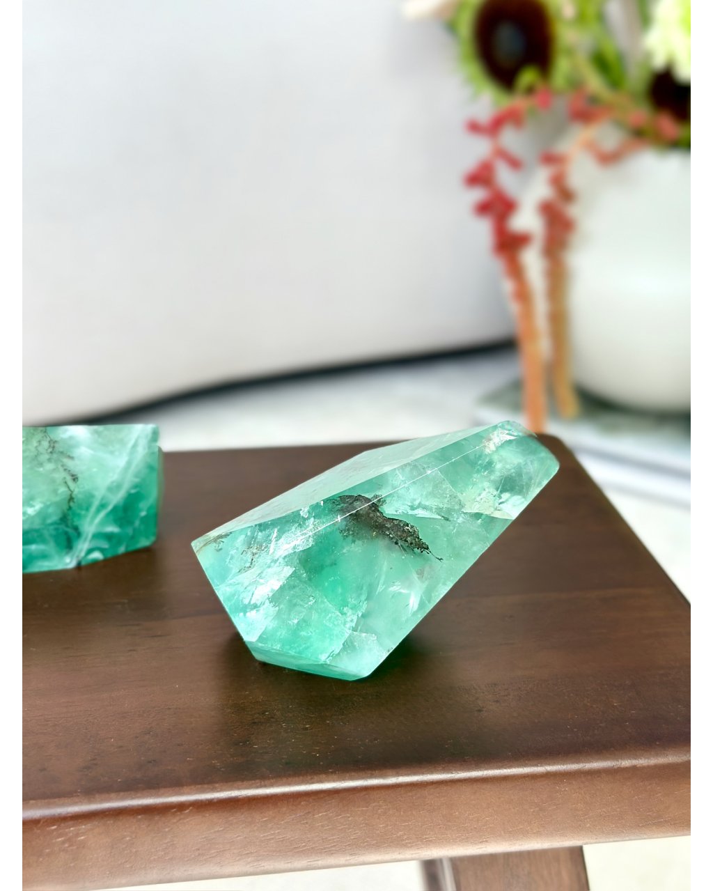 Tento fluorit je pečlivě broušen a leštěn tak, aby každá plocha odrážela maximum světla a odhalovala dendritové struktury uvnitř. Jeho průhledné i mírně zabarvené části vytvářejí fascinující hru světla, která působí vizuálně i energeticky. Dendrit v krystalu připomíná jemné mapy nebo proudy energie, které živě reagují na světlo a prostor kolem něj.
