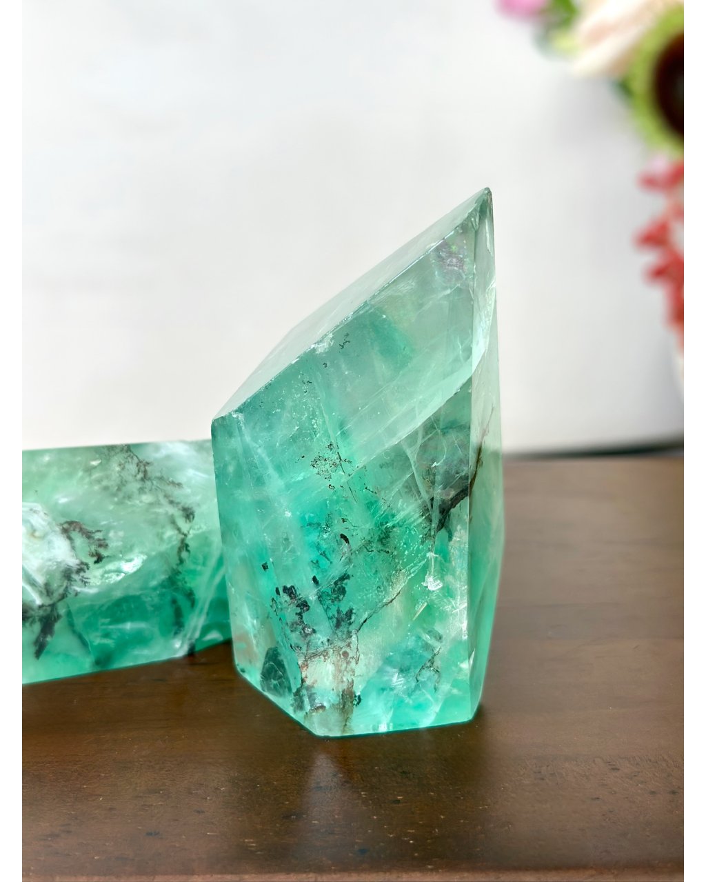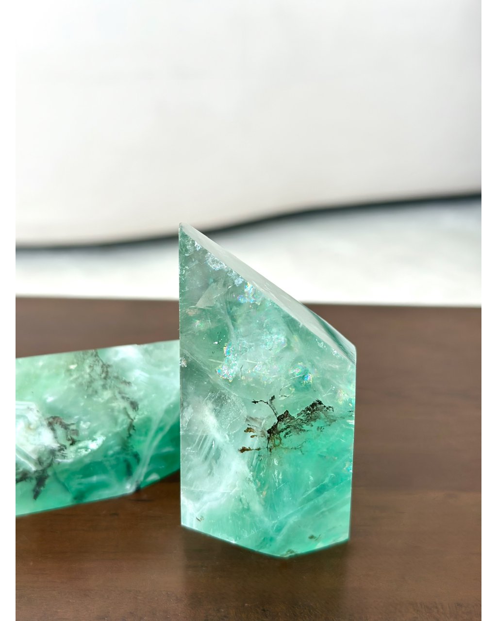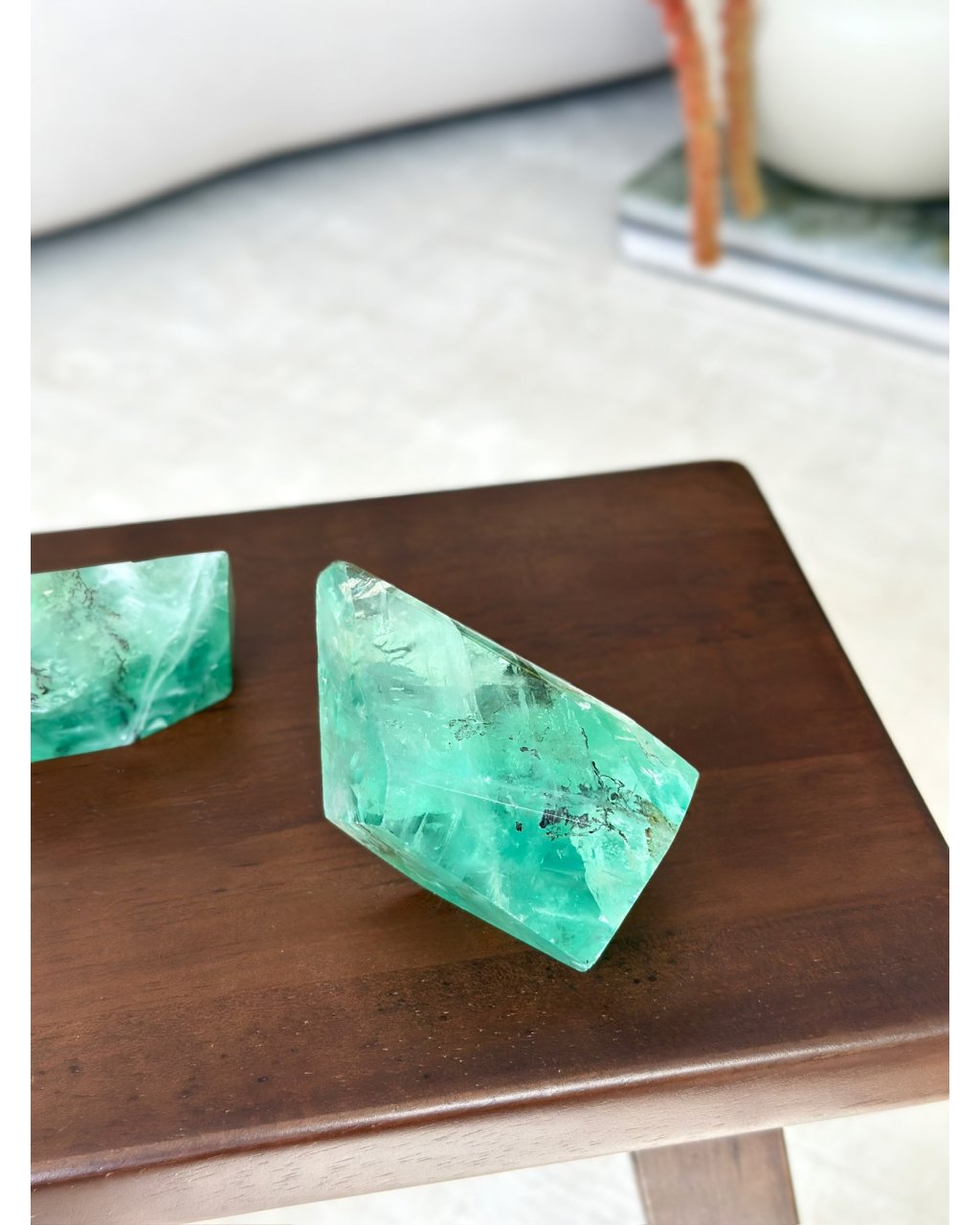 Tento fluorit je pečlivě broušen a leštěn tak, aby každá plocha odrážela maximum světla a odhalovala dendritové struktury uvnitř. Jeho průhledné i mírně zabarvené části vytvářejí fascinující hru světla, která působí vizuálně i energeticky. Dendrit v krystalu připomíná jemné mapy nebo proudy energie, které živě reagují na světlo a prostor kolem něj.