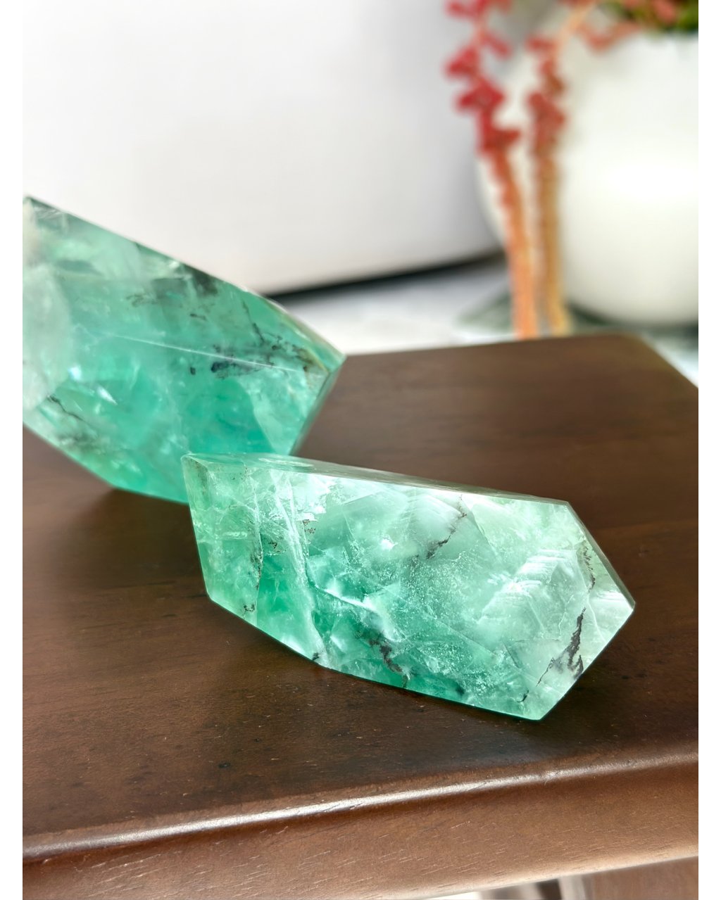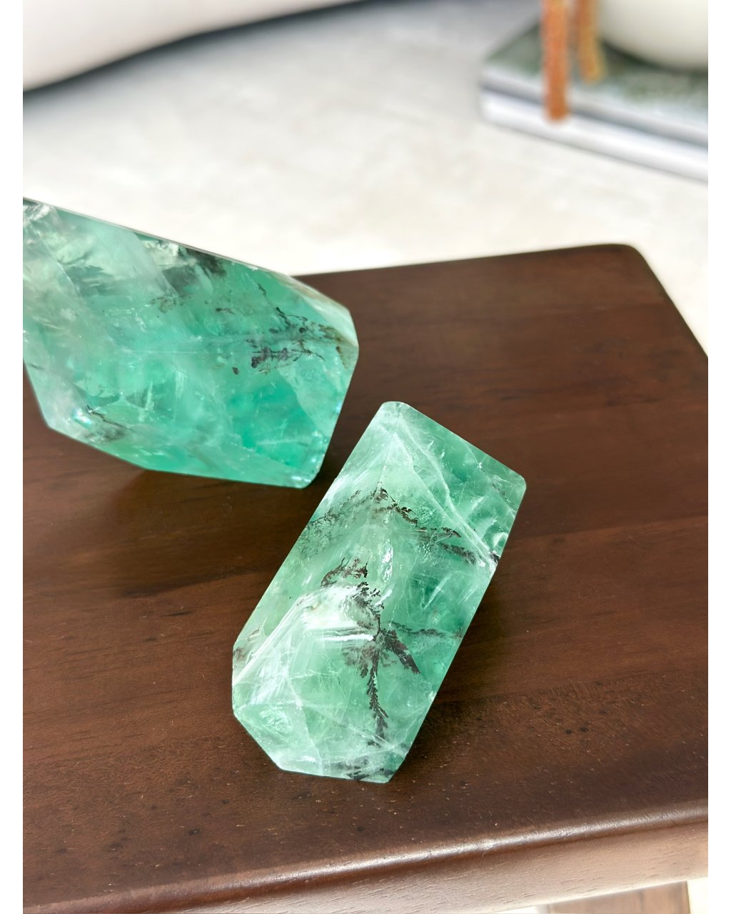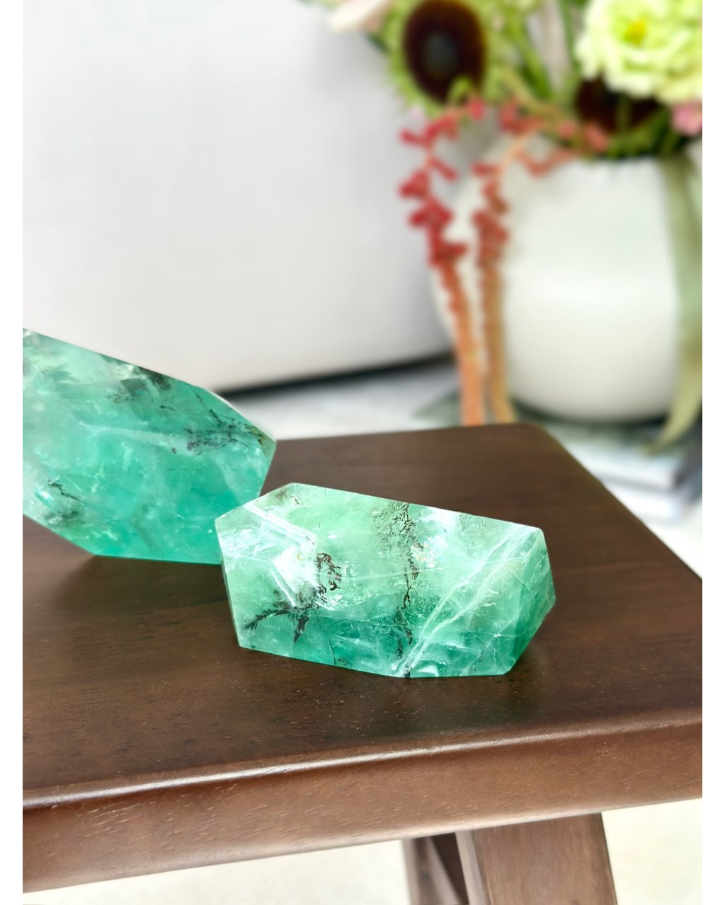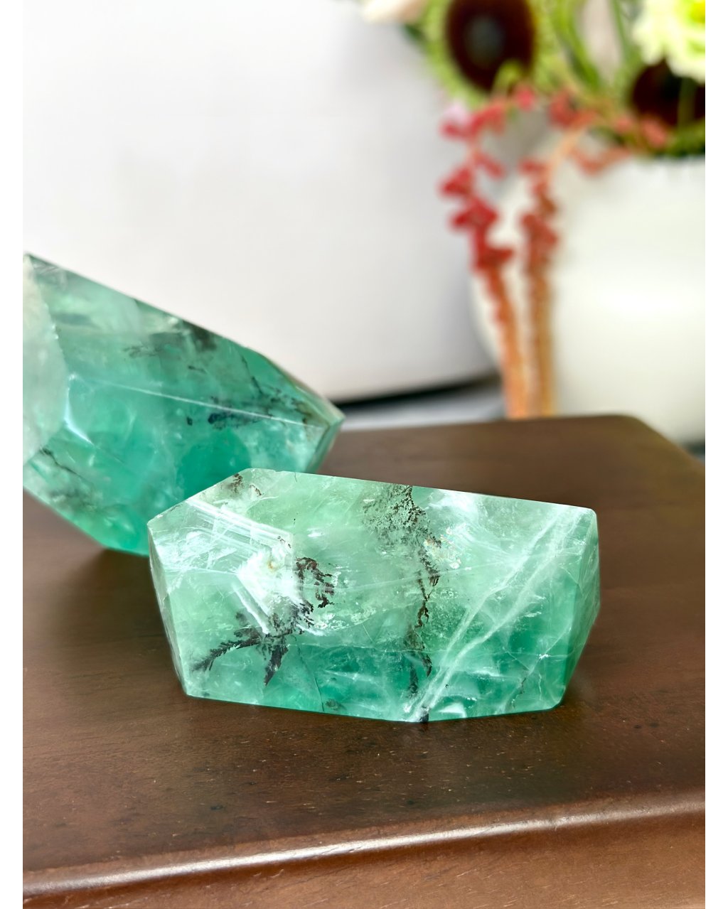 Tento fluorit je pečlivě broušen a leštěn tak, aby každá plocha odrážela maximum světla a odhalovala dendritové struktury uvnitř. Jeho průhledné i mírně zabarvené části vytvářejí fascinující hru světla, která působí vizuálně i energeticky. Dendrit v krystalu připomíná jemné mapy nebo proudy energie, které živě reagují na světlo a prostor kolem něj.