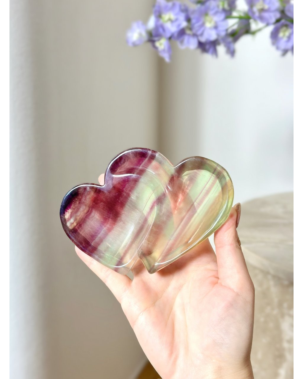 Fluoritová mistička ve tvaru dvojitého srdce je jemným, mystickým symbolem propojení dvou energií, lásky k sobě i k druhým a harmonie mezi srdcem a myslí. Její úžasná barevnost v odstínech červené, zelené a béžové vytváří hluboký, magický vizuální efekt, který se mění s dopadem světla a odhaluje vnitřní kresbu krystalu. Hladký, pečlivě vybroušený tvar podtrhuje přirozenou krásu fluoritu a dává vyniknout jeho klidné, ochranné vibraci.