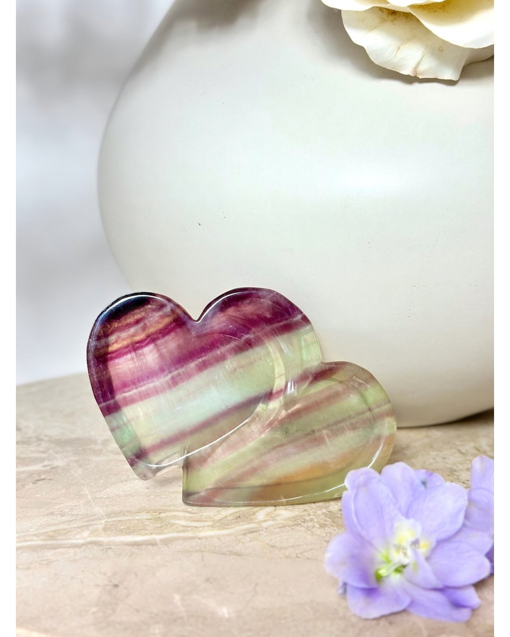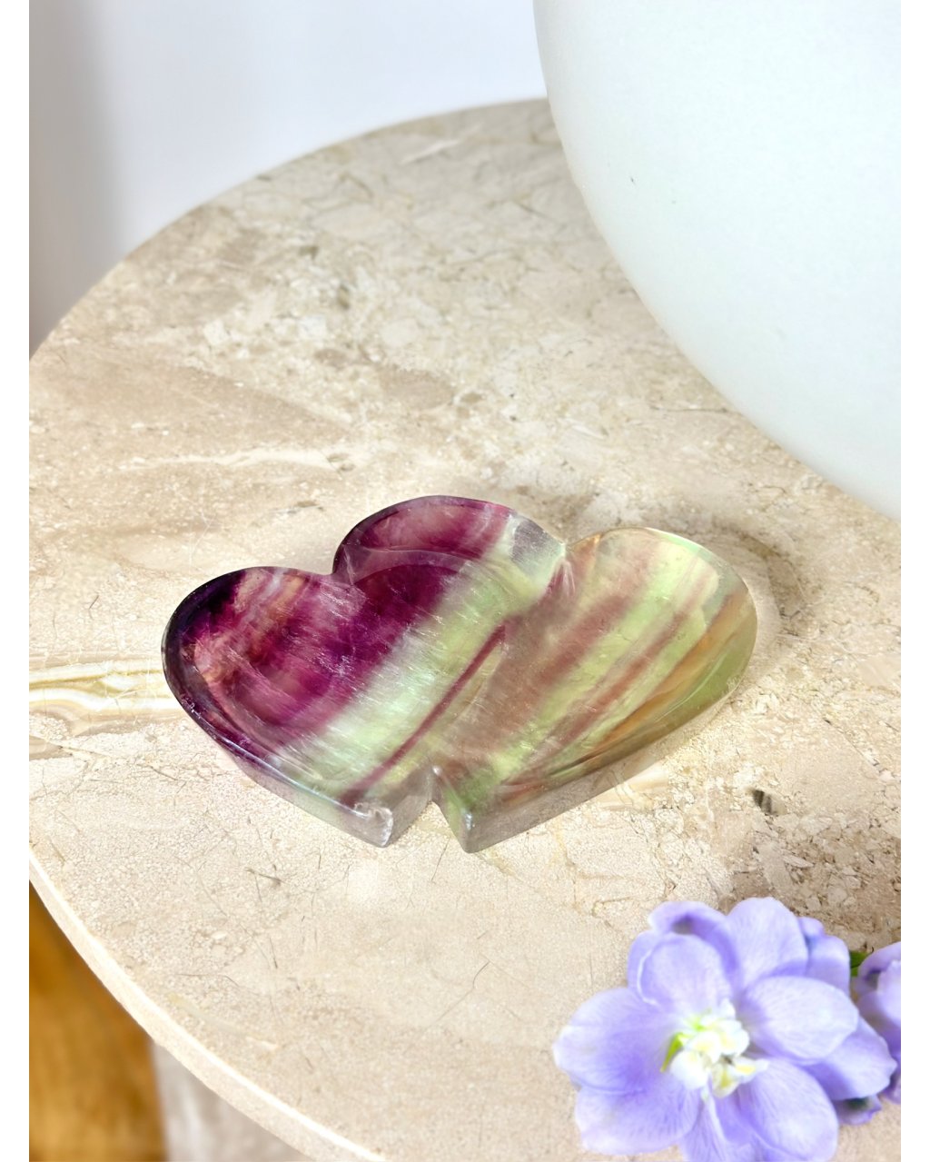 Fluorit je kamenem jasnosti, intuice a mentální rovnováhy, pomáhá uvolňovat chaos v myšlenkách a navracet vnitřní klid. Tvar dvojitého srdce zesiluje jeho působení v oblasti vztahů, sebelásky a energetické harmonie, podporuje otevřenou komunikaci a jemné, láskyplné naladění. Tato fluoritová mistička je ideální pro uchovávání šperků, drobných krystalů či osobních talismanů, které chcete chránit a energeticky čistit, a zároveň se stává výjimečným dekorativním prvkem plným mystiky, světla a rovnováhy.