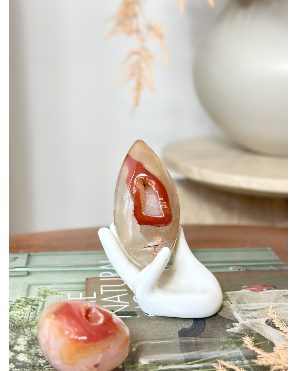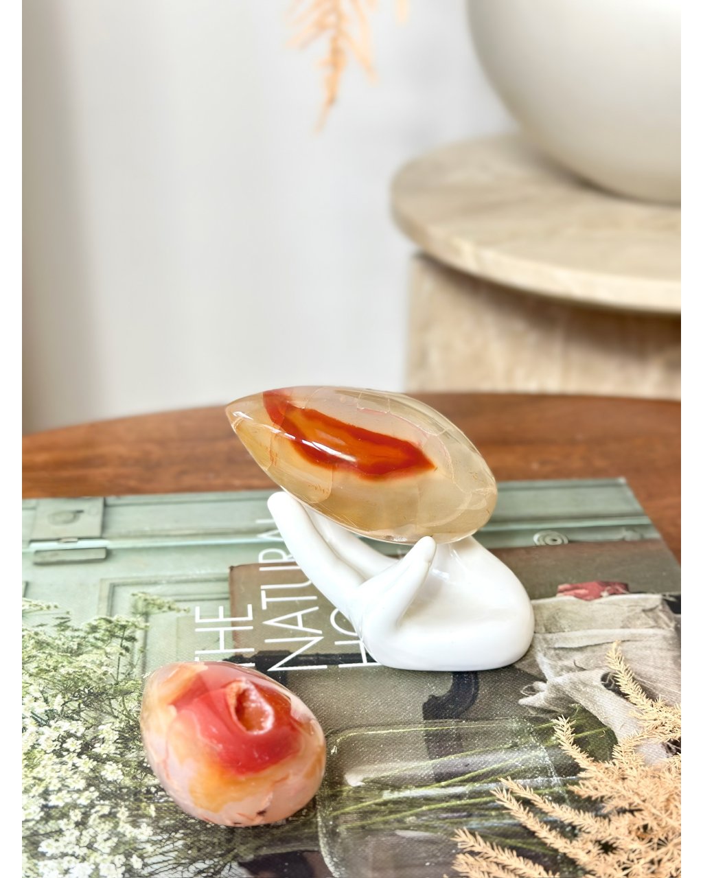 Tento karneol není jen kamenem krásy je to ohnivý společník, který připomíná, že touha, smyslnost a radost ze života jsou přirozené a zasluhují být plně prožívány. Je to malý, blyštivý talisman vášnivé energie, který rozsvítí každý prostor i každé srdce, které ho drží.