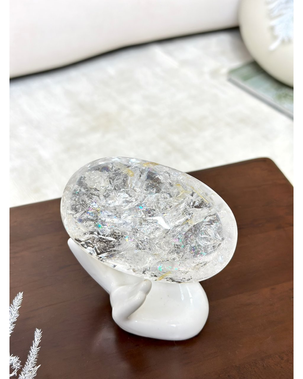 Ručně broušený křišťál v sobě nese energii, která nepůsobí jen vizuálně, je to světlo, které se dotýká hlubších vrstev vědomí. V jeho jádru se rodí jemná duha, rozprostřená jako éterické vlákno skrze celé tělo kamene. Nejde o obyčejné optické jevy; je to živá paměť světla, která reaguje na záměr, dotek i přítomnost. Když se světlo dostane dovnitř, křišťál jej mnohonásobně znásobí a promění ho v jemné spektrum, které vibruje jako pulzující energetické pole.