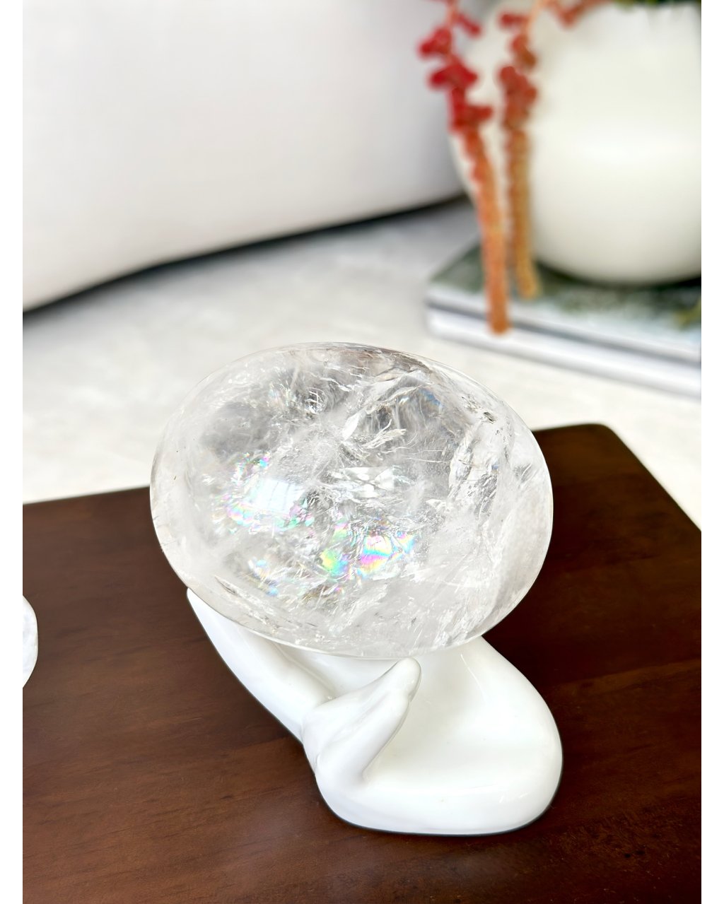 Tento exkluzivní ručně broušený krystal patří k top kvalitě a nese v sobě ohromující vnitřní světlo. Uvnitř každého kusu se skrývá vlastní duhový vesmír, zářící jemnými odlesky a barevnými paprsky, které připomínají malé světy plné tajemství a energie. Každý krystal je jedinečný, a jeho ruční zpracování zdůrazňuje jeho přirozenou strukturu a silné vibrace.