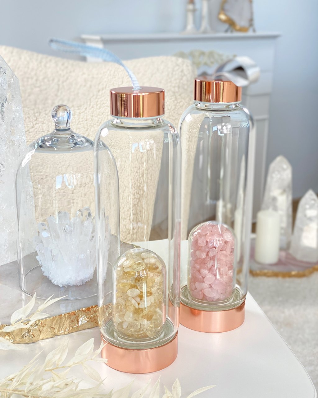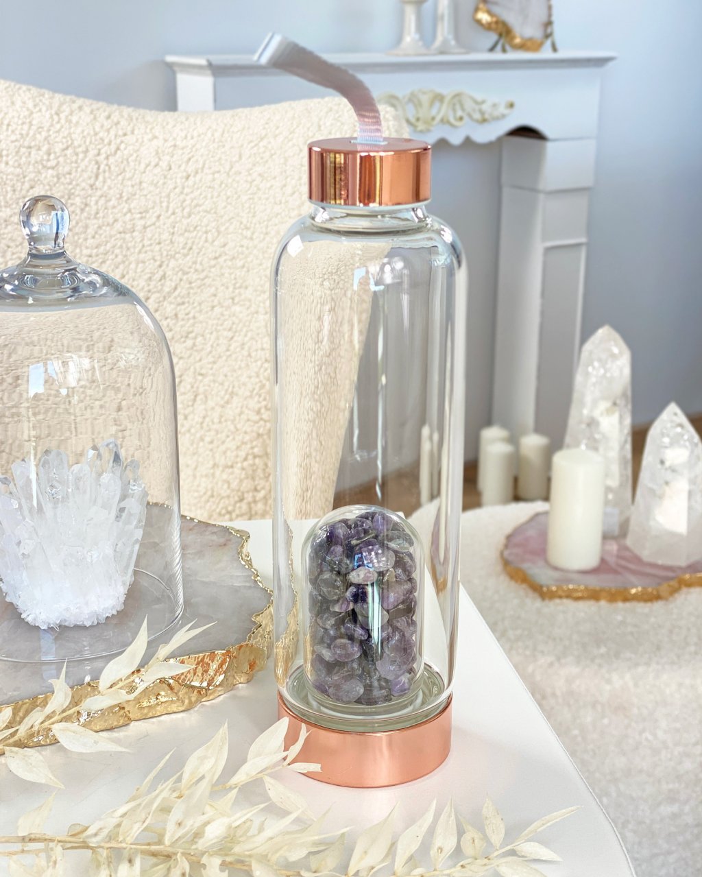 Skleněná láhev s minerály je nejenom skvělým prostředkem pro připomenutí si, jak zásadní roli ve zdravém životním stylu hraje hydratace, ale zároveň dává možnost každému z nás, užitím kohoutkové vody, ulevit planetě Zemi od jednorázových plastů, kterých se pouze v roce 2019 celosvětově prodalo víc než 480 miliard kusů, stejně tak ušetřit 99% oproti ceně balené vody. V dvojitém dnu je tromlovaný ametyst, minerál, který aktivně působí na vodu skrz vibrace, i když se jí fyzicky nedotýká. Již po 30 minutách je z ní detoxikující, tkáně prokrvující elixír.