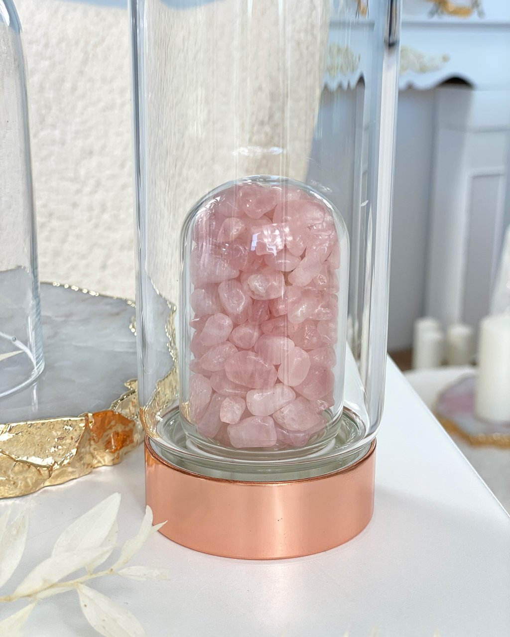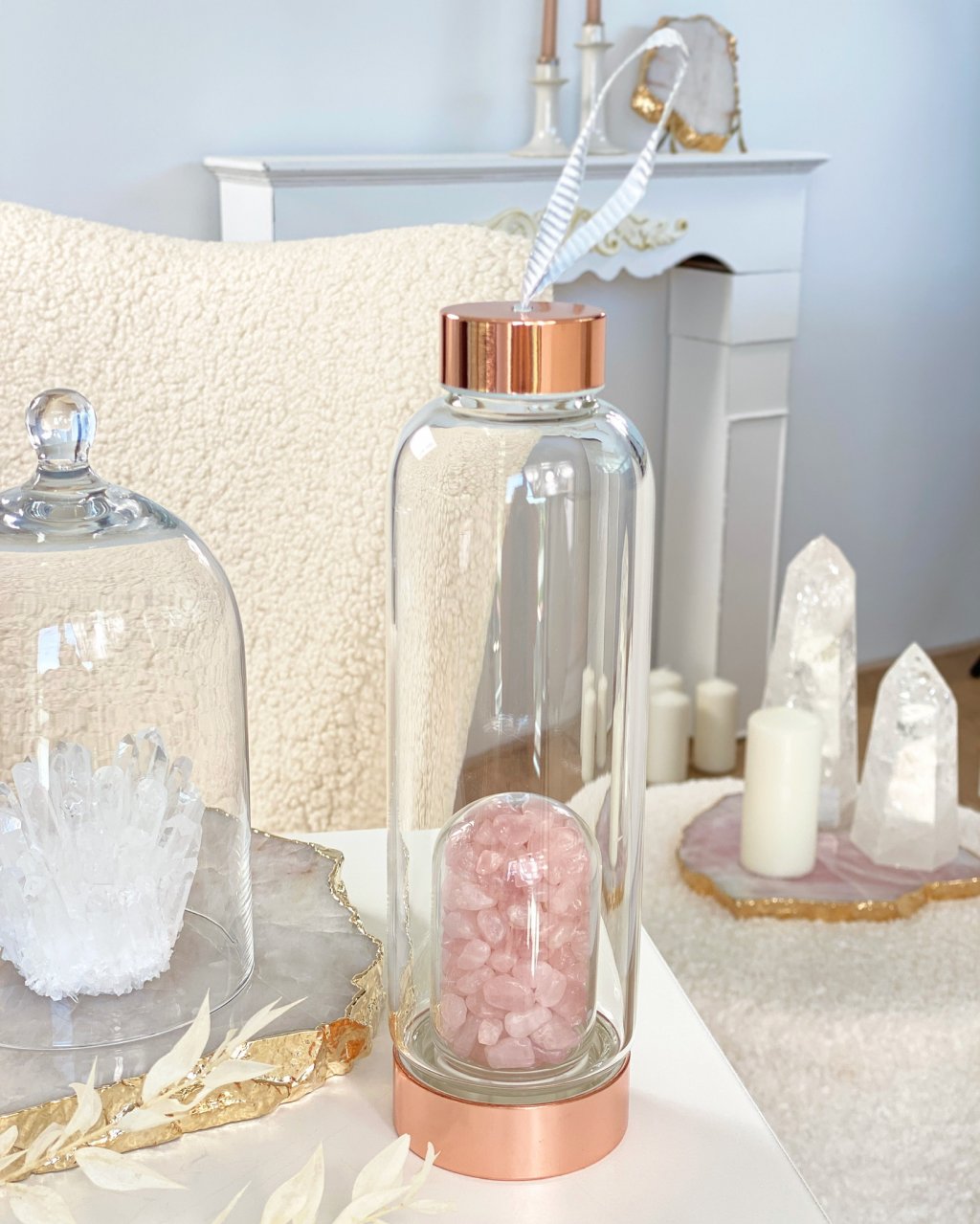 Skleněná láhev s minerály je nejenom skvělým prostředkem pro připomenutí si, jak zásadní roli ve zdravém životním stylu hraje hydratace, ale zároveň dává možnost každému z nás, užitím kohoutkové vody, ulevit planetě Zemi od jednorázových plastů, kterých se pouze v roce 2019 celosvětově prodalo víc než 480 miliard kusů, stejně tak ušetřit 99% oproti ceně balené vody. V dvojitém dnu je tromlovaný ametyst, minerál, který aktivně působí na vodu skrz vibrace, i když se jí fyzicky nedotýká. Již po 30 minutách je z ní detoxikující, tkáně prokrvující elixír.